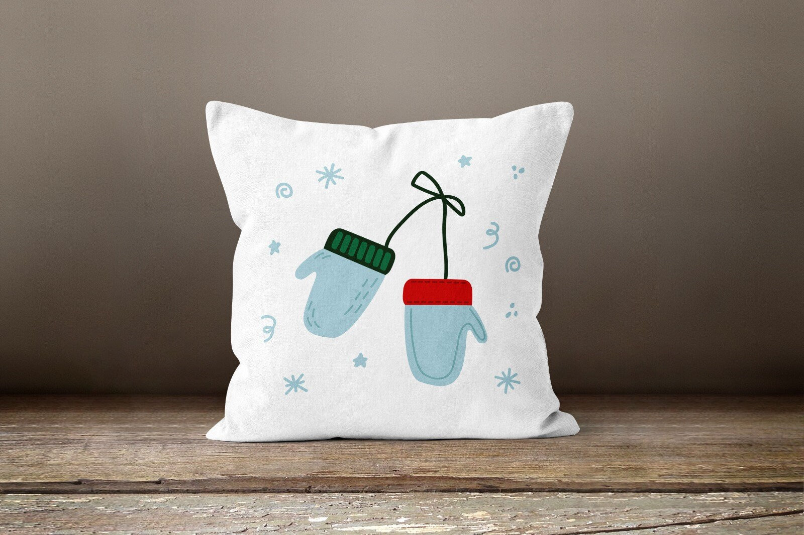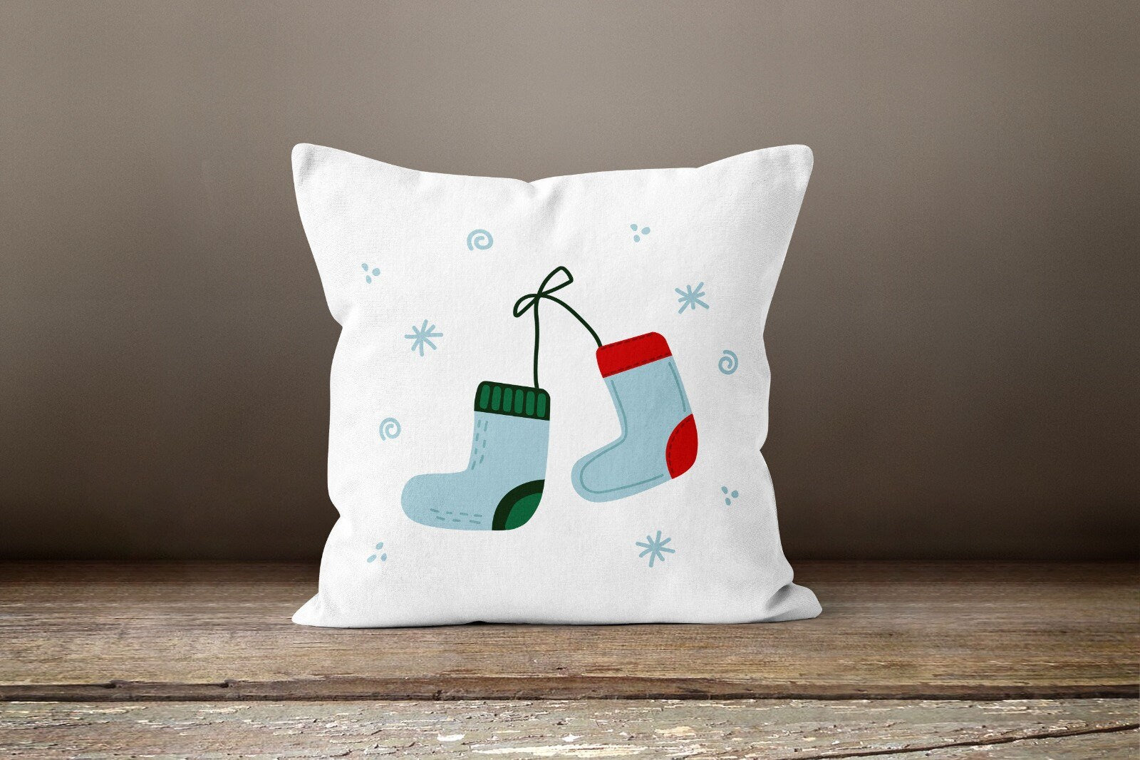 These elegant square decorative rustic farmhouse throw cushion covers with Xmas socks and gloves, Xmas stockings;