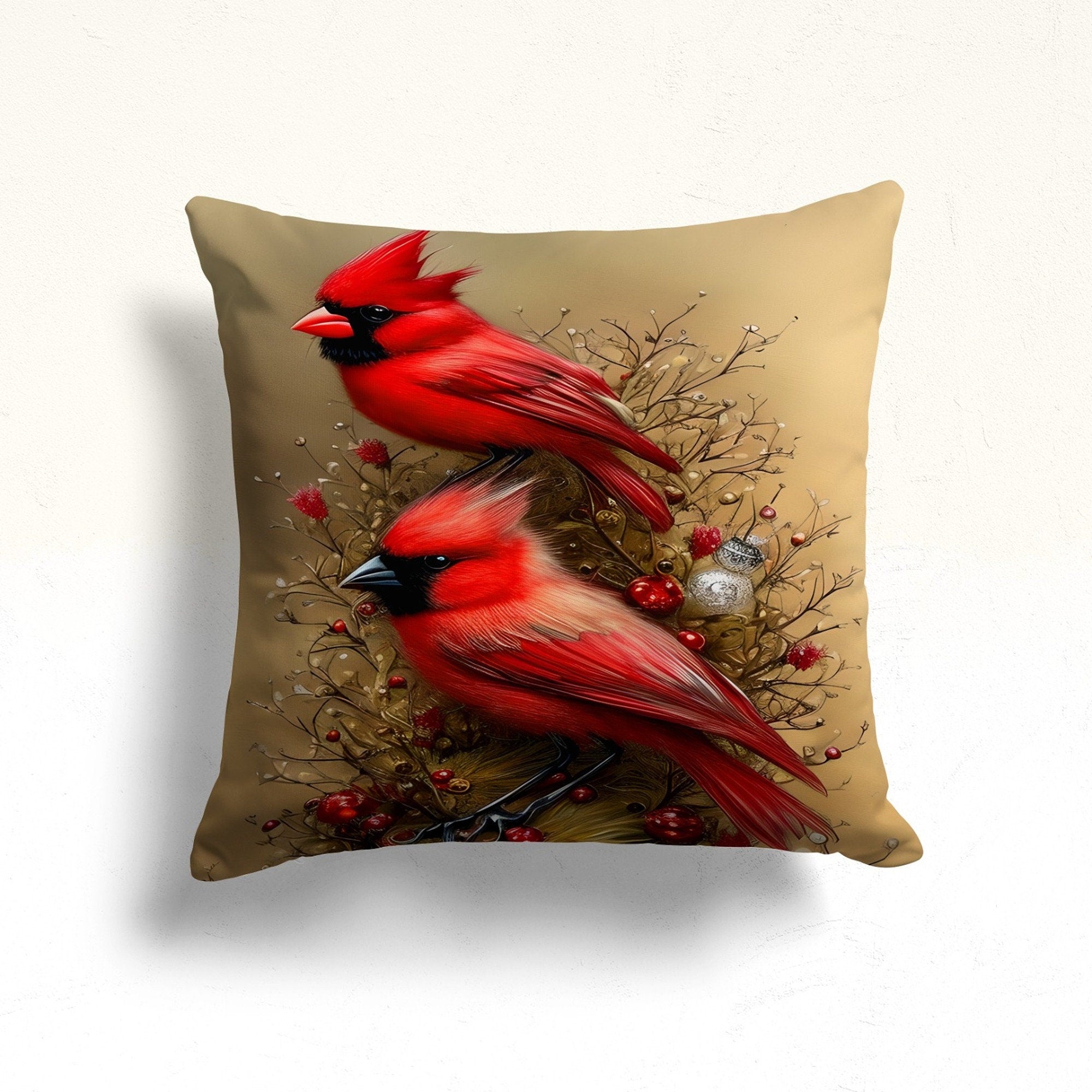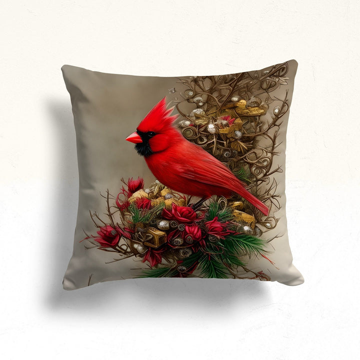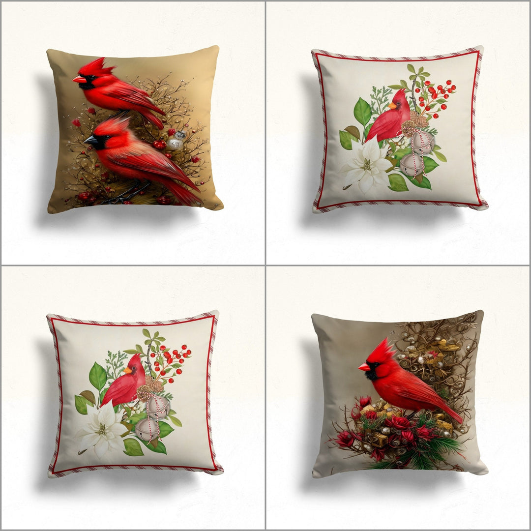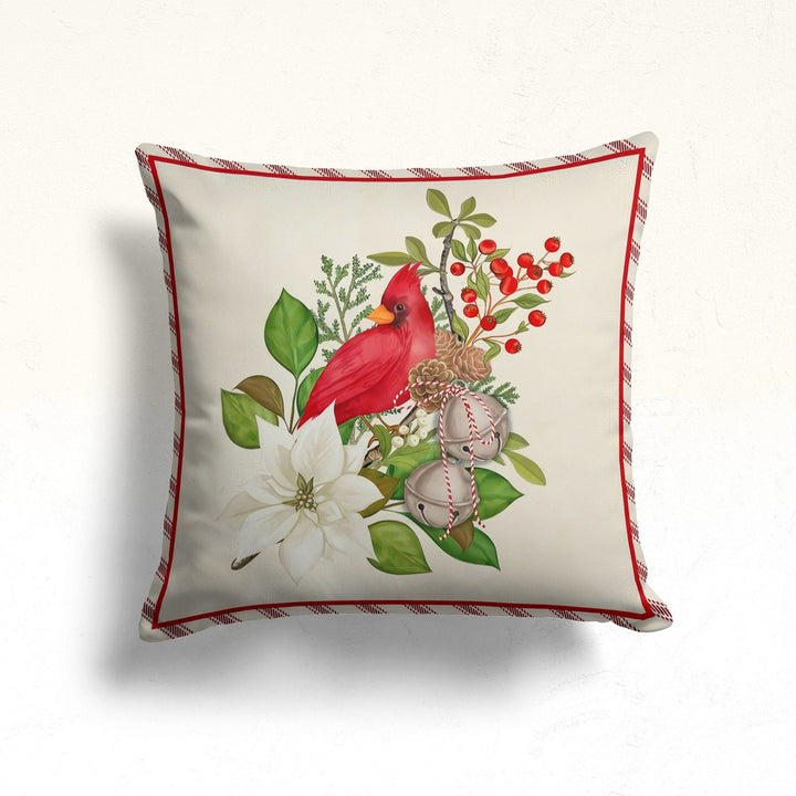 These elegant square decorative throw pillow covers with red cardinal bird, white poinsettia, red berry print;