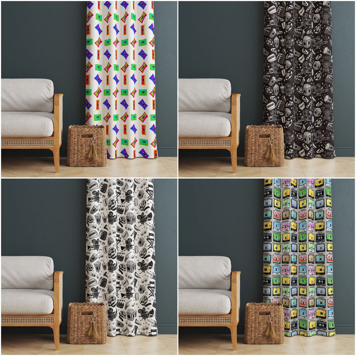 This high quality, abstract design window curtain with Cinema Theme, cassette, popcorn prints;