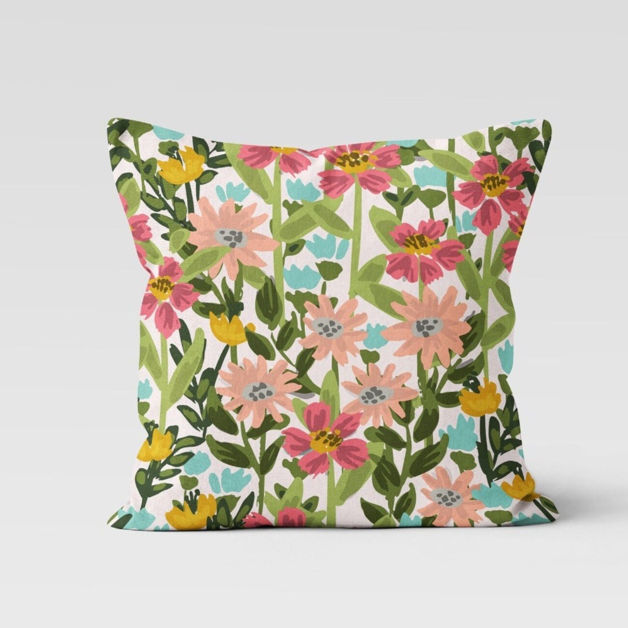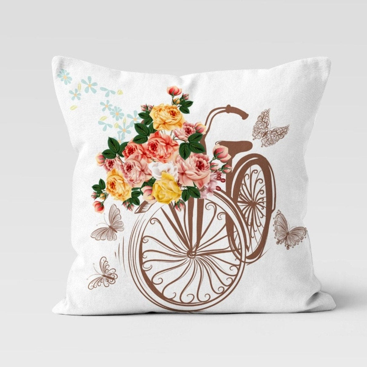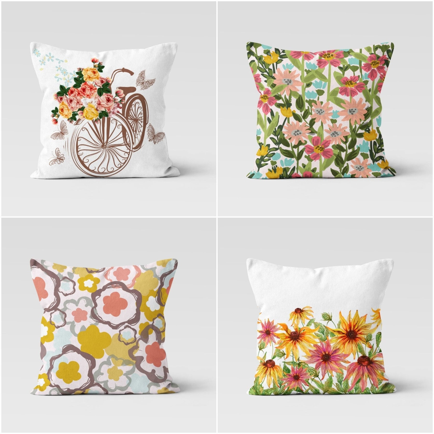 These elegant square decorative farmhouse throw pillow covers with colorful flower paintings, floral bike and butterfly prints;