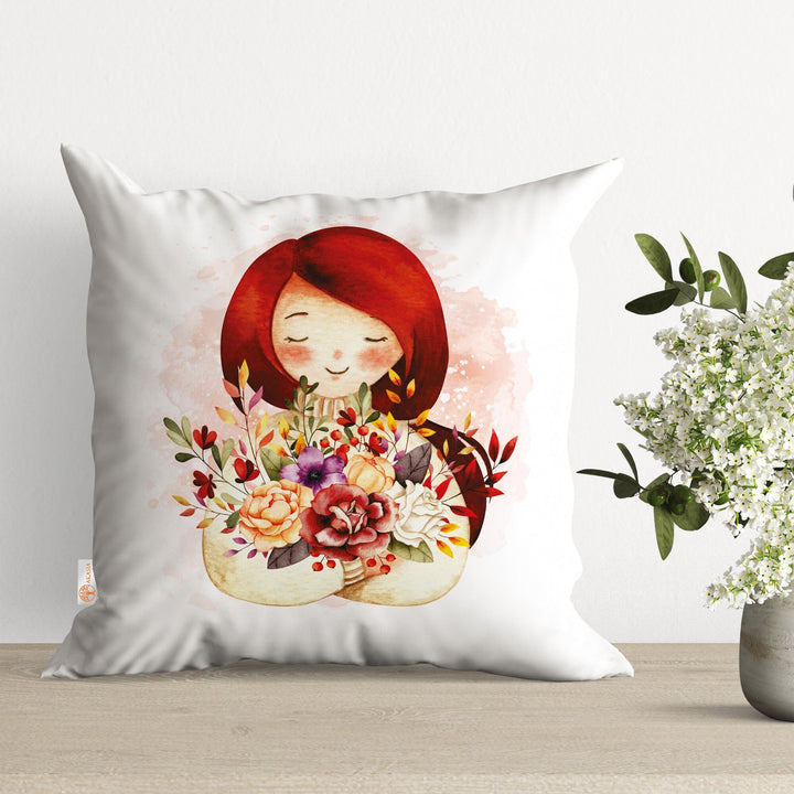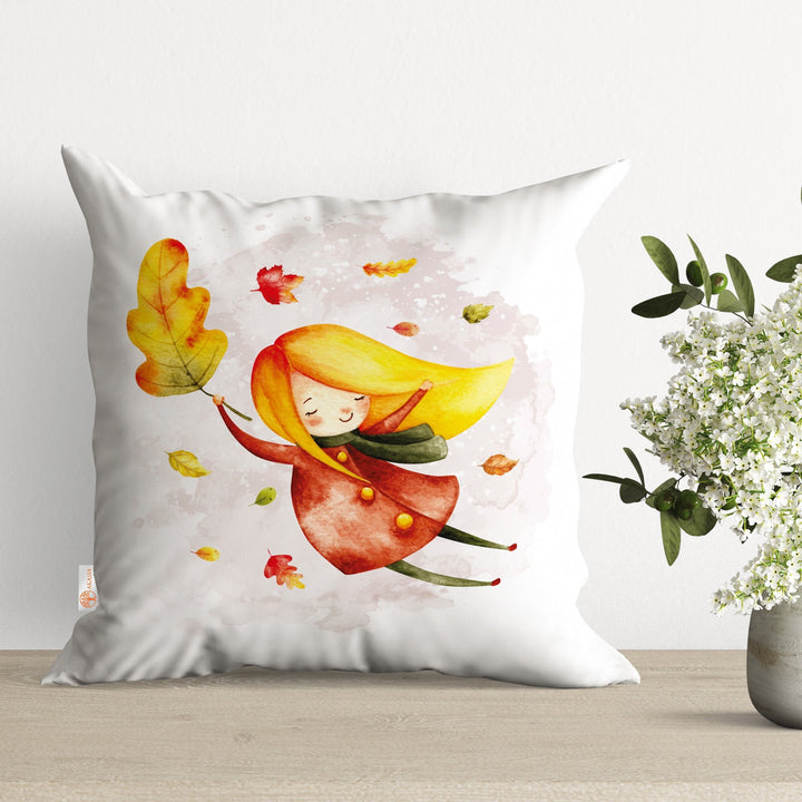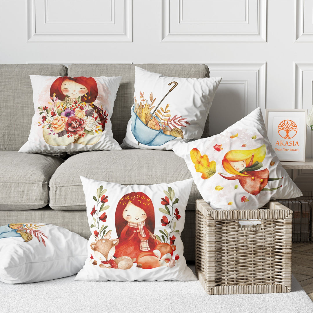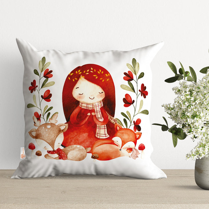 These elegant square decorative farmhouse throw pillow covers with Cute Girl, Fox, Dry Leaves and Flowers;