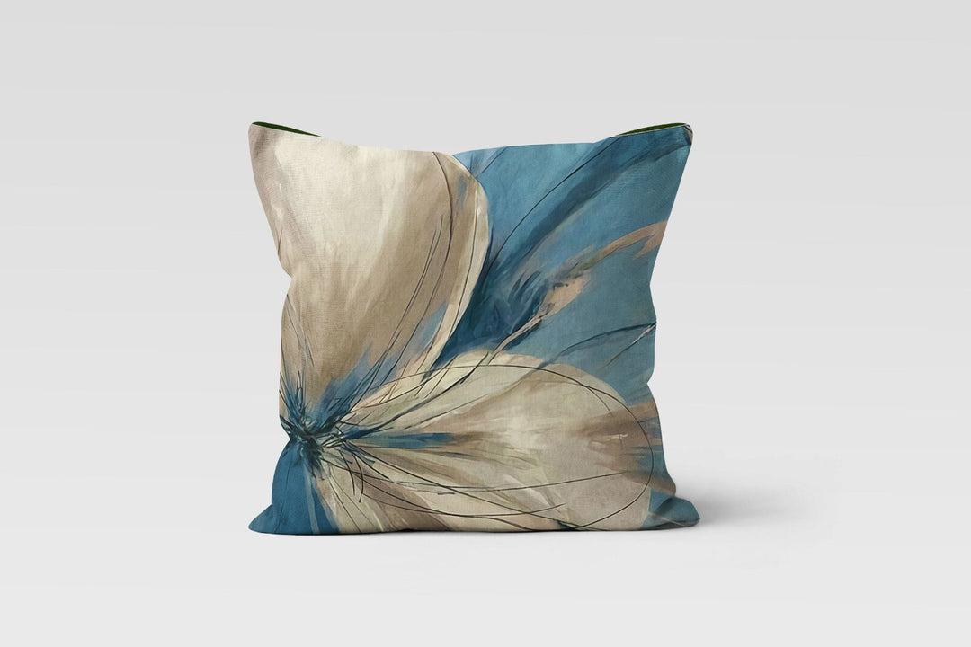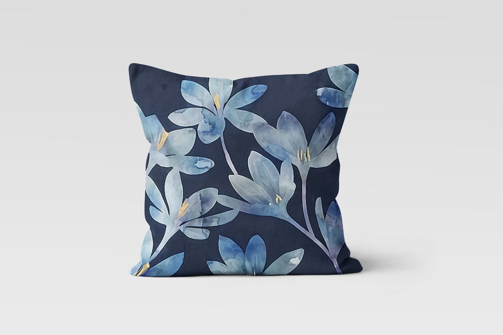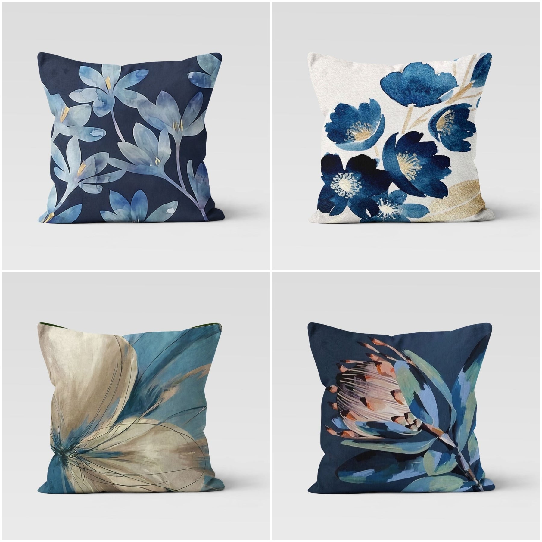 These elegant square farmhouse style throw pillow covers with blue and beige flowers/leaves;