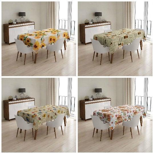 This high quality, natural, farmhouse style square/rectangle table decor with birds, sunflowers and pumpkins;
