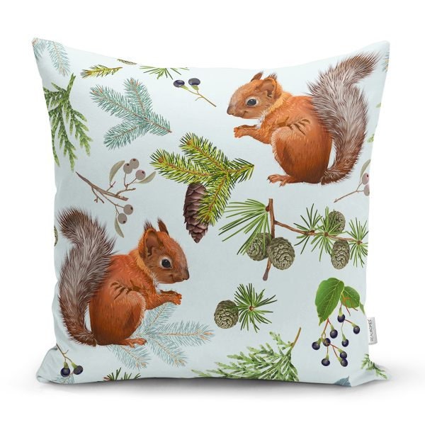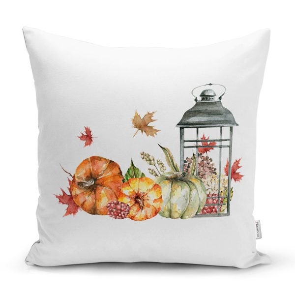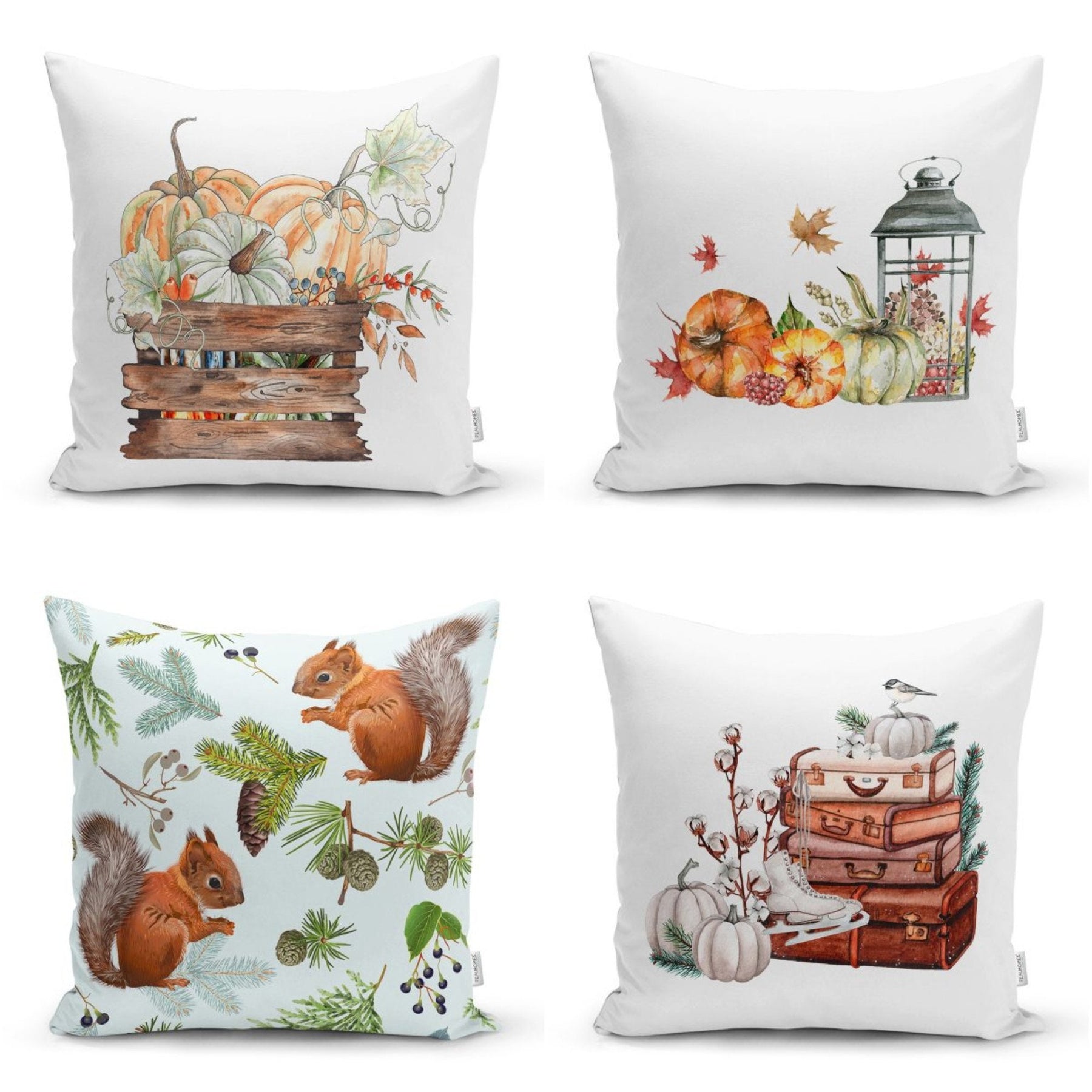 These decorative pillow covers with orange and white pumpkins, squirrels, dry leaves, lantern, bird, pine tree cones/needles, ice skating shoes and bond bags;