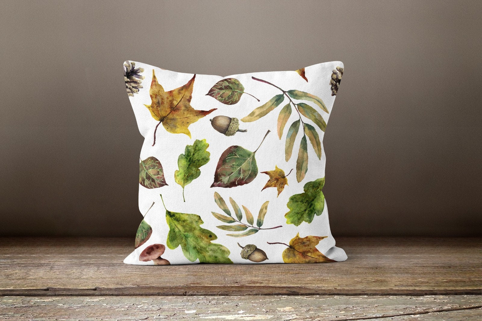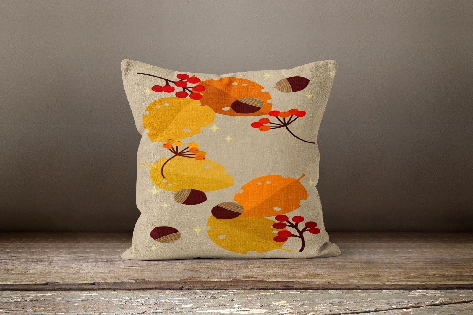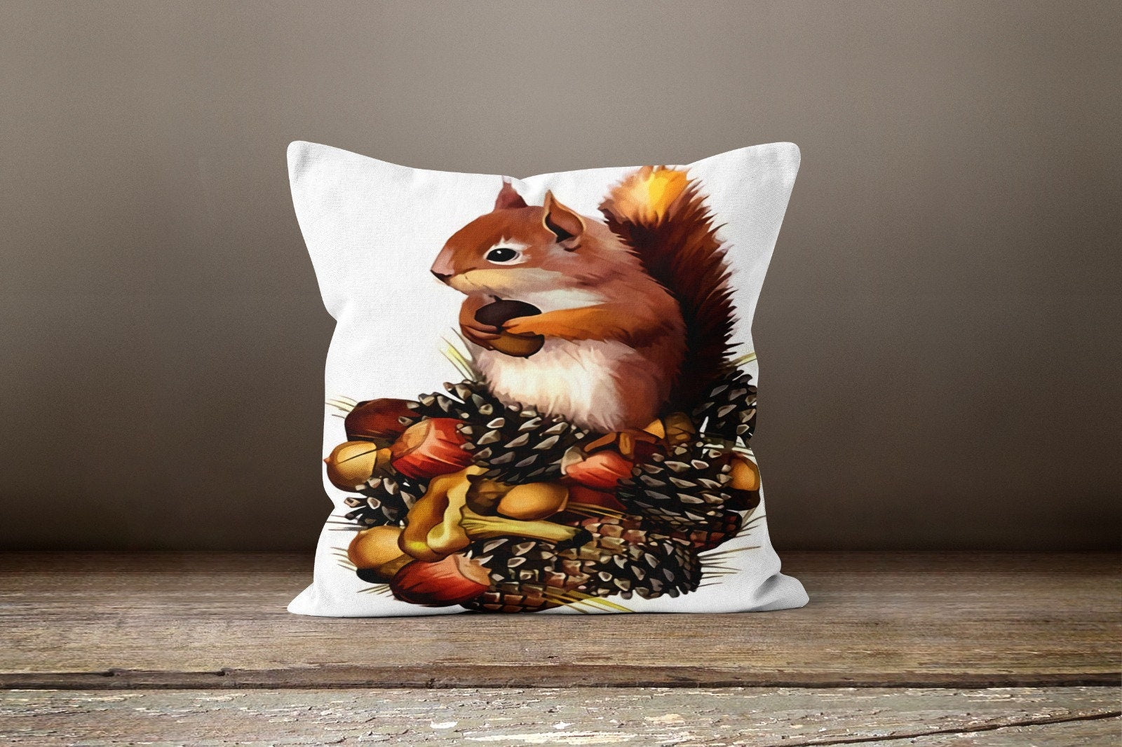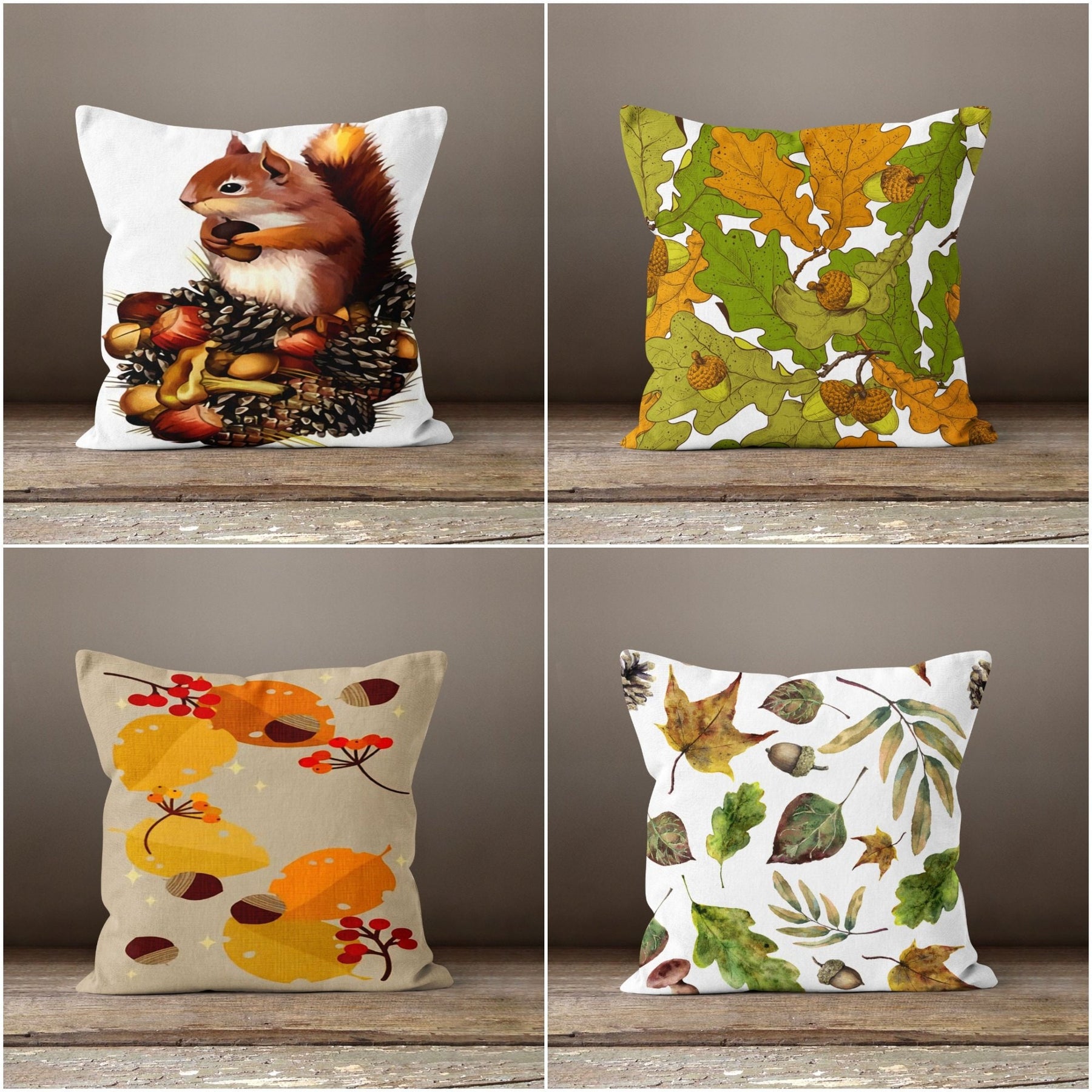 These elegant square decorative rustic farmhouse throw cushion covers with squirrel, acorn, green yellow dry leaves and red berries;