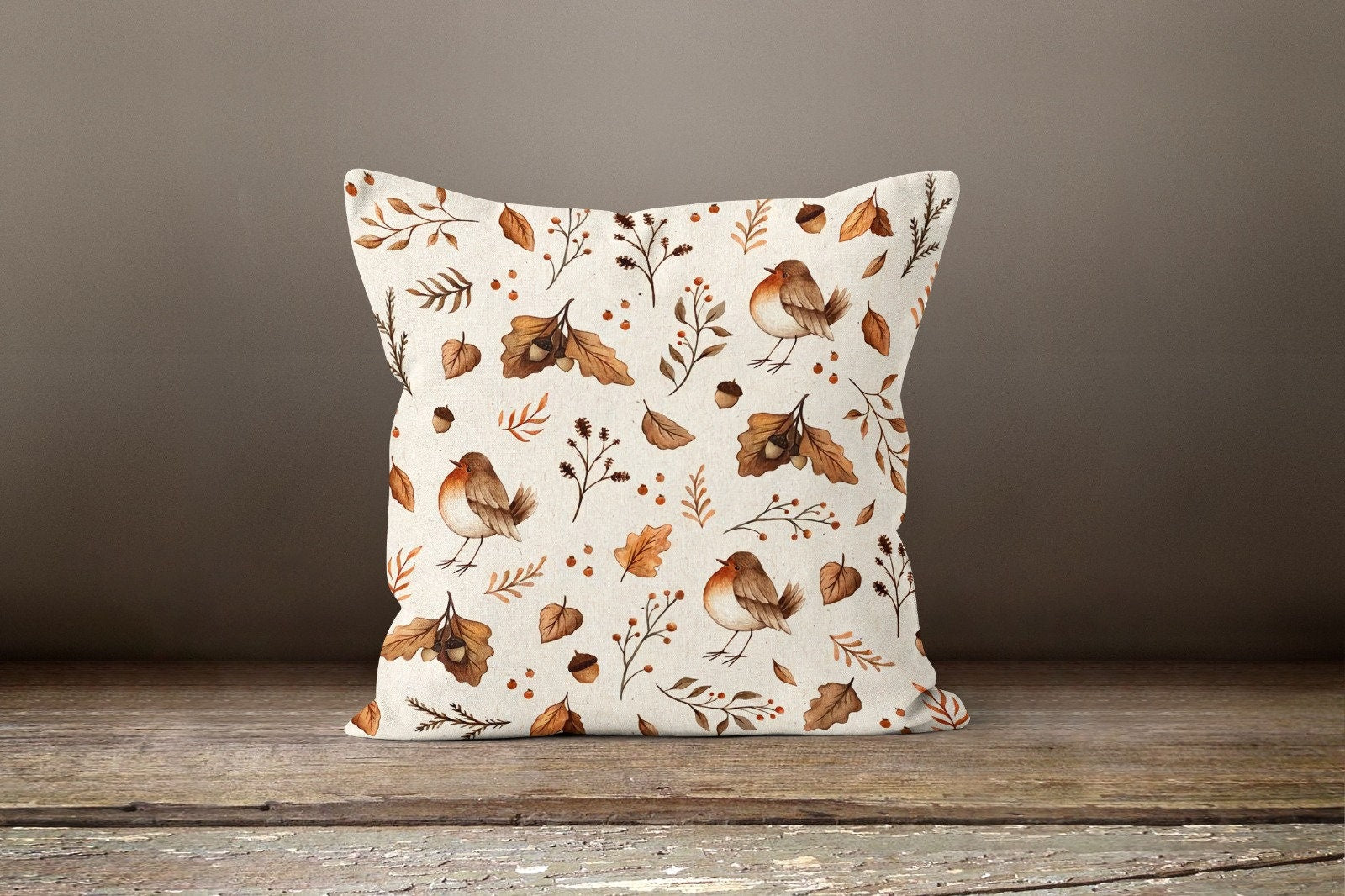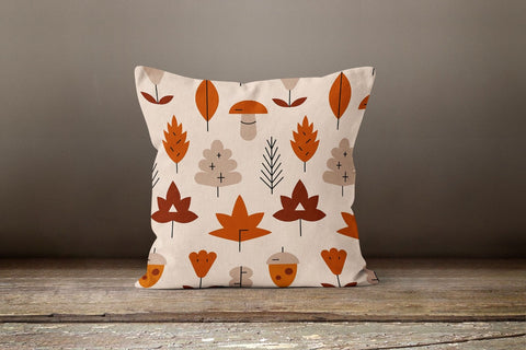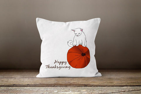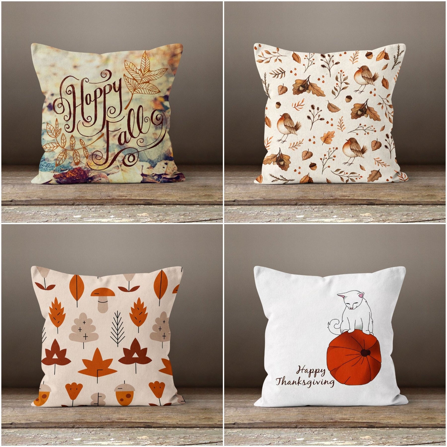 These elegant square decorative rustic farmhouse throw cushion covers with pumpkin, cat, fall trend colored birds, dry leaves, Happy Thanksgiving and Happy Fall prints;