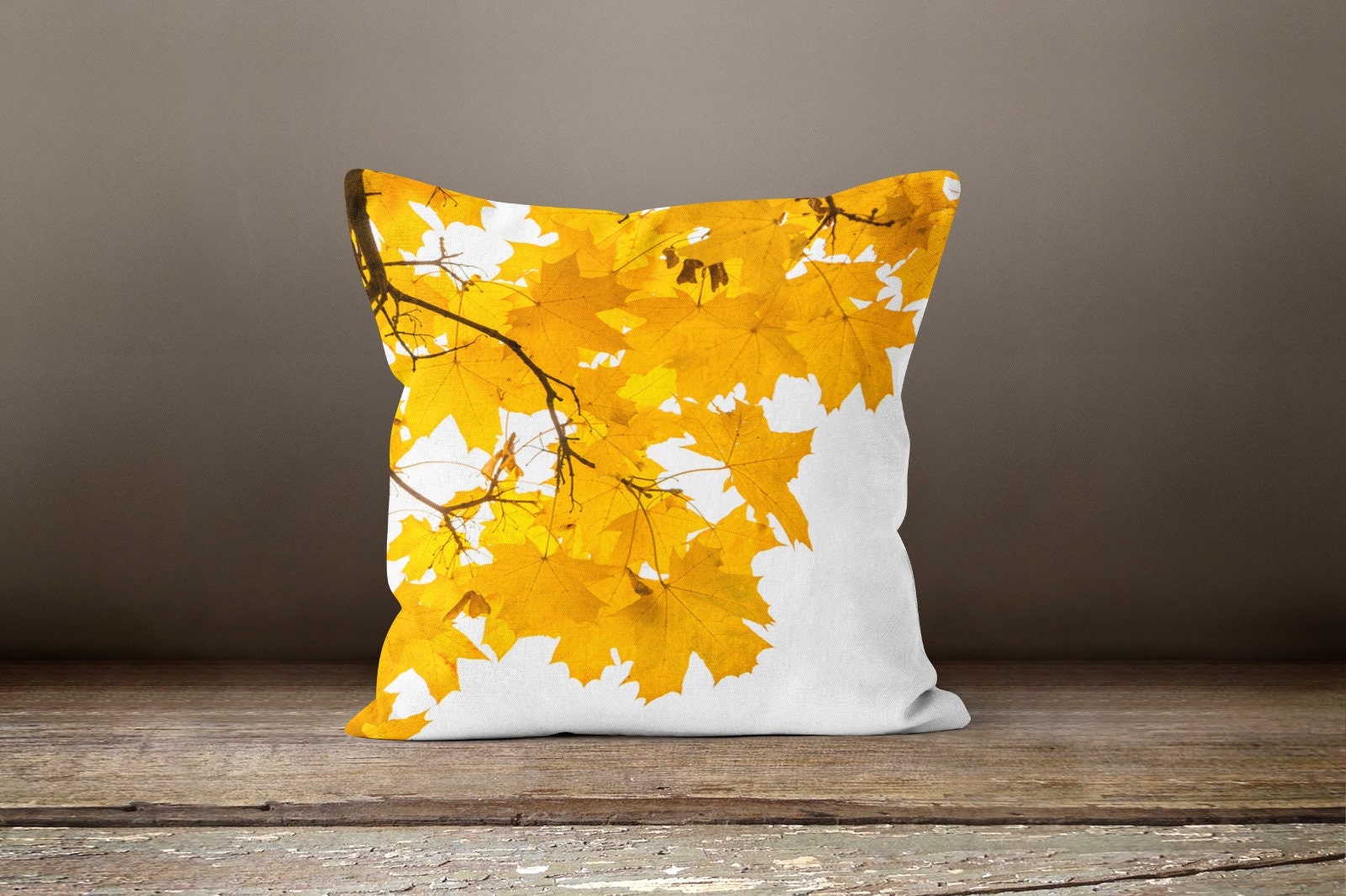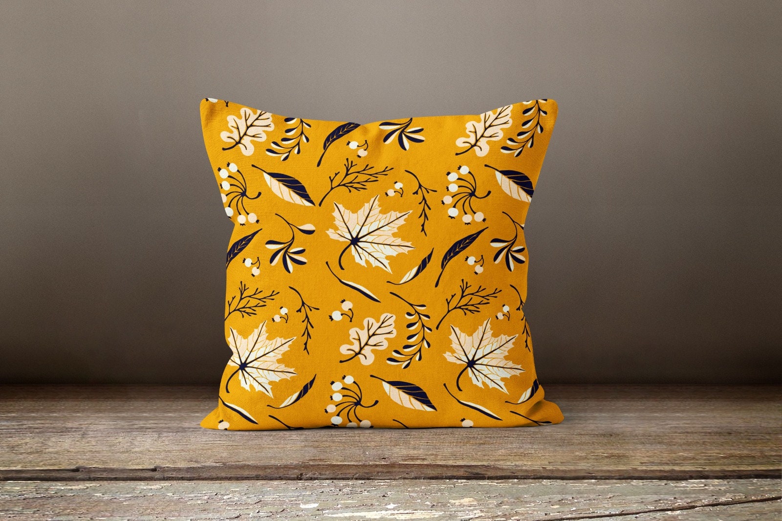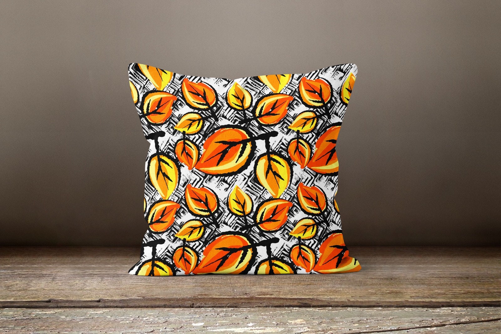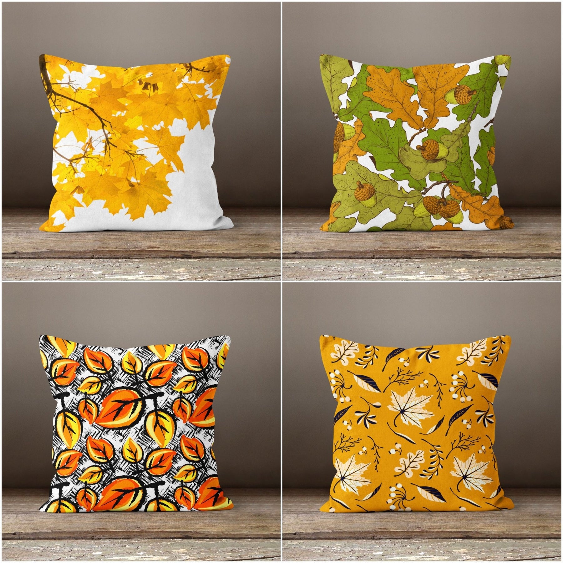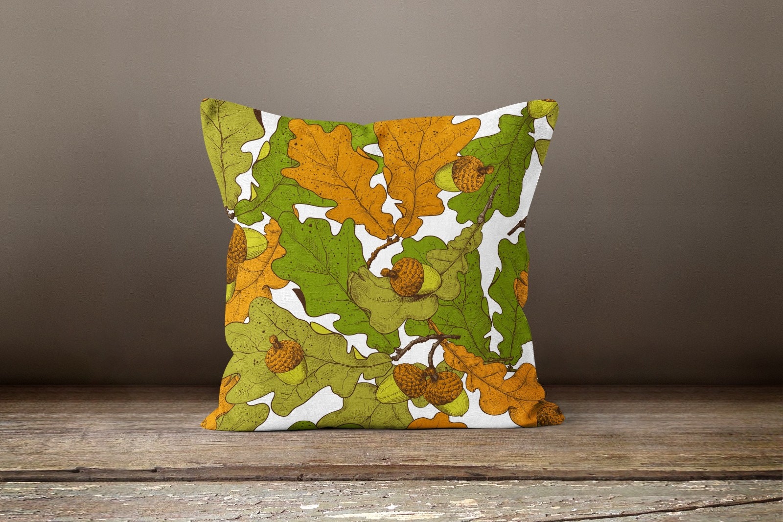 These elegant square decorative rustic farmhouse throw cushion covers with orange, yellow, green, white leaves and acorn print;