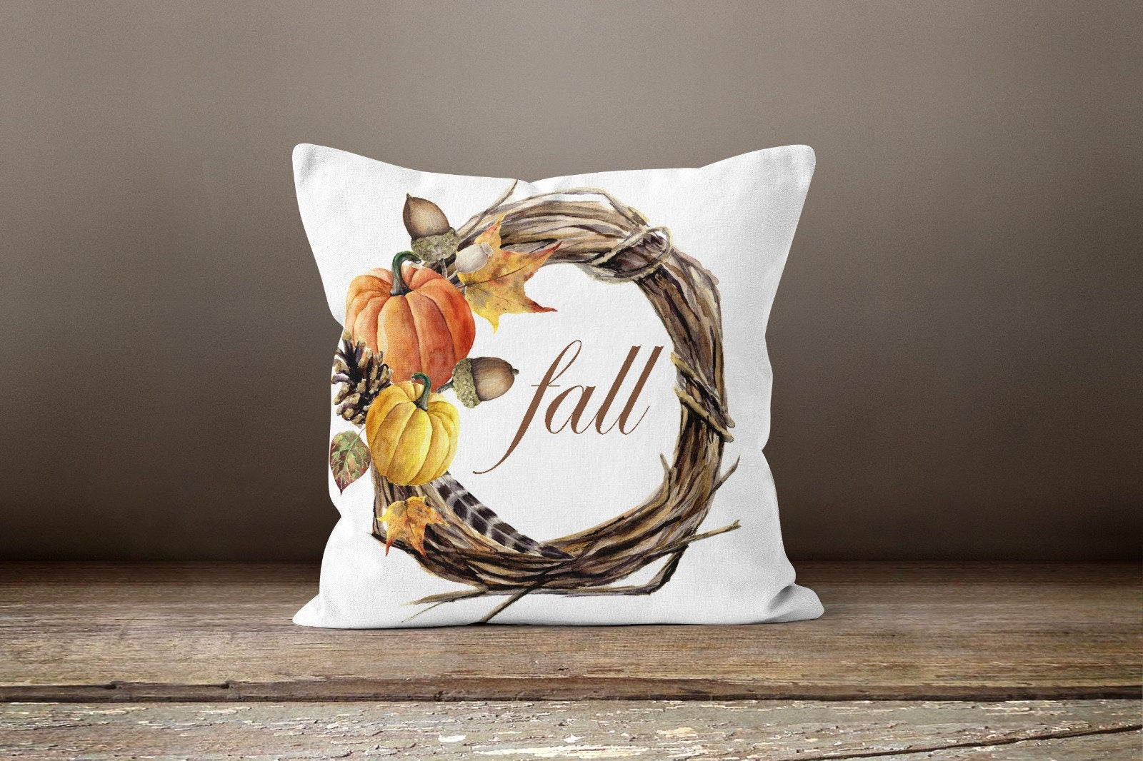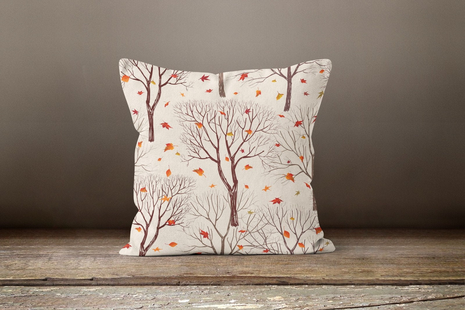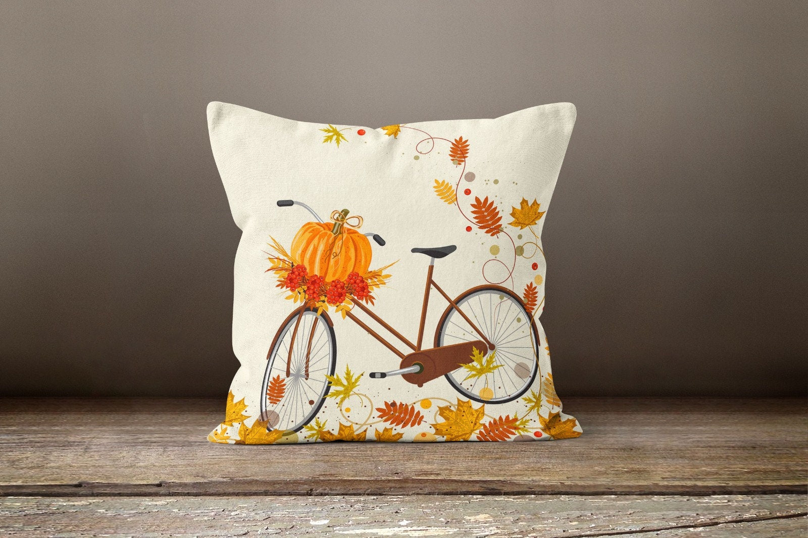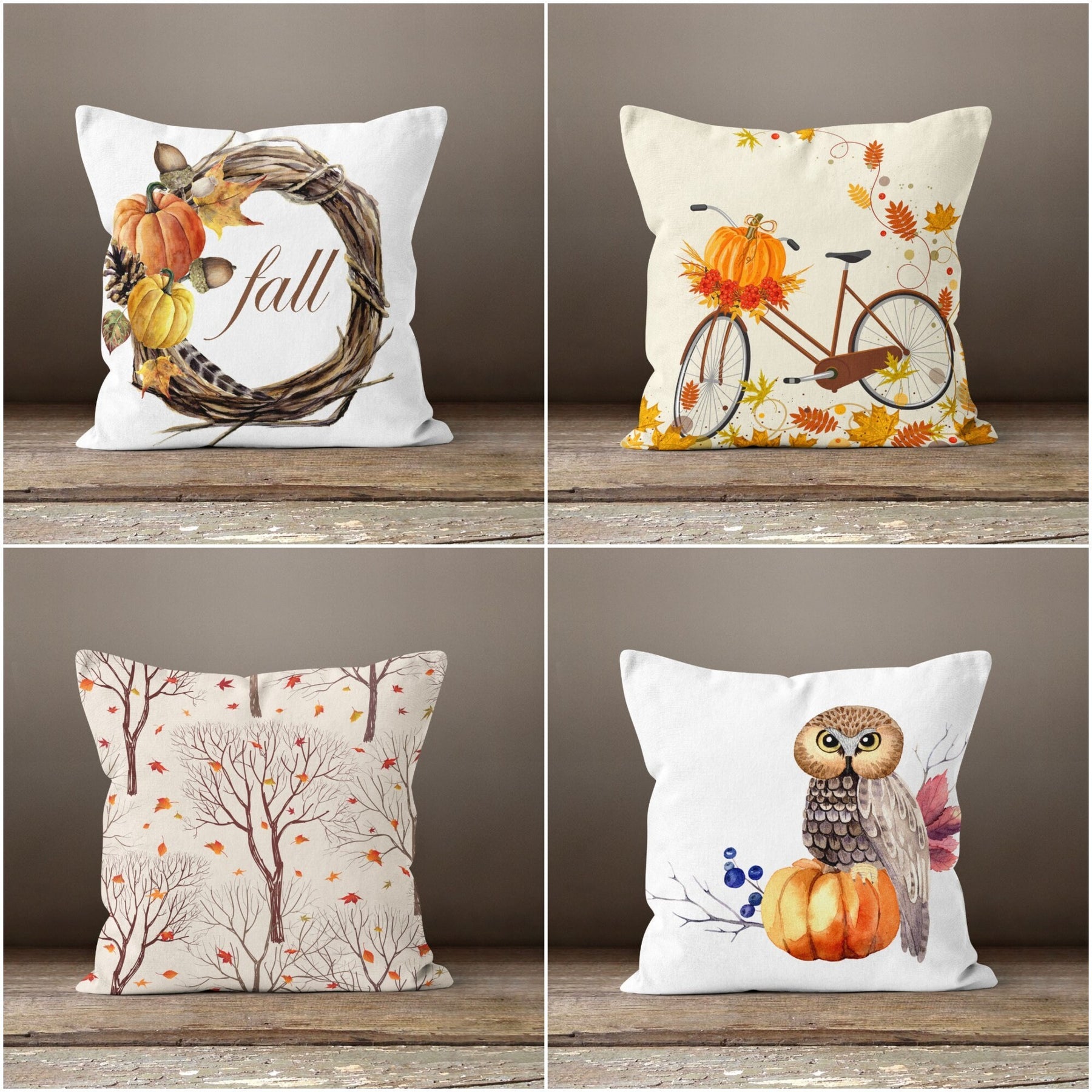 These elegant square decorative rustic farmhouse throw cushion covers with orange, yellow pumpkins, dry leaves, cute owl with pumpkin, autumn tree with falling leaves, and leaves, acorn with fall print, pumpkin and leaves, bicycle with orange pumpkin and dry leaves;