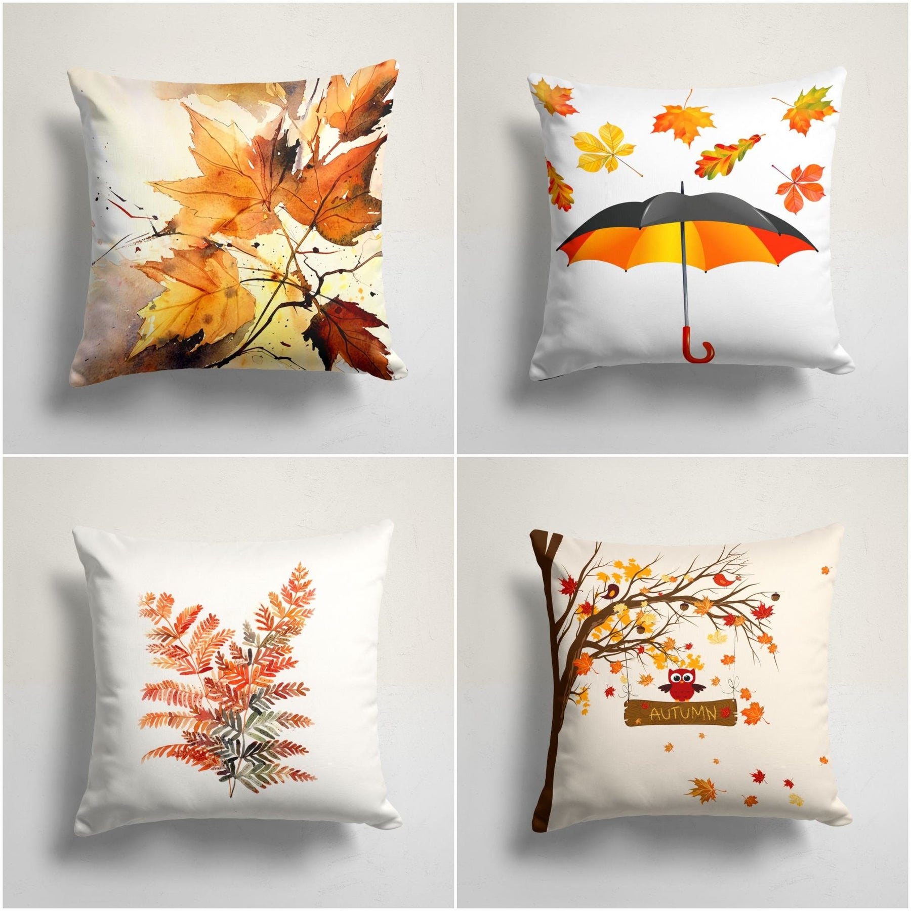 These autumn elegant square decorative rustic farmhouse throw cushion covers with leaves, owl, autumn tree and fall color umbrella;