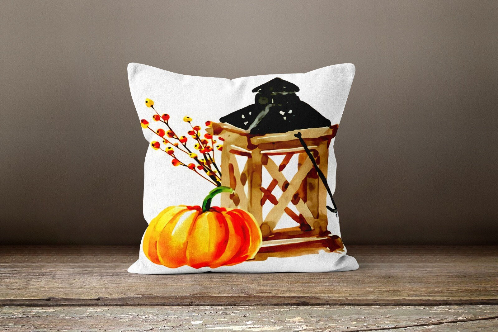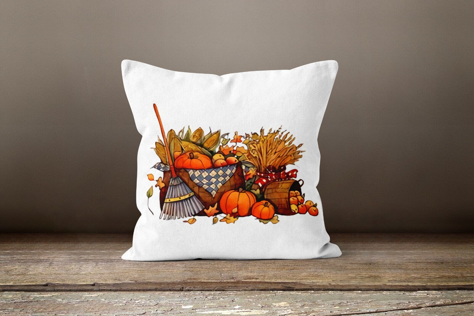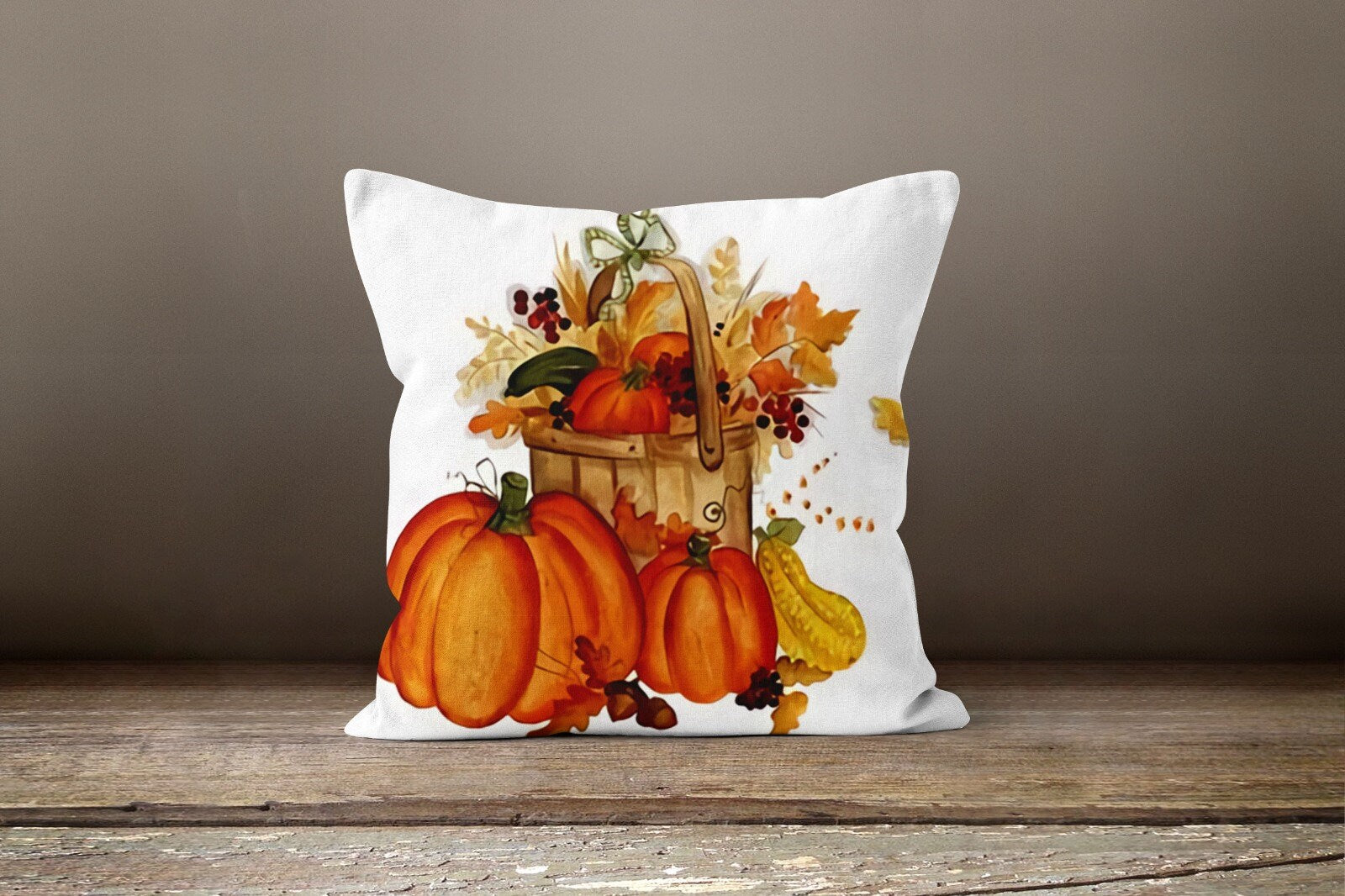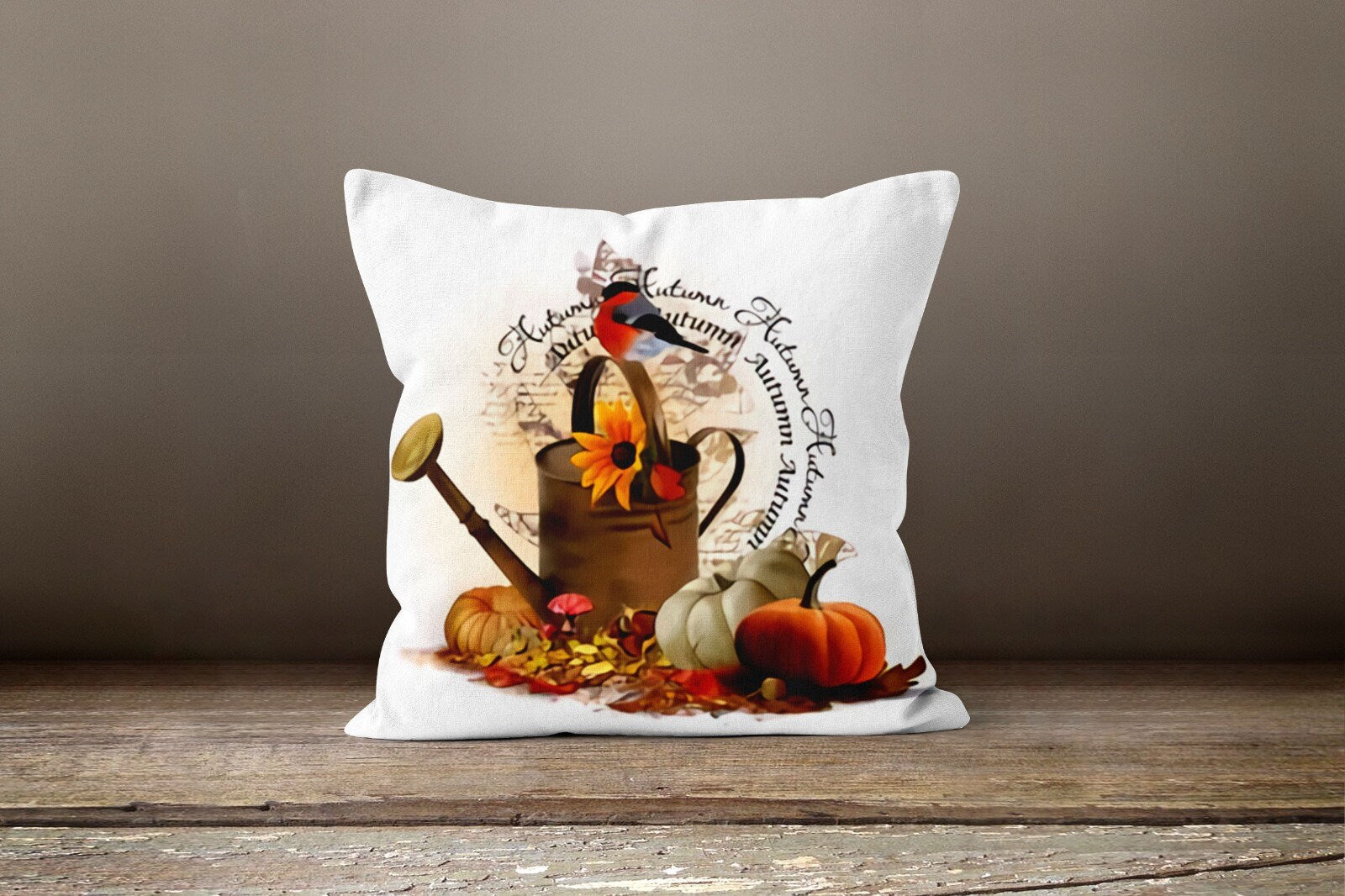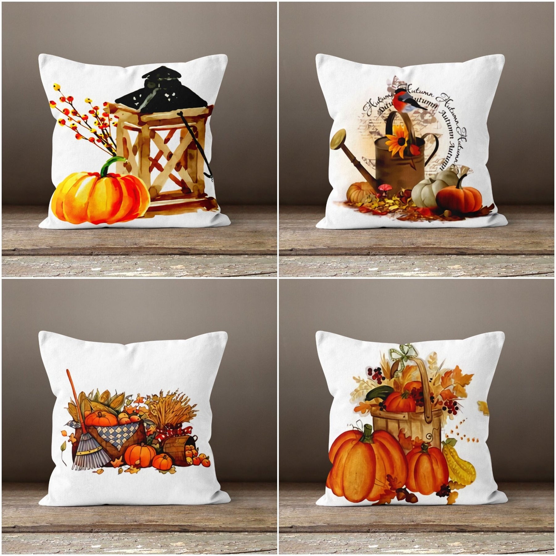 These elegant square decorative rustic farmhouse throw cushion covers with orange, white pumpkins, bird, sunflower and pitcher and also autumn print;