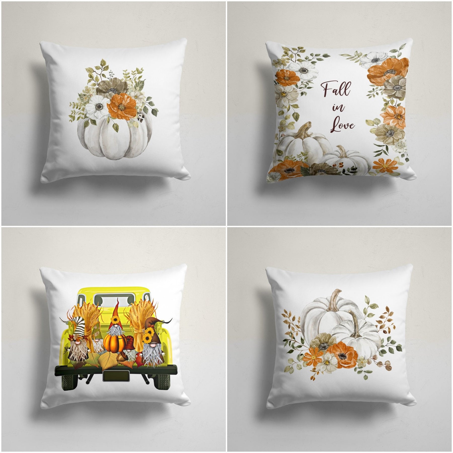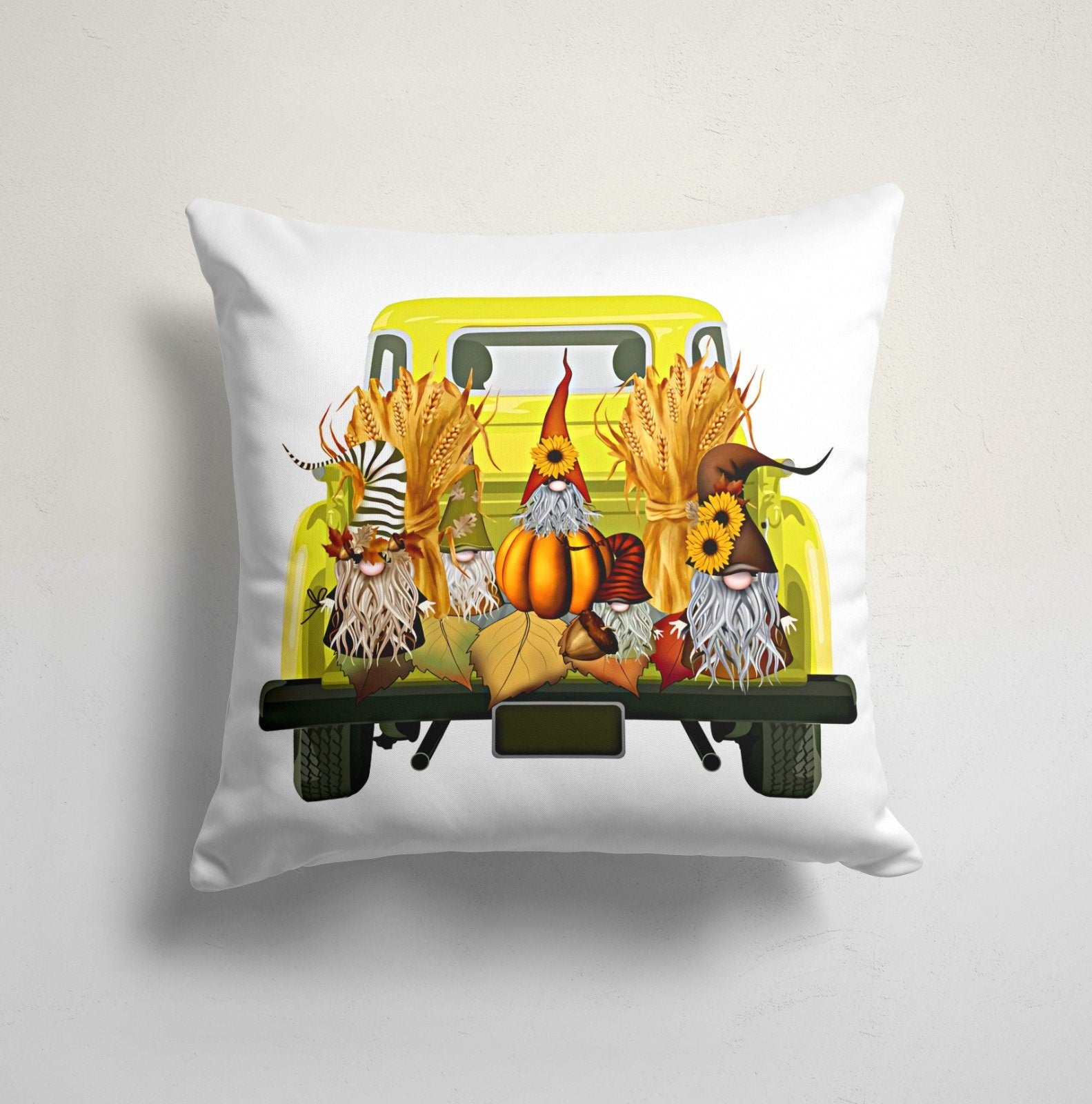 These elegant square decorative rustic farmhouse throw cushion covers with floral white pumpkins, dwarfs on the yellow truck and Fall in Love print;