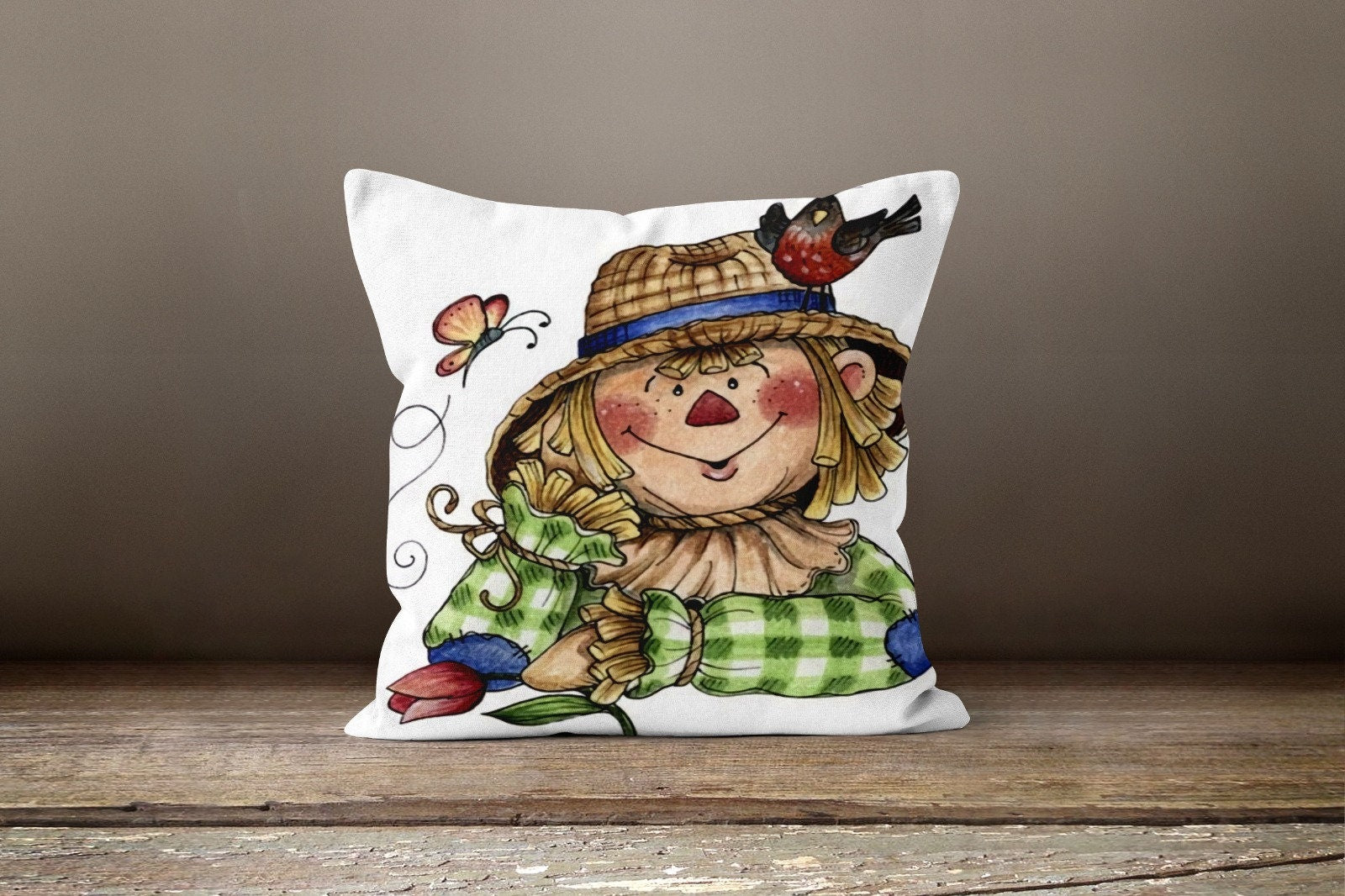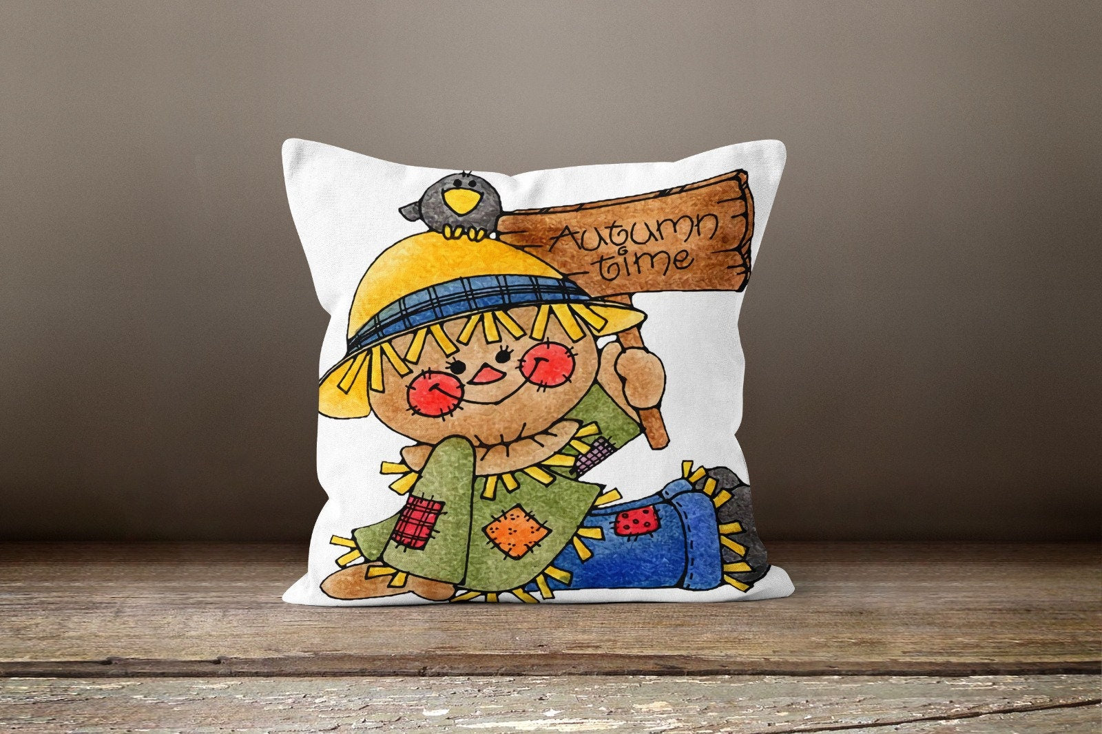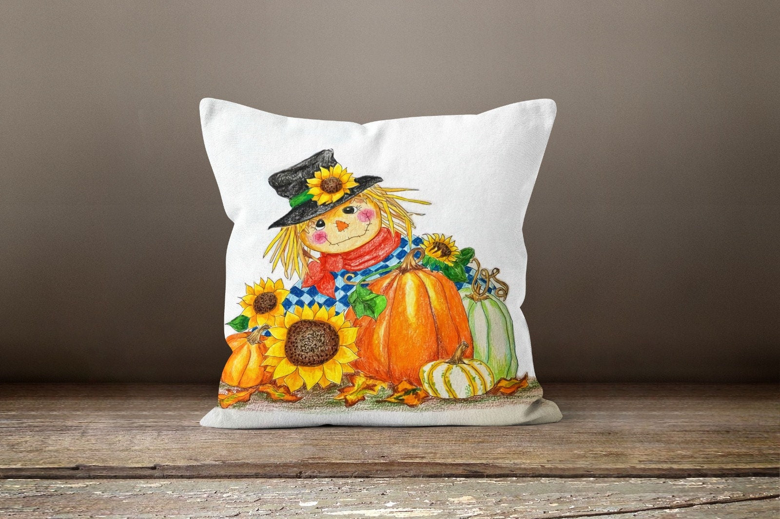 These elegant square decorative rustic farmhouse throw cushion covers with cute garden scarecrow, bird, butterfly, orange green pumpkins, sunflower and Autumn Time print;