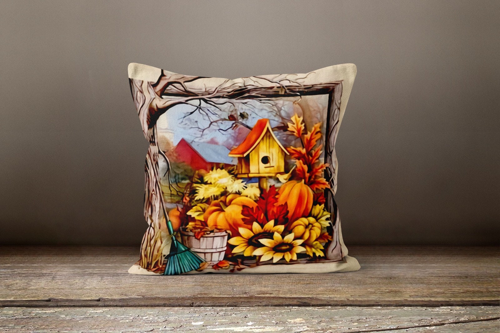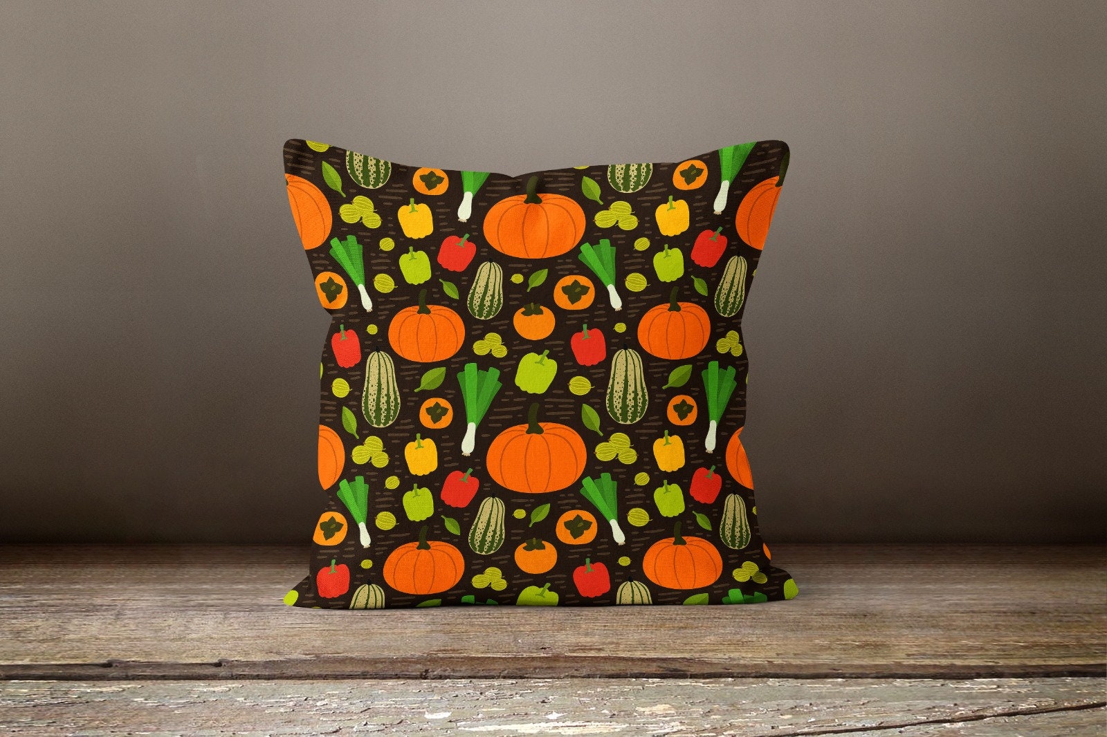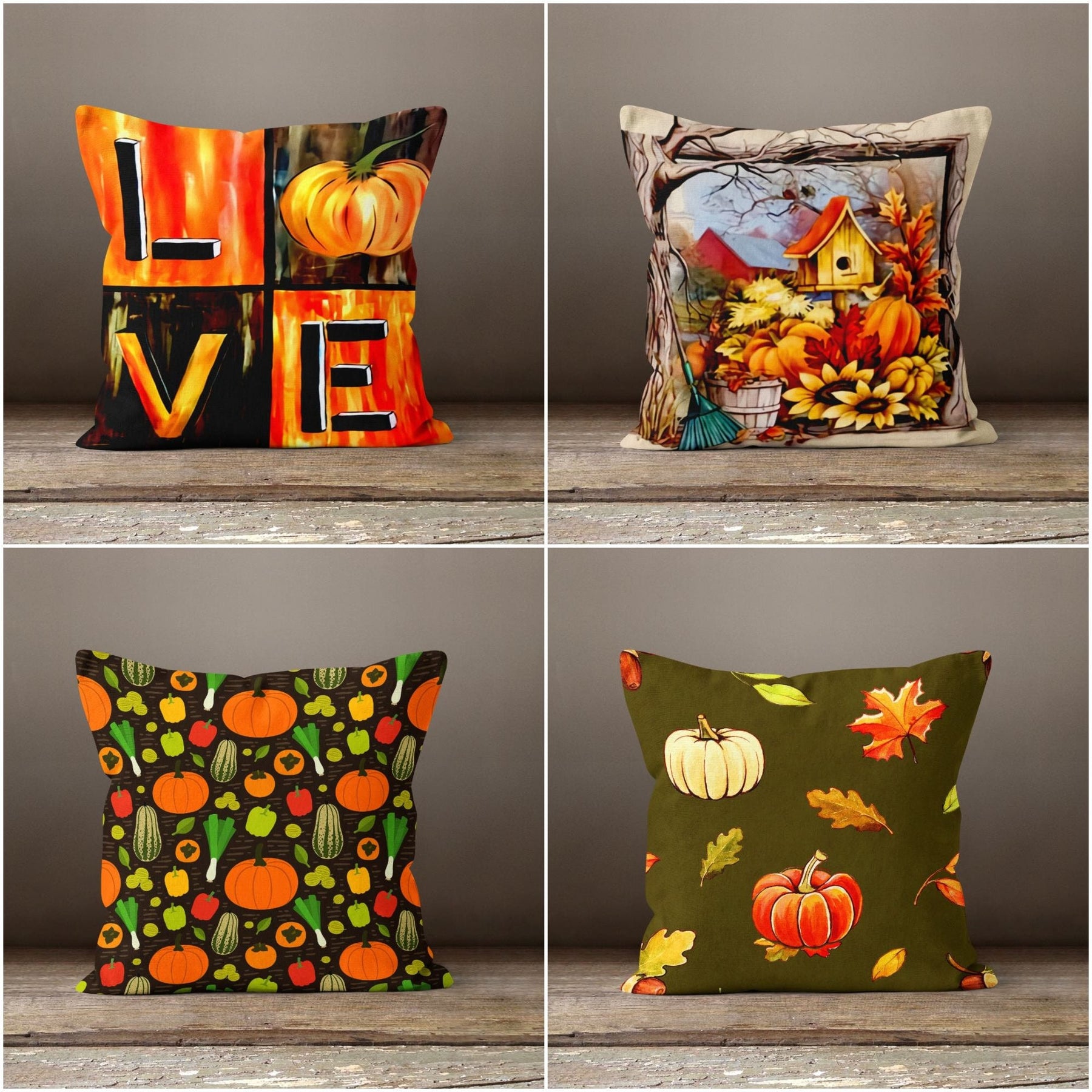These elegant square decorative rustic farmhouse throw cushion covers with orange and white pumpkins, love print, leaves, sunflower, vegetables, bird and green broom;