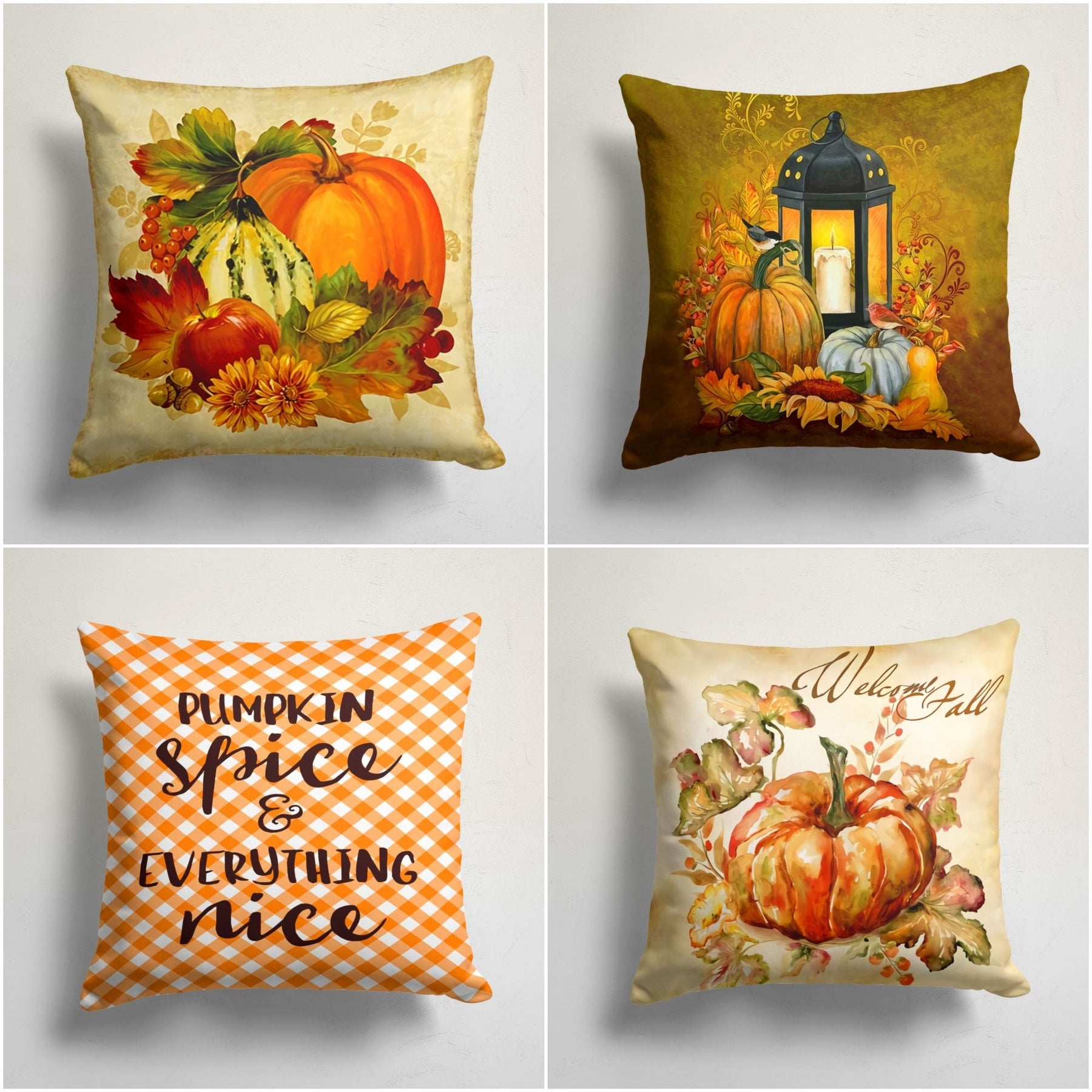 These elegant square decorative rustic farmhouse throw cushion covers with floral pumpkins, leaves and Thanksgiving sayings, pumpkin spice everything nice, welcome fall, orange plaid design, lantern;