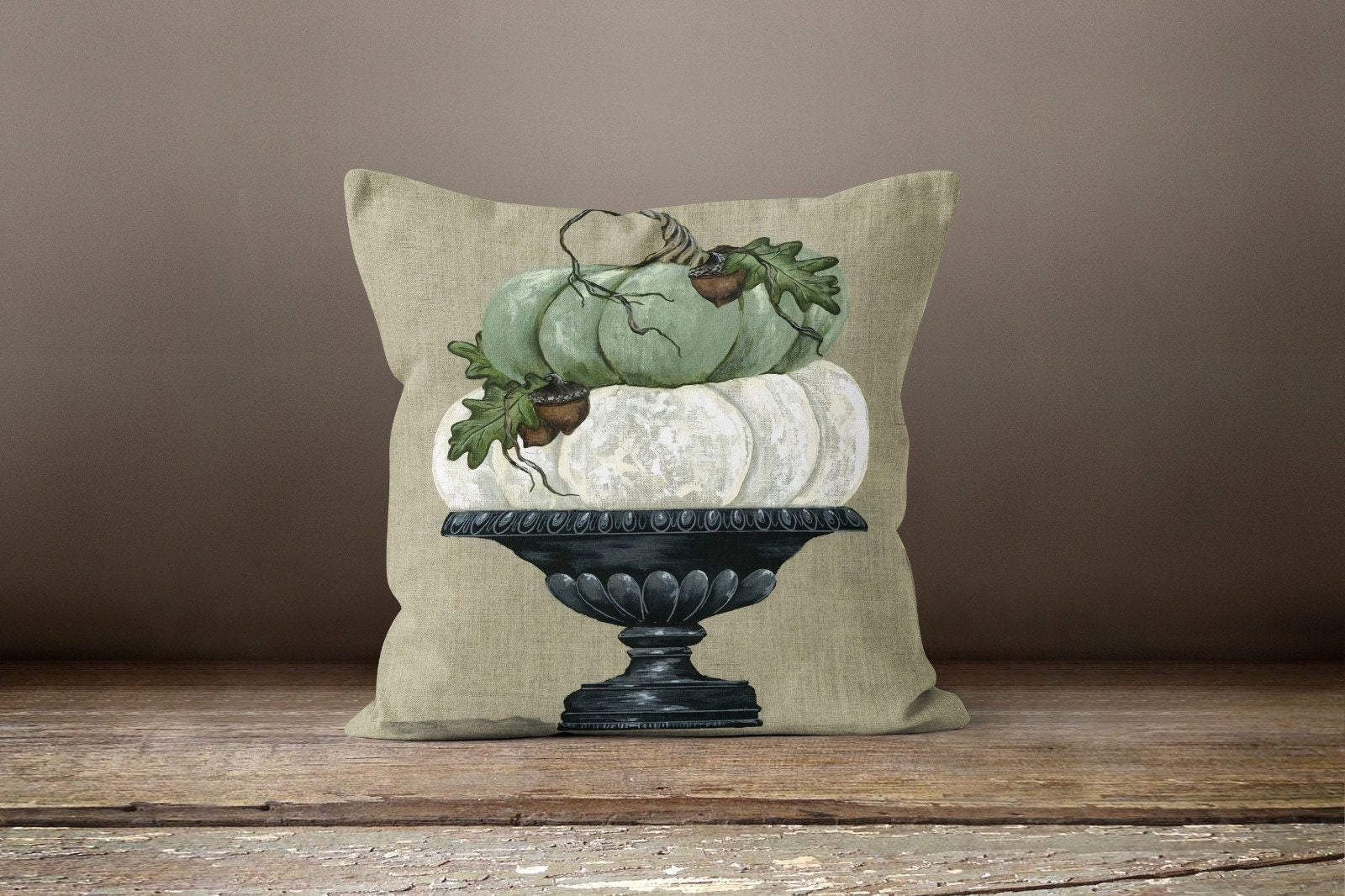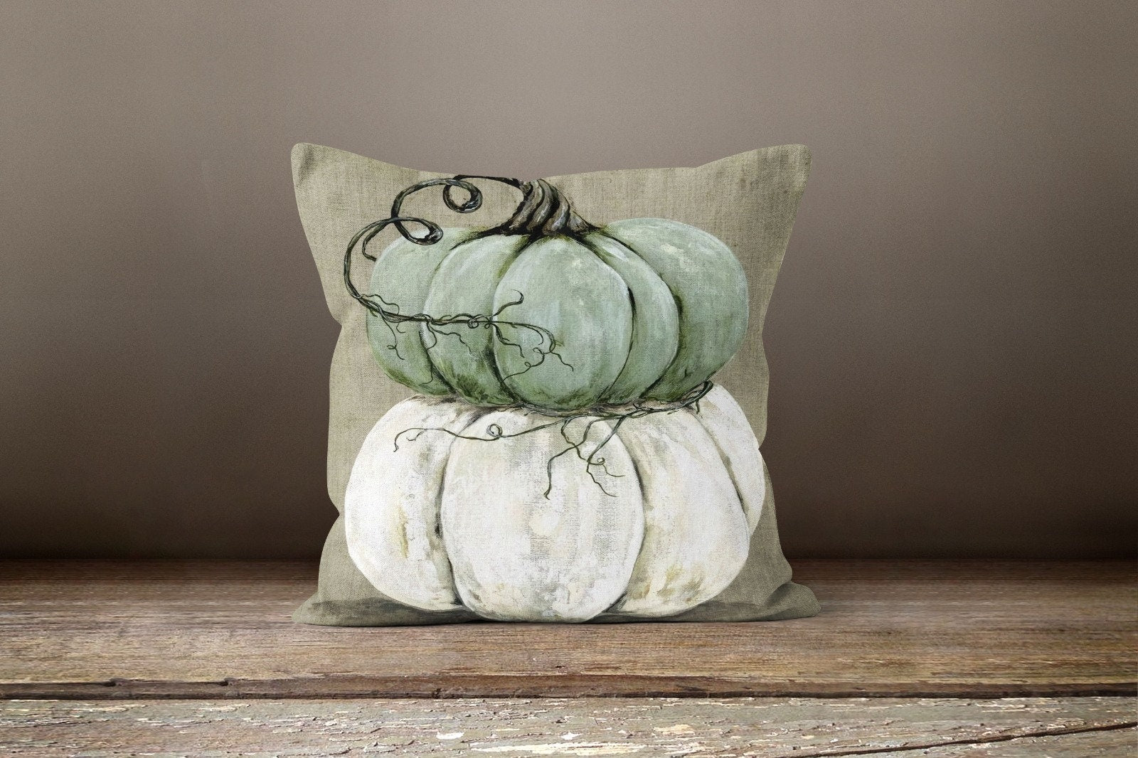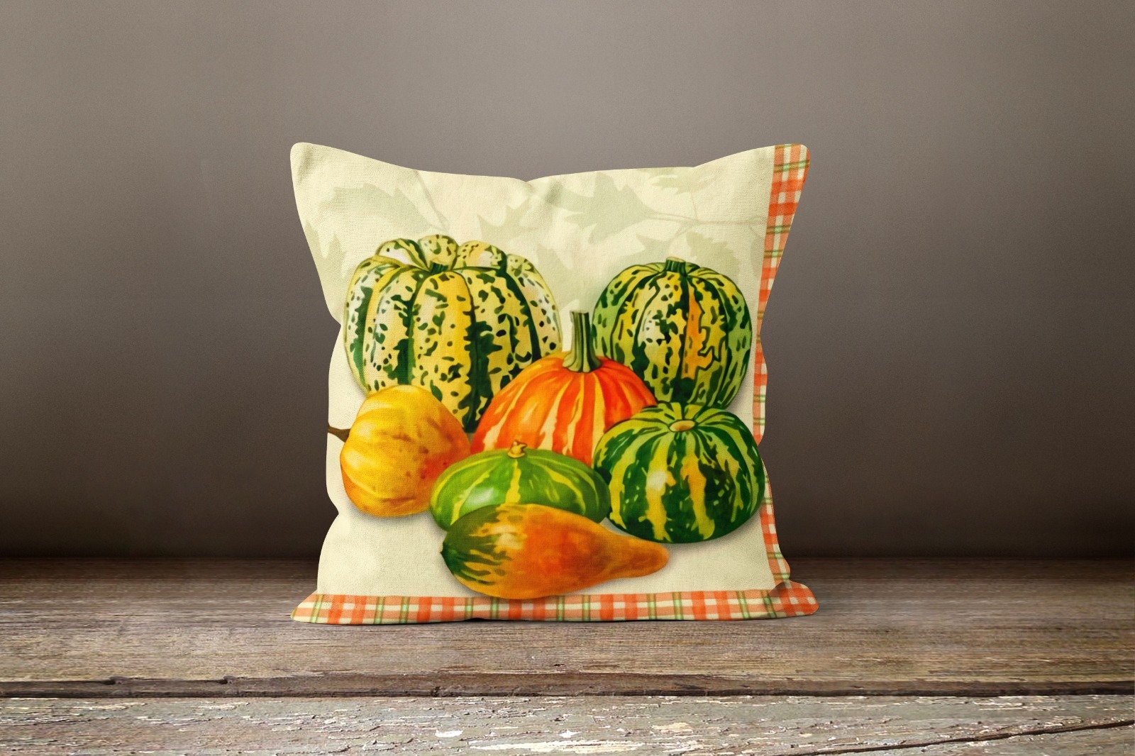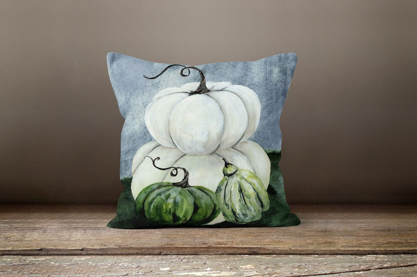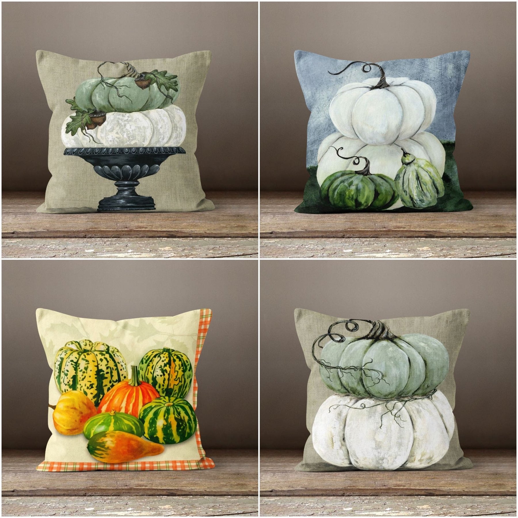 These elegant square decorative rustic farmhouse throw cushion covers with orange, gray, green and white pumpkins;