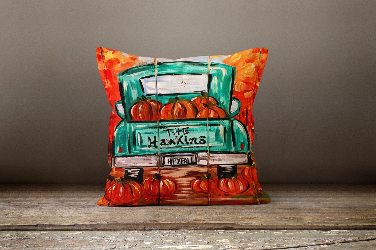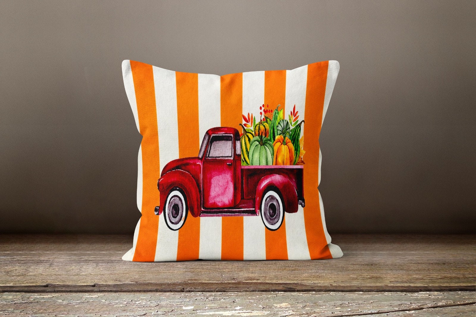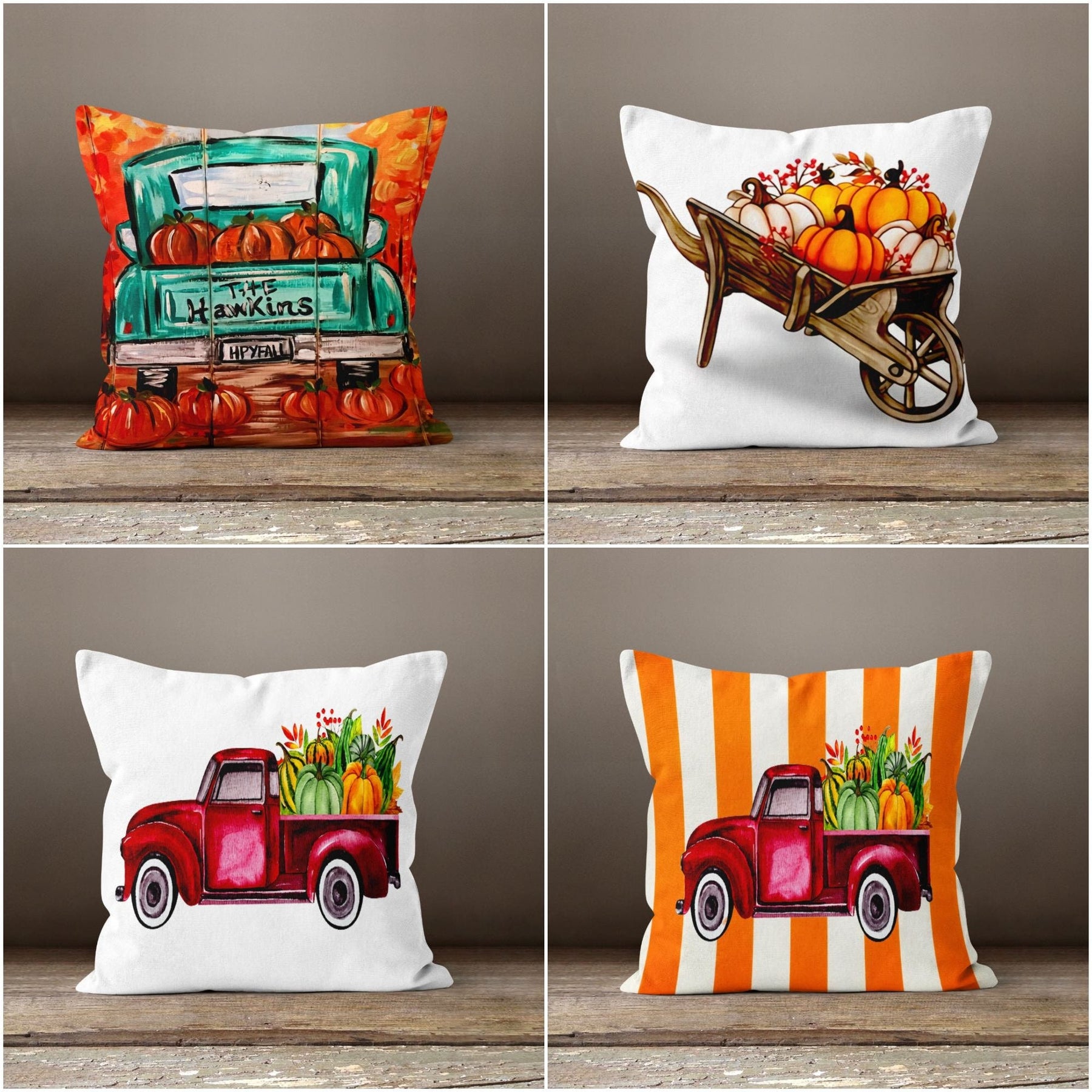 These elegant square decorative rustic farmhouse throw cushion covers with pumpkins, wheelbarrow, pumpkin carriers, pick-up, striped design;