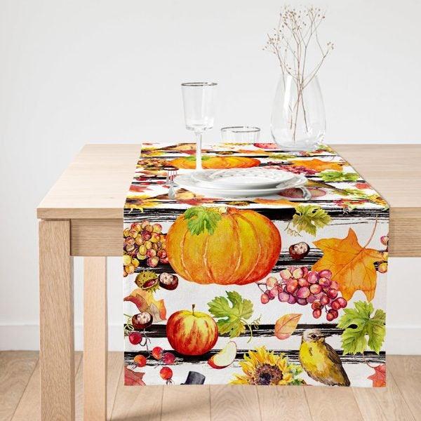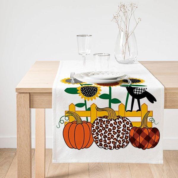 This high quality, suede table decor with striped pumpkins, sunflower, crow and fruits;