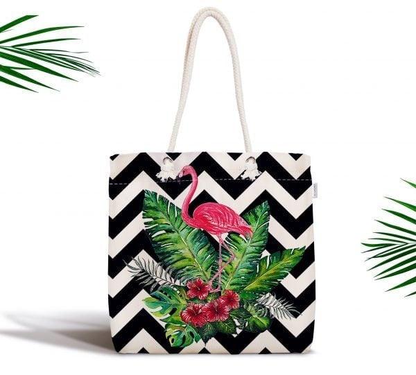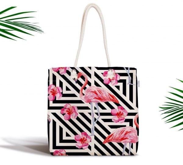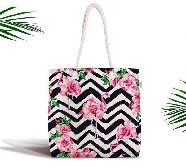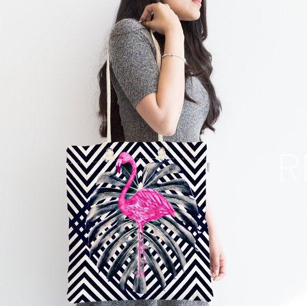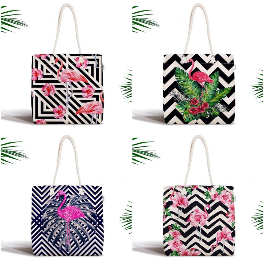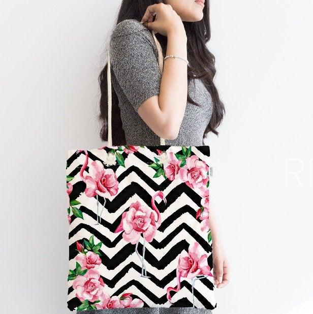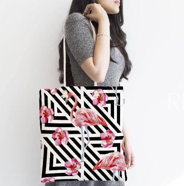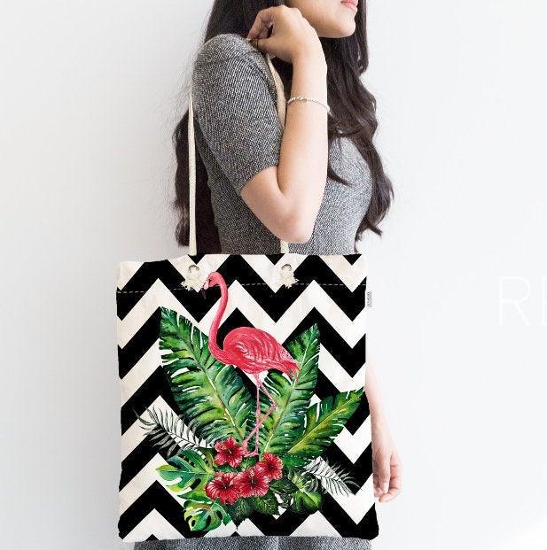Flamingo Shoulder Bag|Floral Pink Flamingo Fabric Handbag|Black White Patterned Flamingo Handbag|Beach Tote Bag|Purse for Women|Shopping Bag