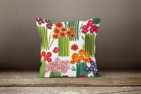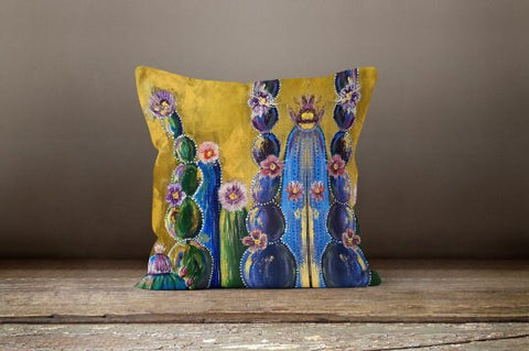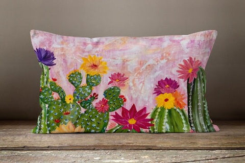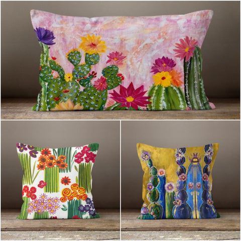 These colorful decorative farmhouse throw/lumbar pillow covers with green, yellow, blue and red floral cactus;