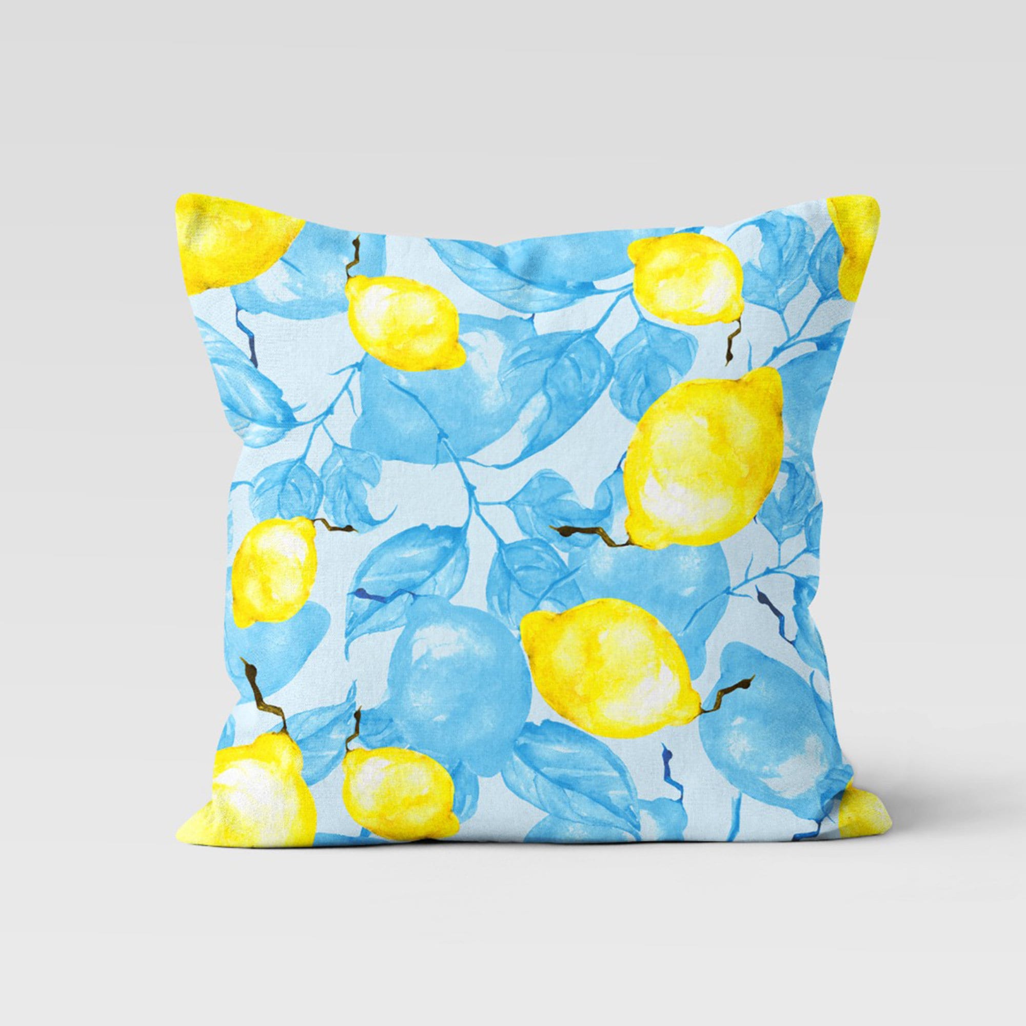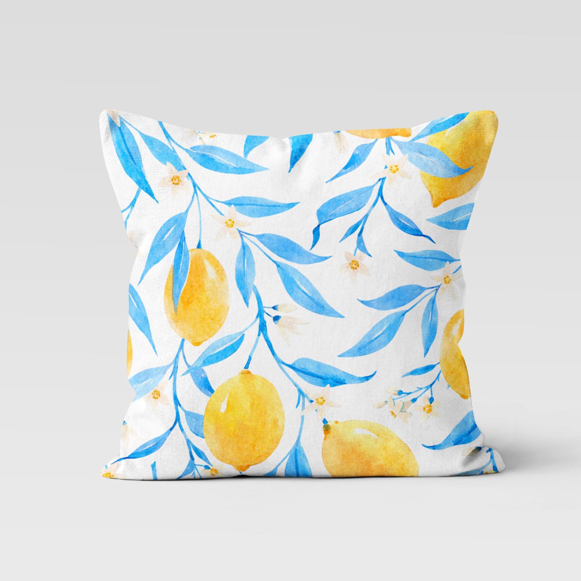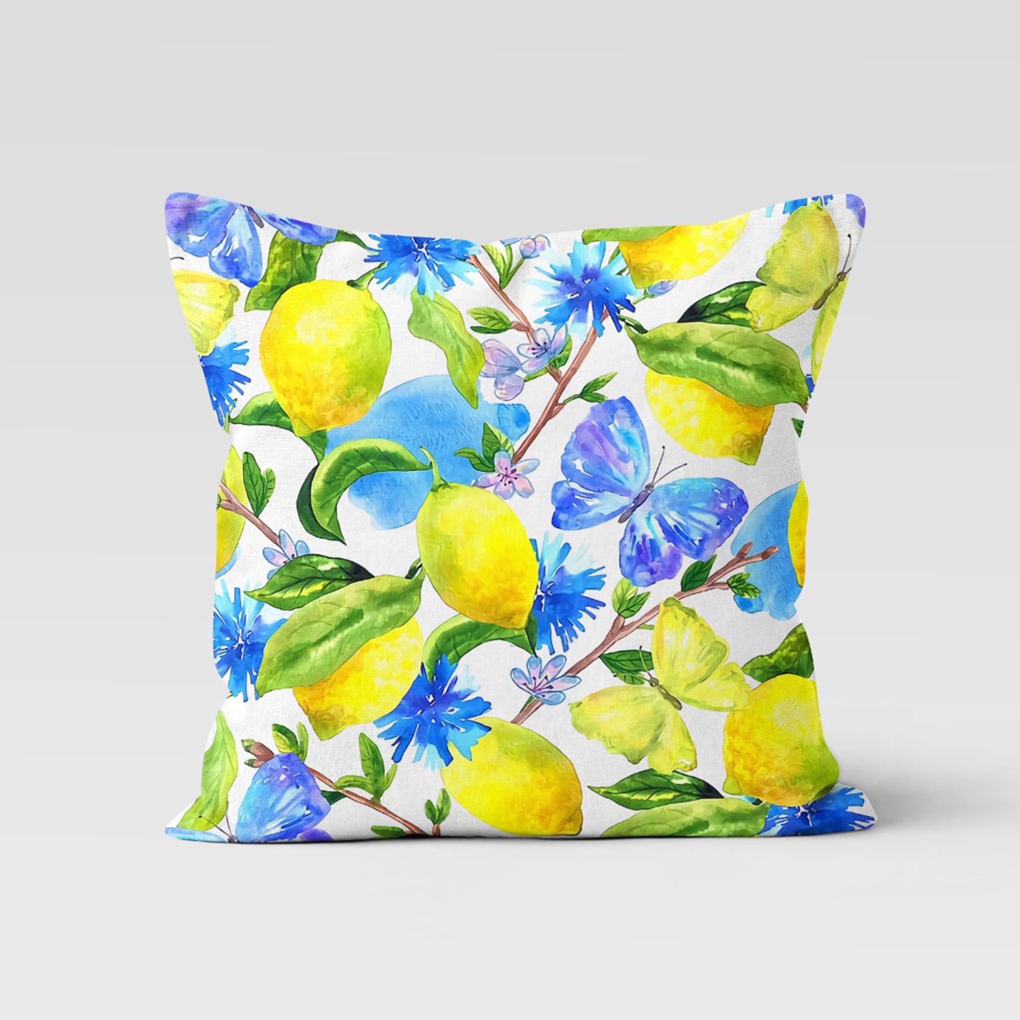 These square decorative farmhouse throw pillow covers with yellow lemons, blue leaves and a blue butterfly;