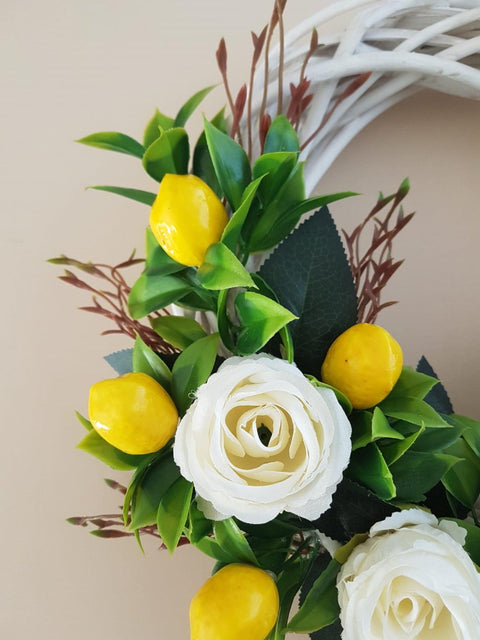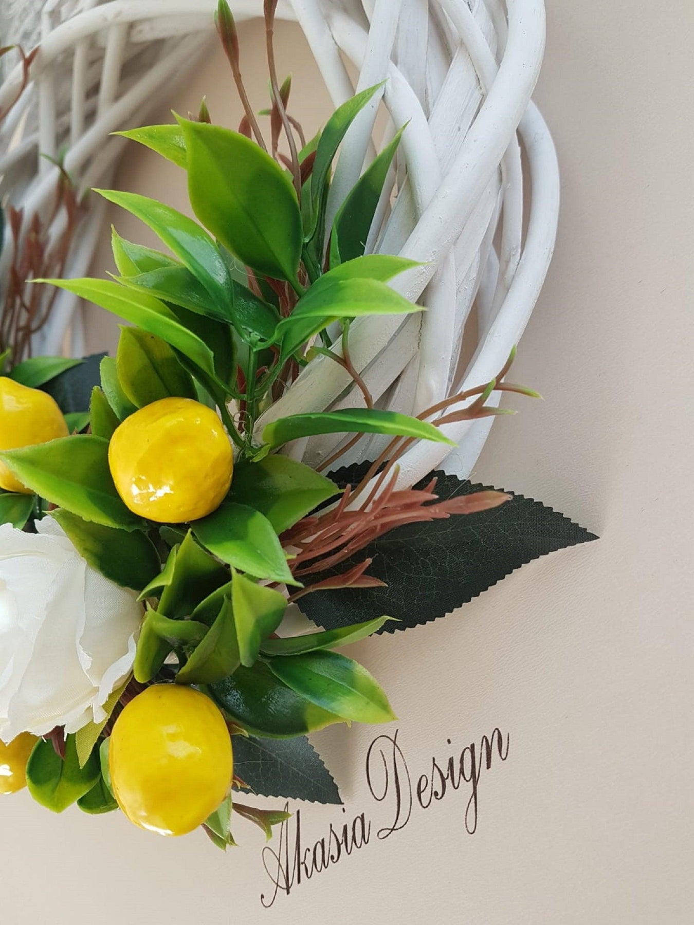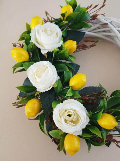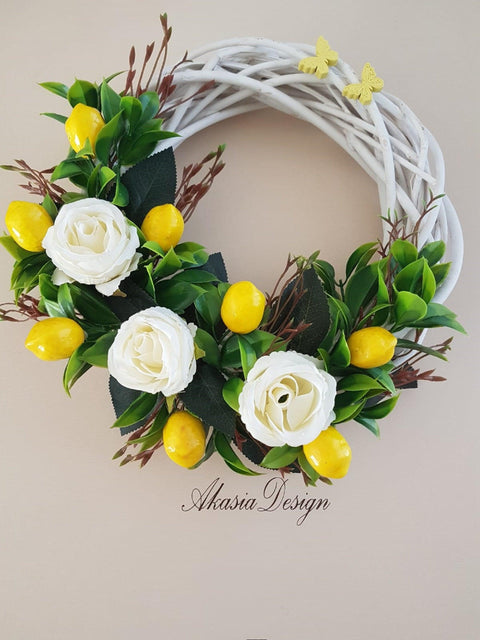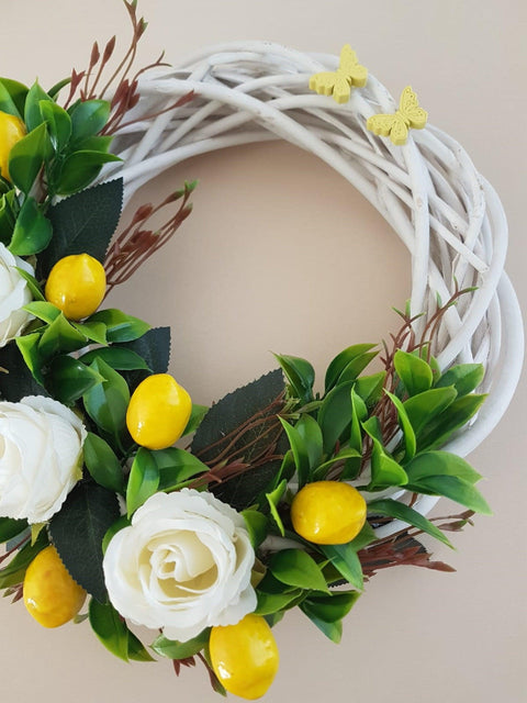 • Includes wicker round frame, artificial yellow lemon and white roses, artificial greenery, artificial wooden butterflies as seen in the pictures.