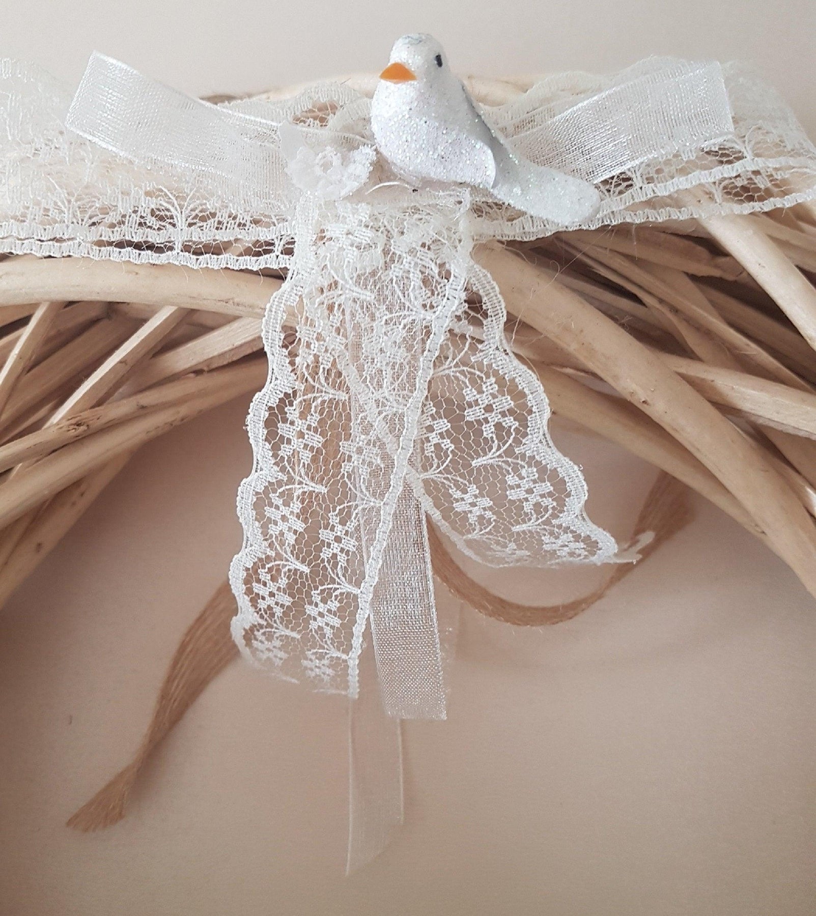 This personalized faux flower year round door/wall sign with lace and artificial pigeon;