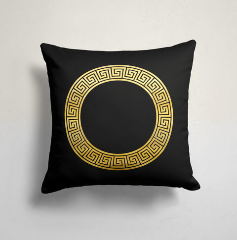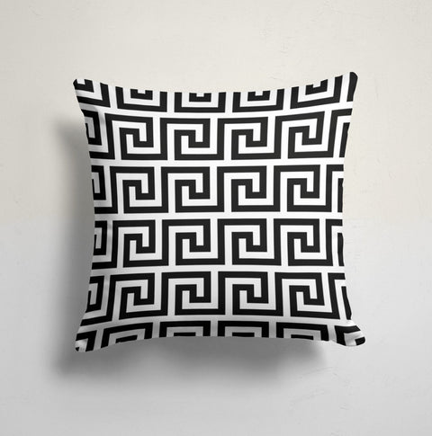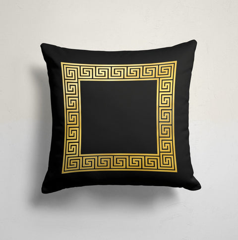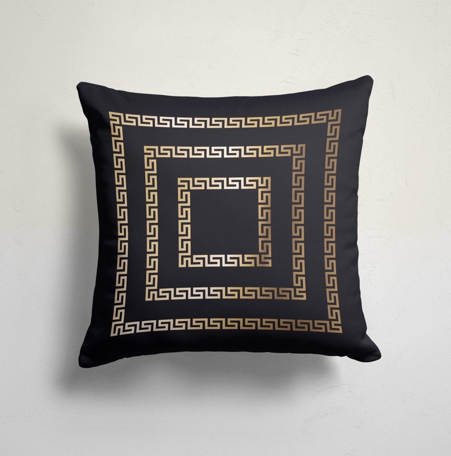 These elegant square decorative throw pillow covers with black, white, gold colored Greek Key patterns;
