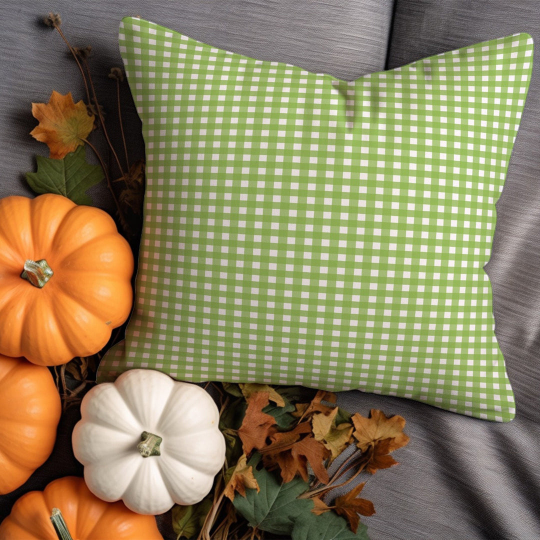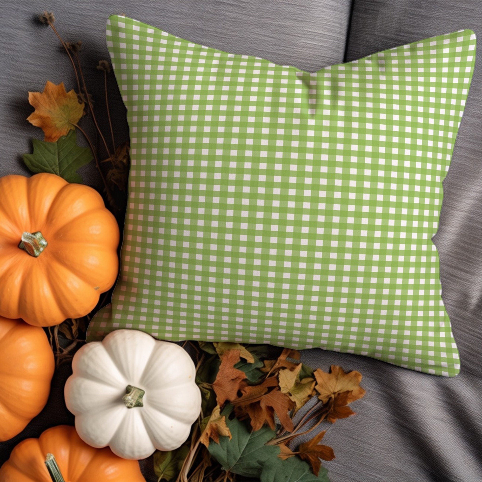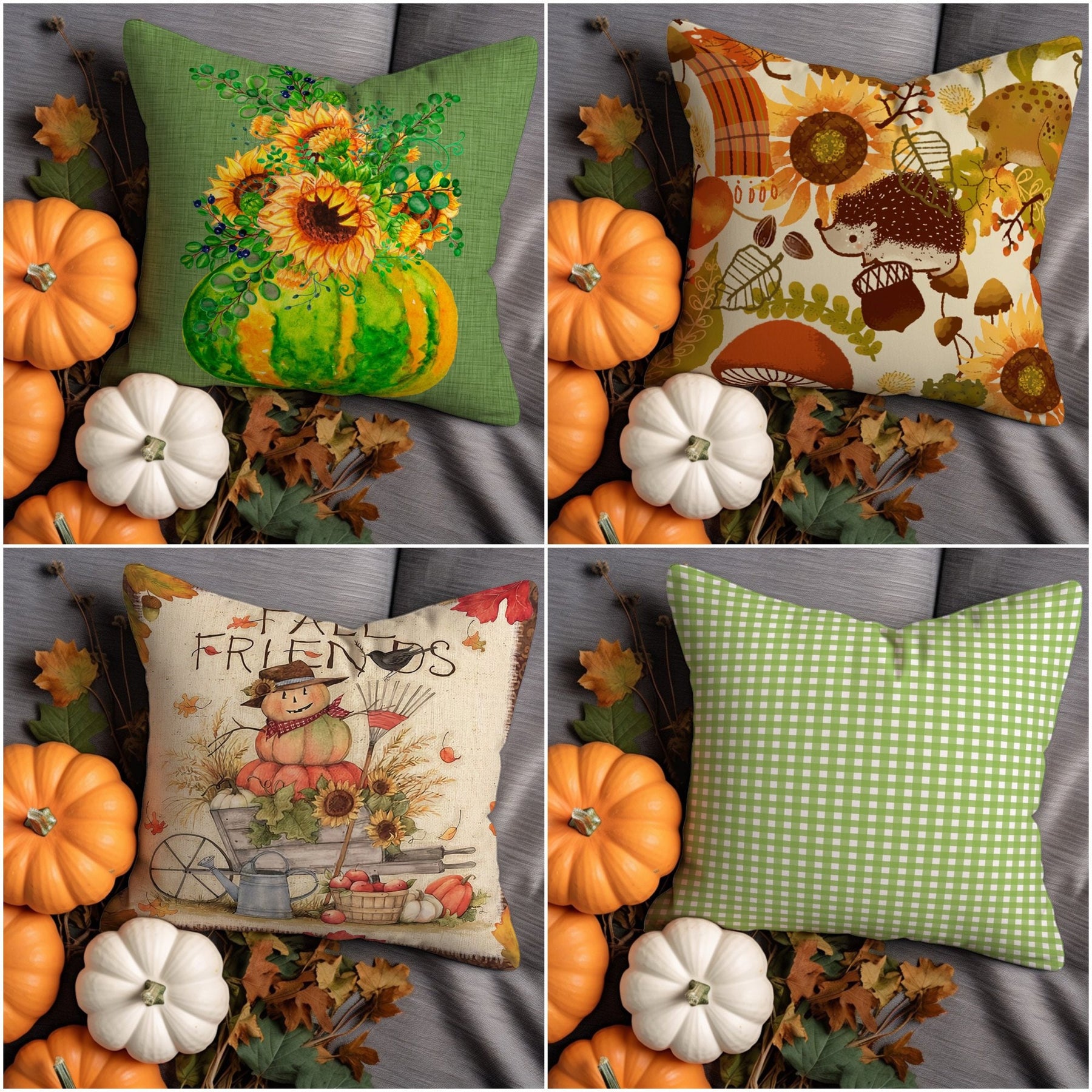 These elegant square decorative throw pillow covers with green pumpkin, gingham pattern, acorn, hedgehog, fall friends, sunflower and plaid pattern print;
