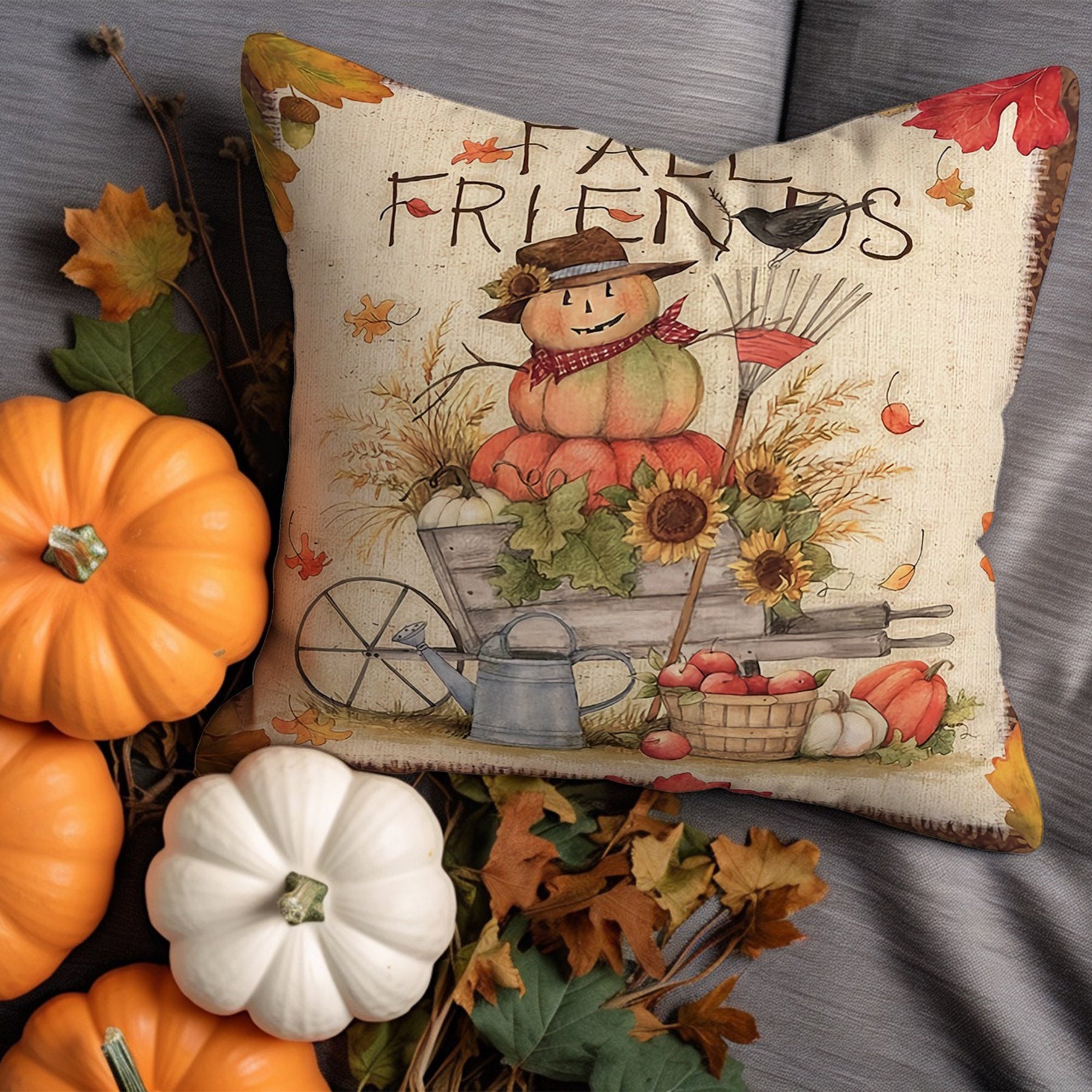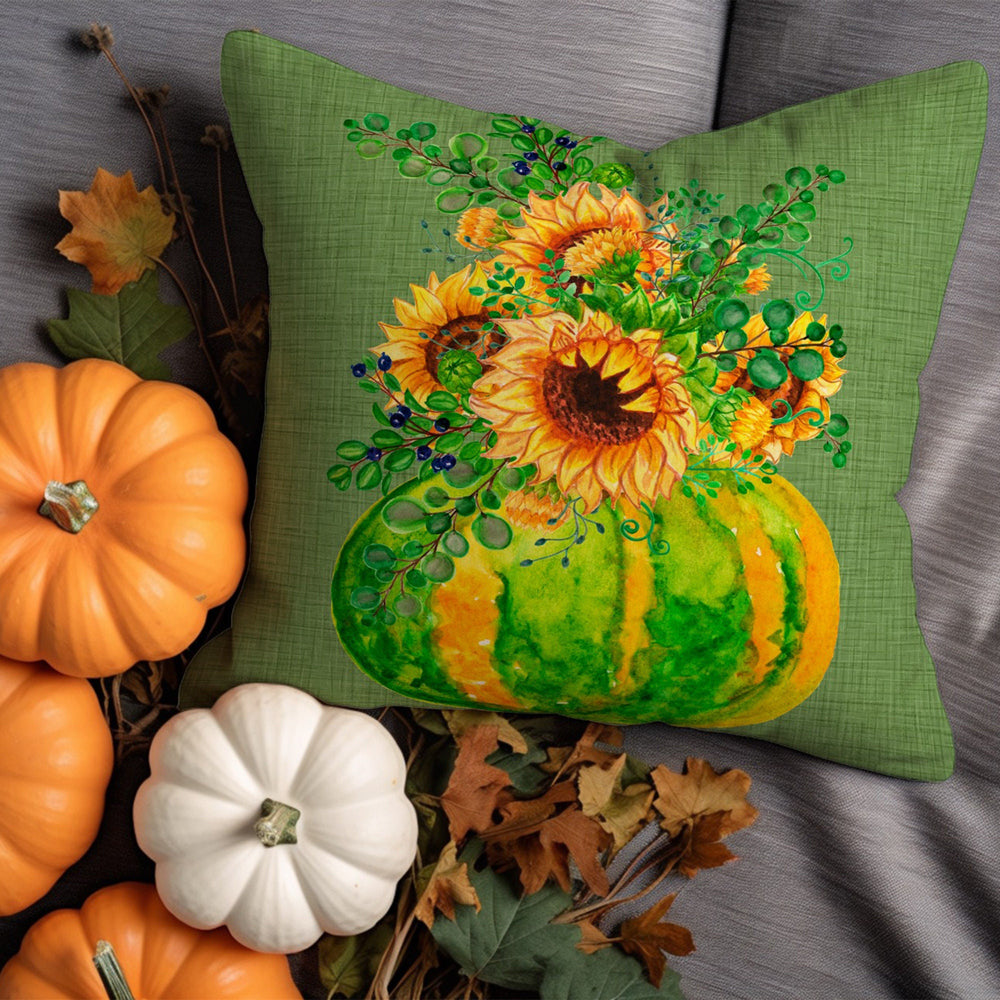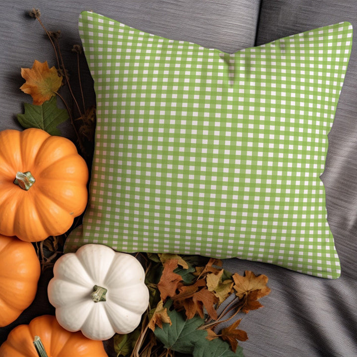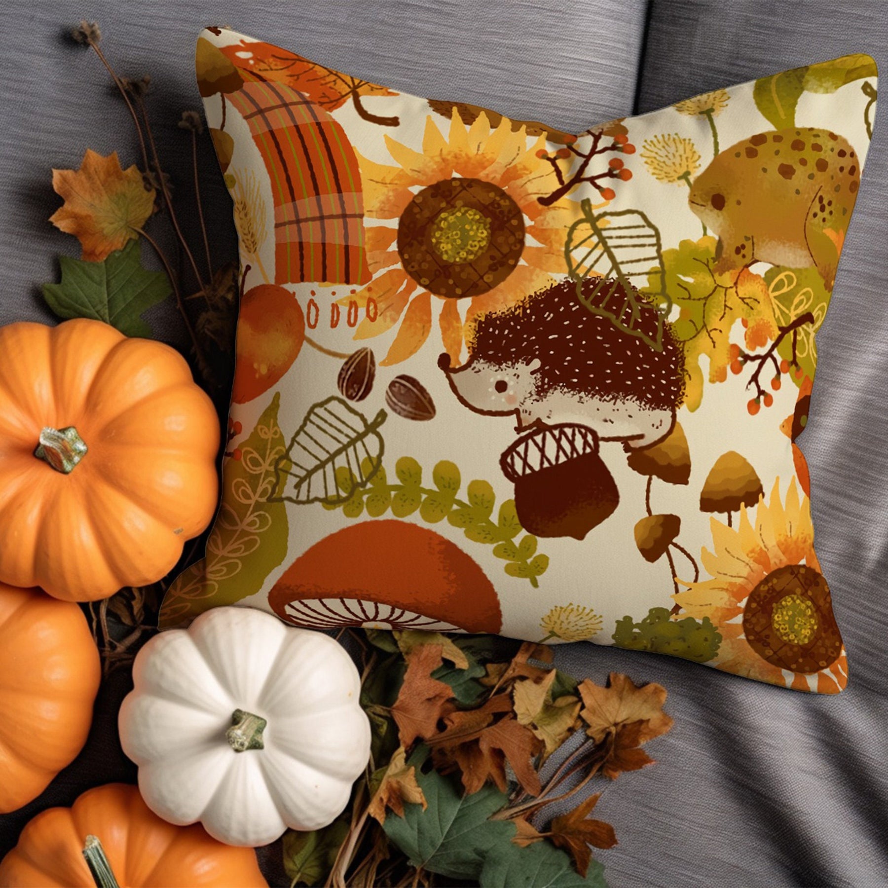 These elegant square decorative throw pillow covers with green pumpkin, gingham pattern, acorn, hedgehog, fall friends, sunflower and plaid pattern print;
