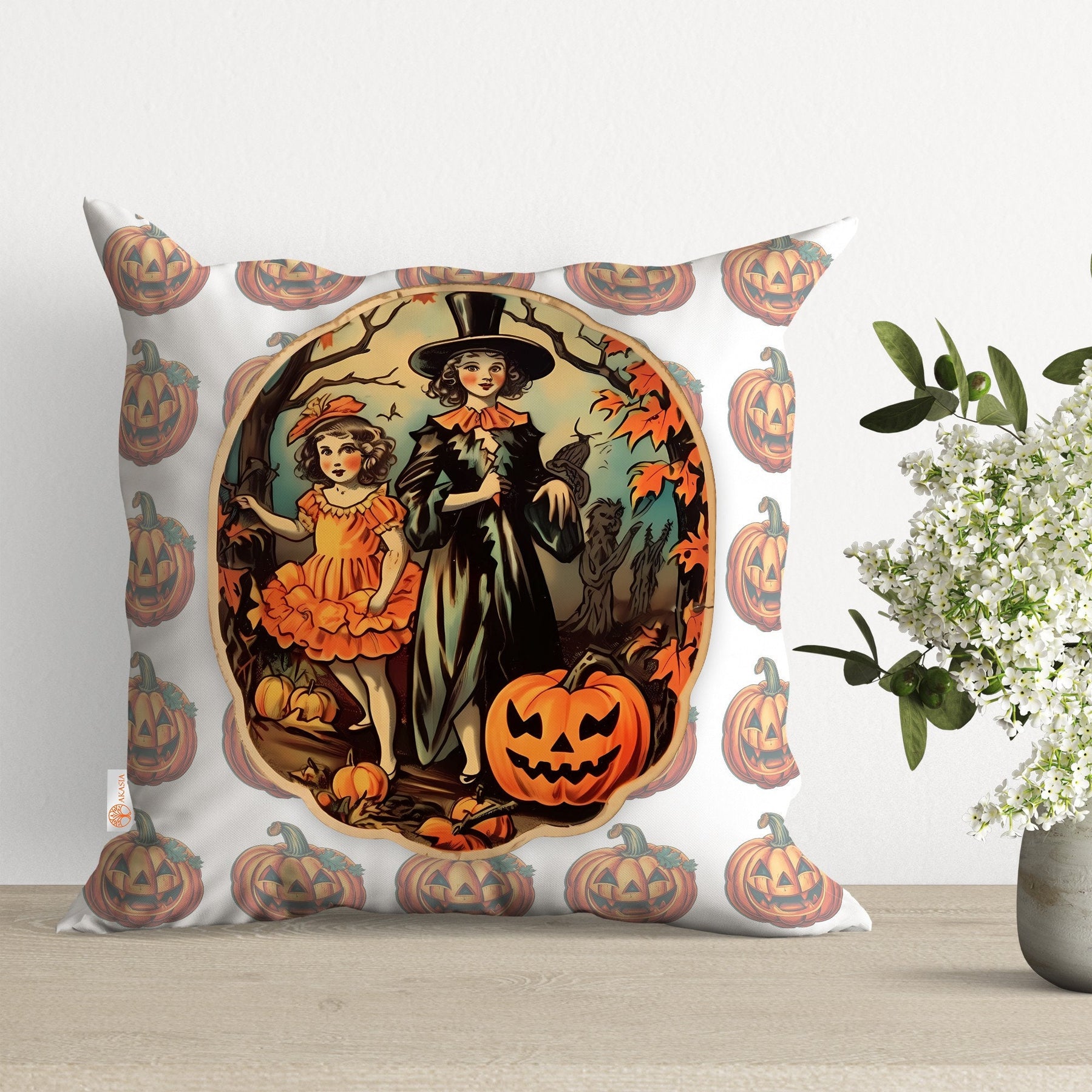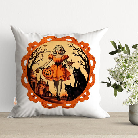 These elegant square decorative farmhouse throw pillow covers with Carved Pumpkin, Pretty Girl and Black Cat print;