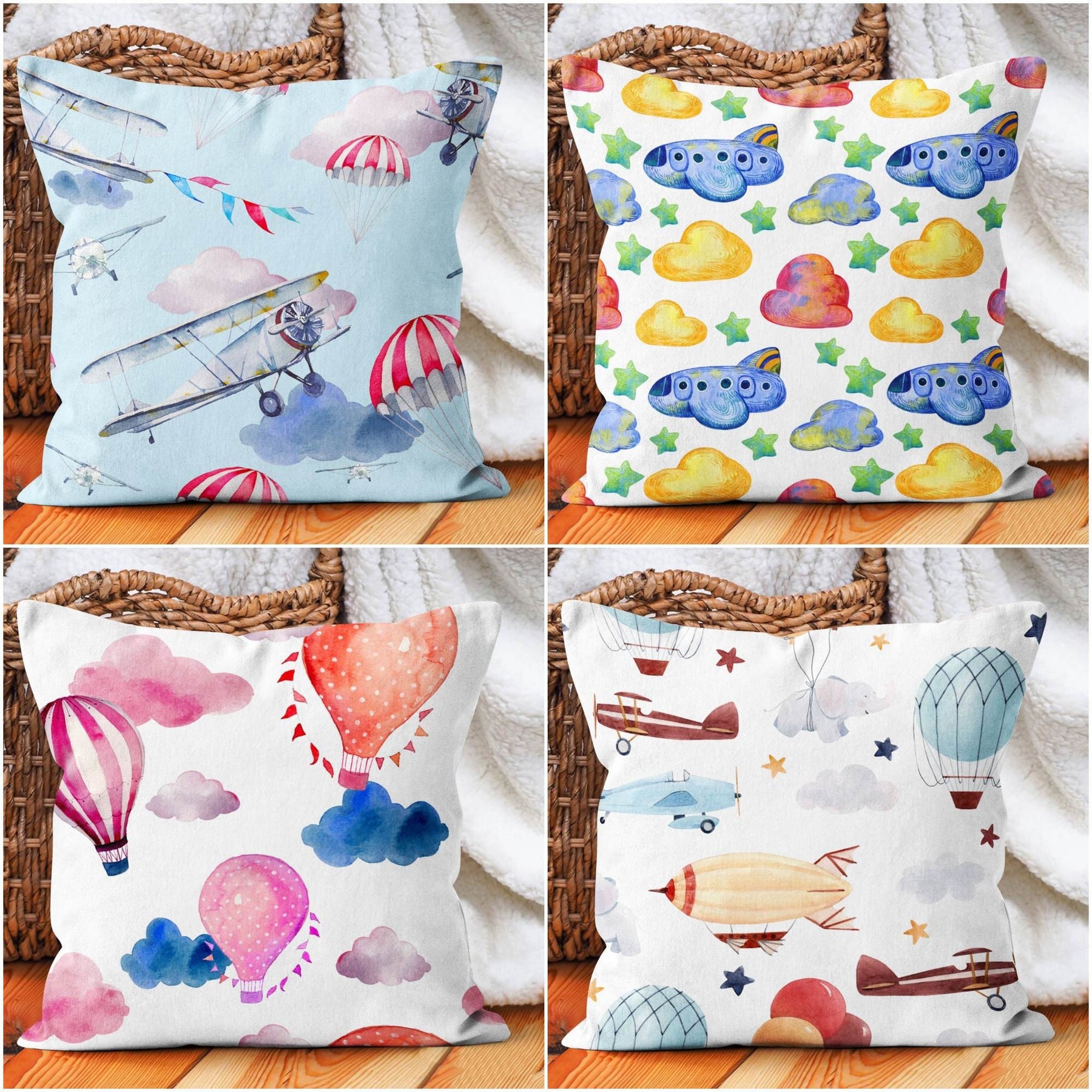 These elegant square decorative farmhouse throw pillow tops/covers with plane, balloon, cloud;