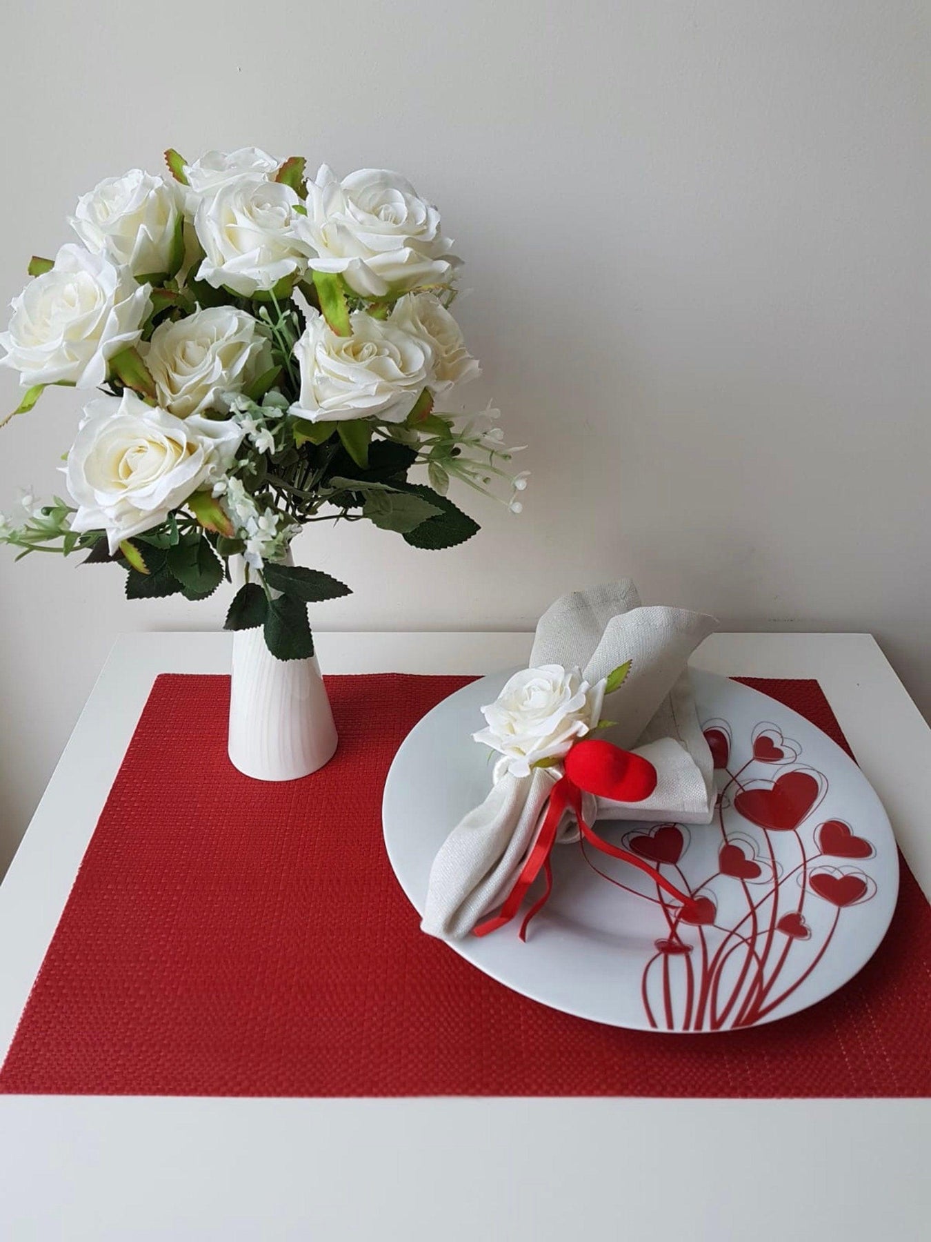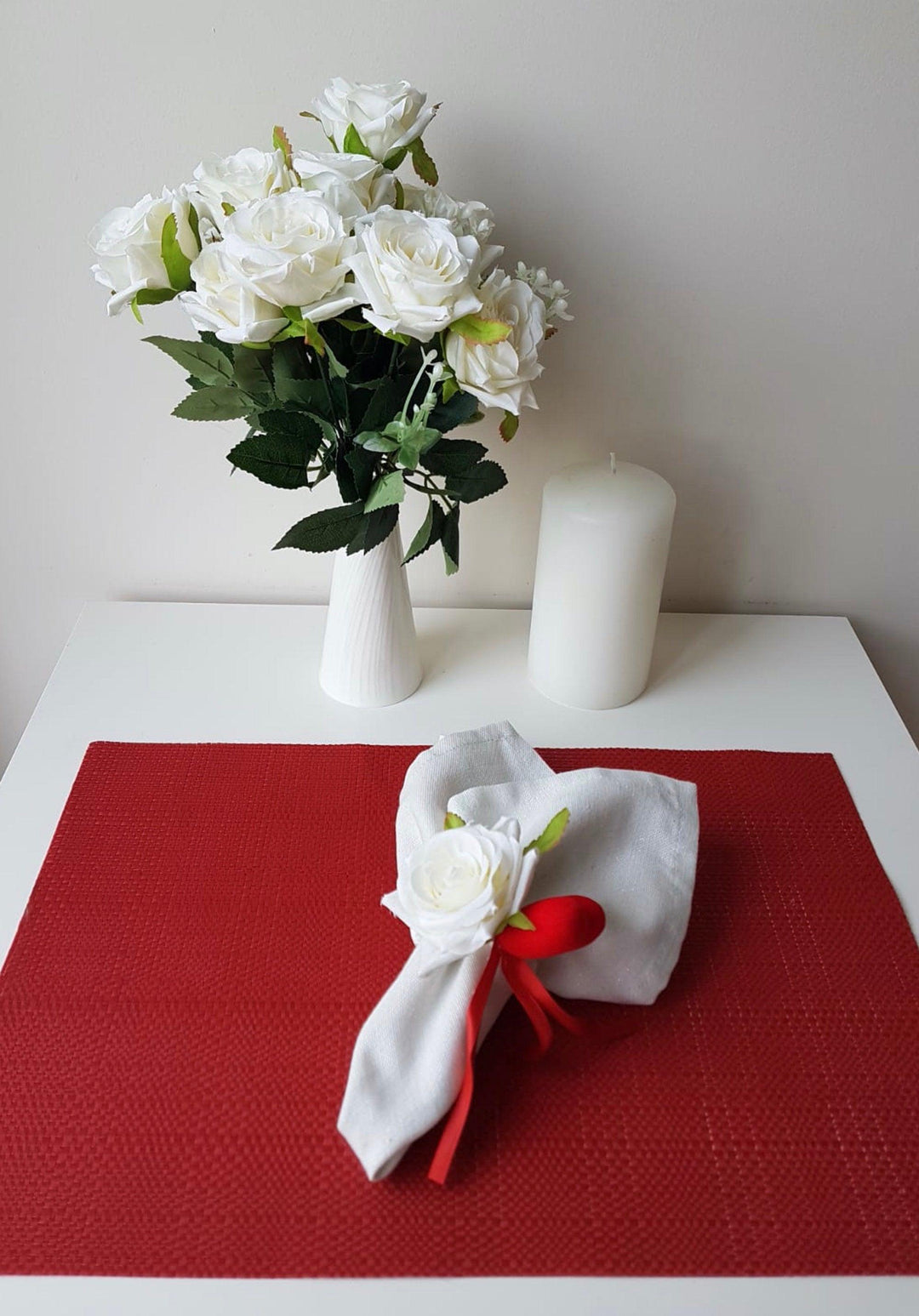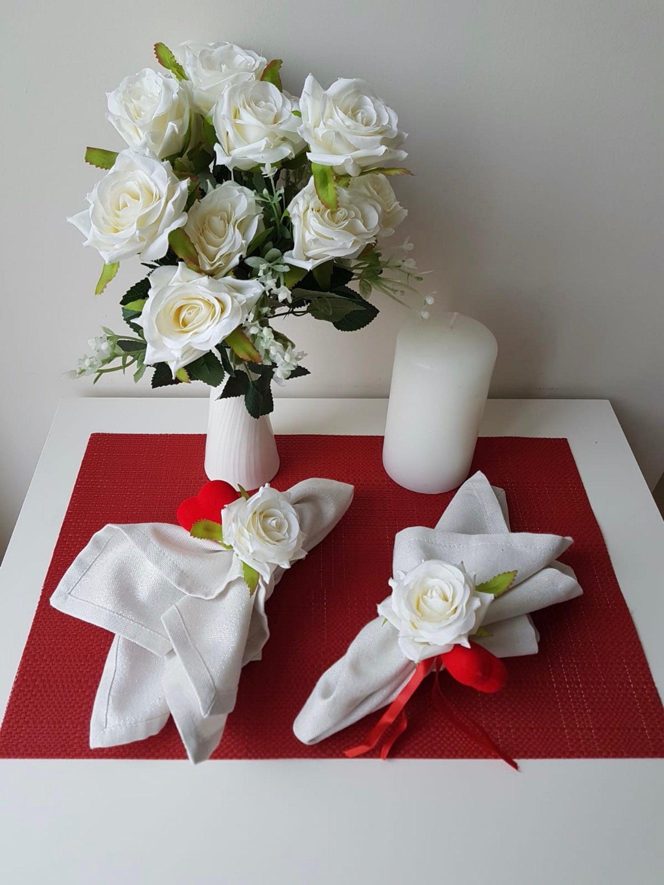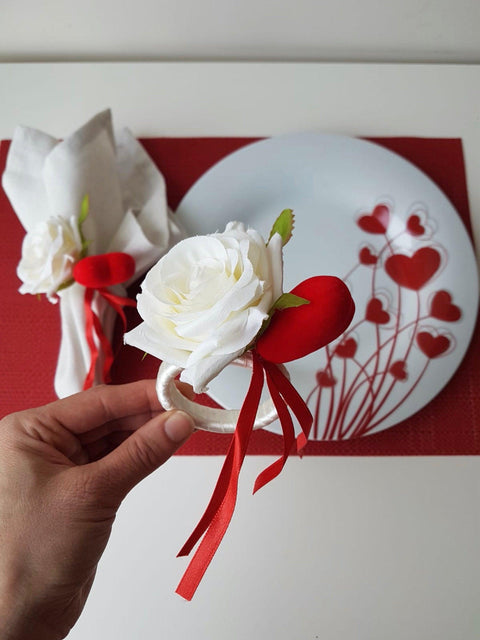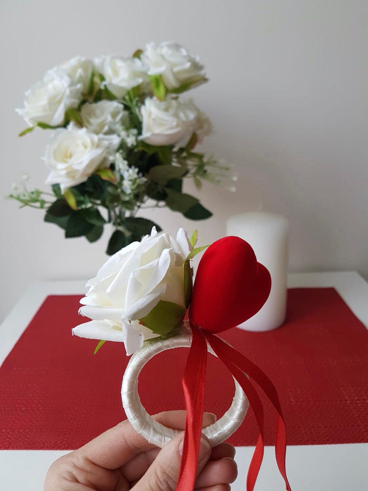 • Made of artificial white rose, red styrofoam heart with ribbon and plastic ring surrounded with white ribbon