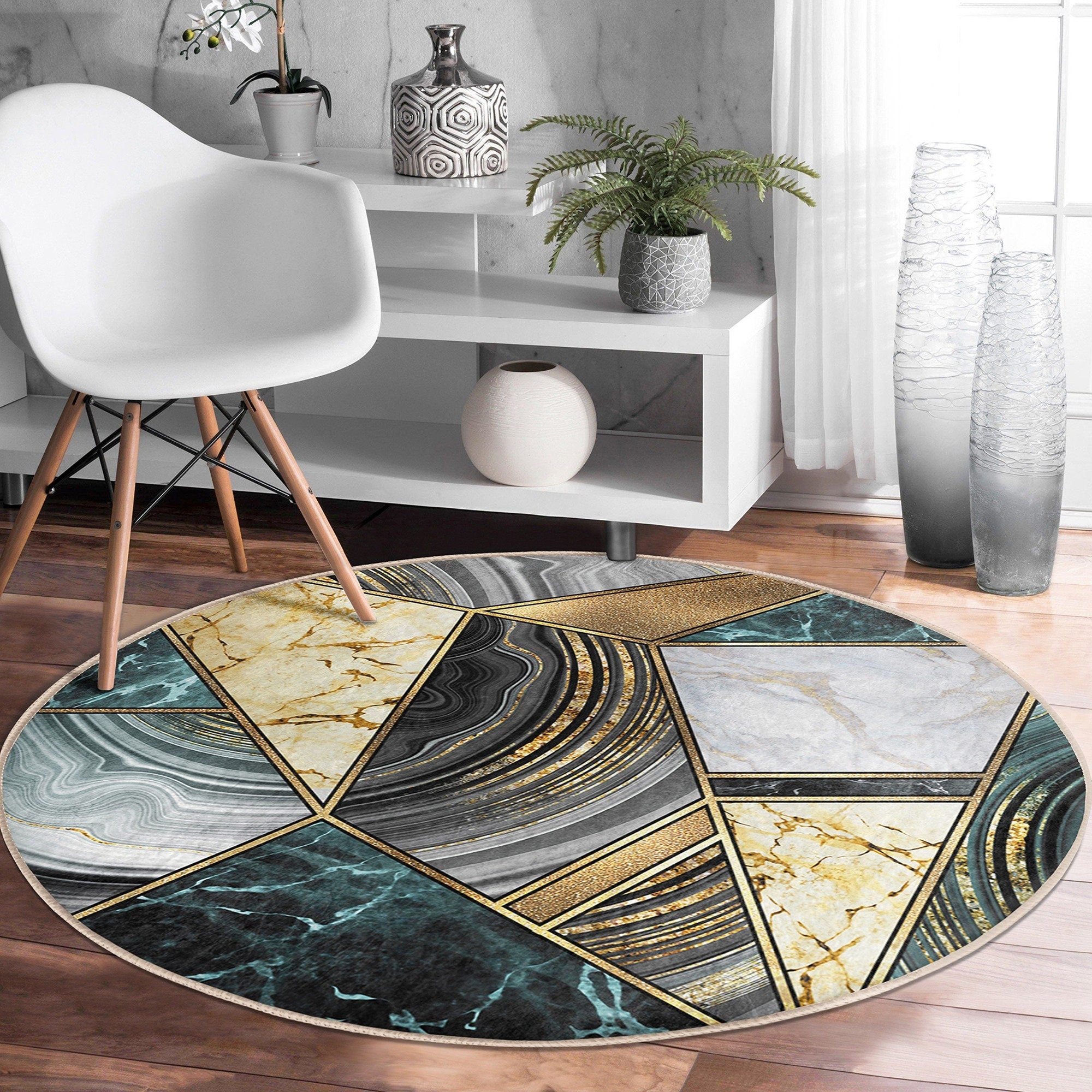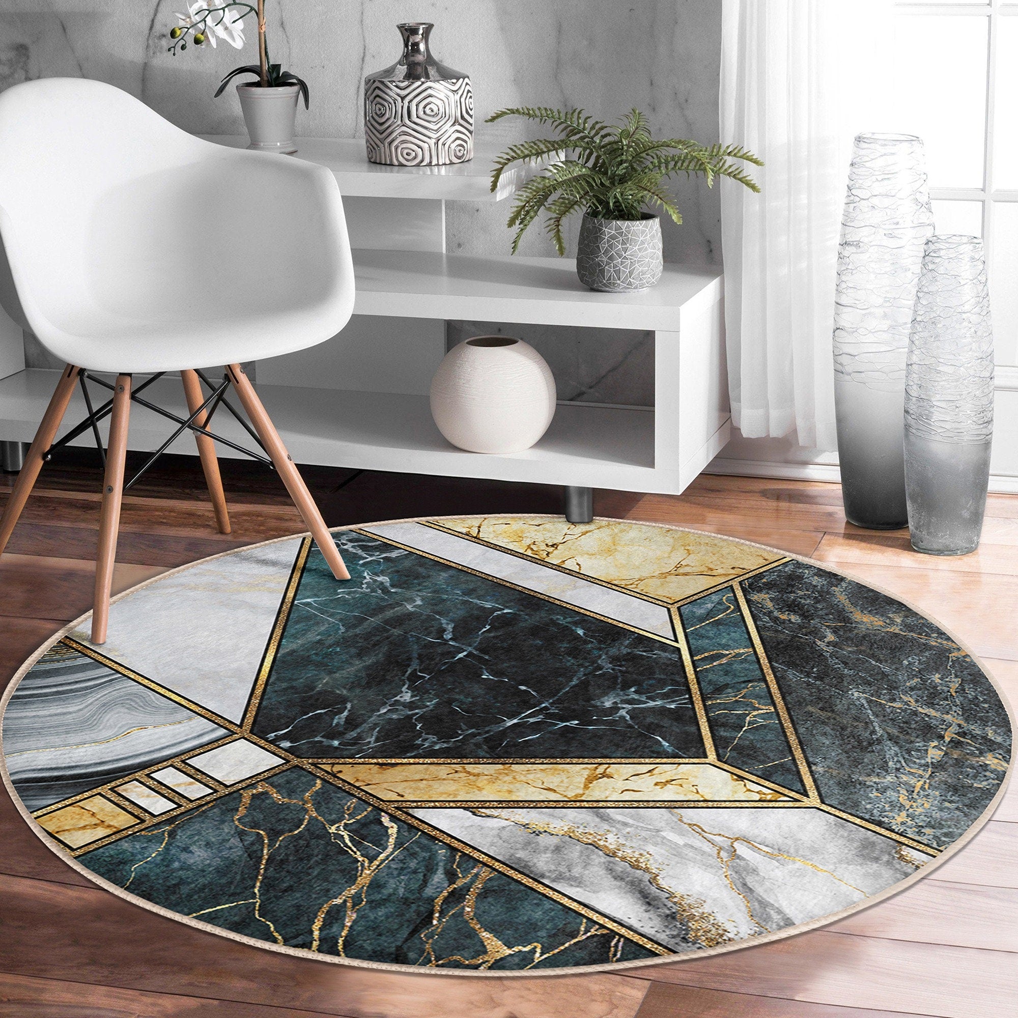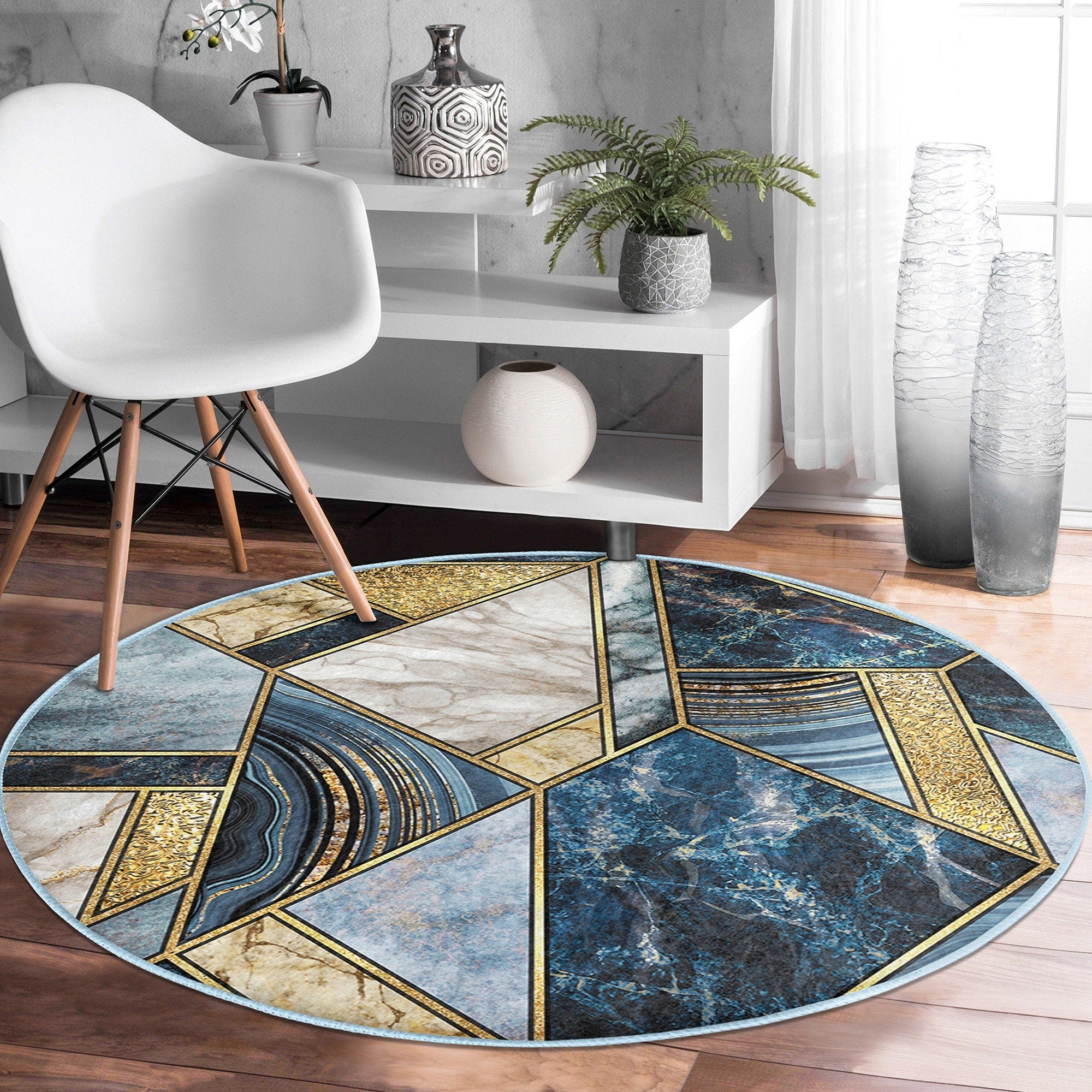 Marble Pattern Round Rug|Non-Slip Round Carpet|Blue Gold Gray Circle Carpet|Decorative Abstract Multi-Purpose Area Rug|Modern Home Decor