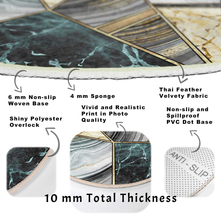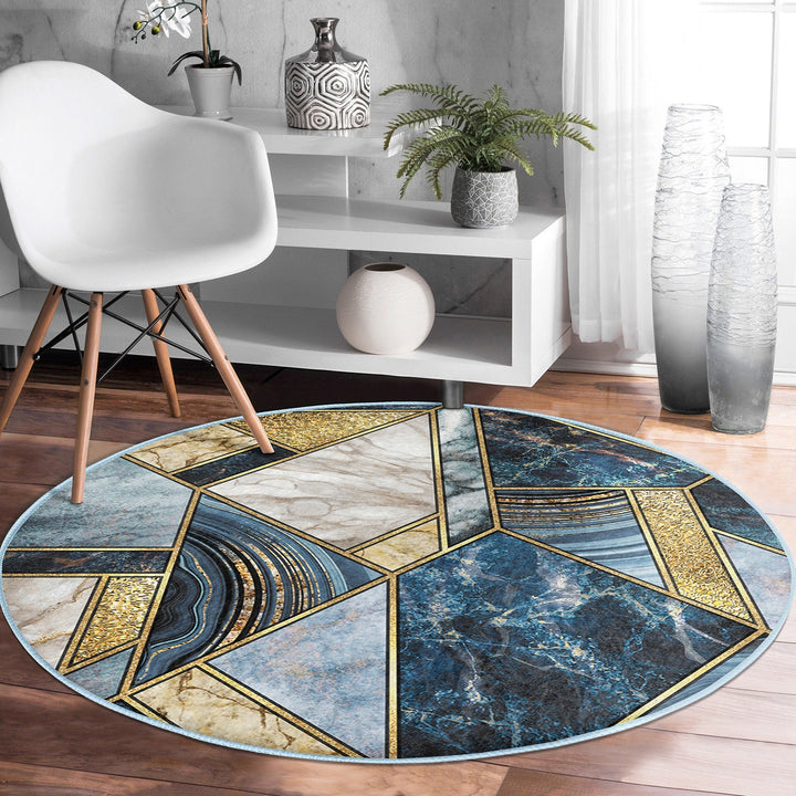 These elegant round floor rugs with Blue Gold Gray Marble Pattern;