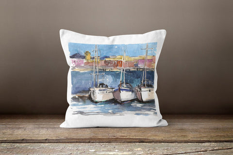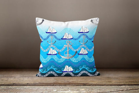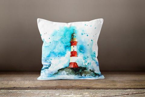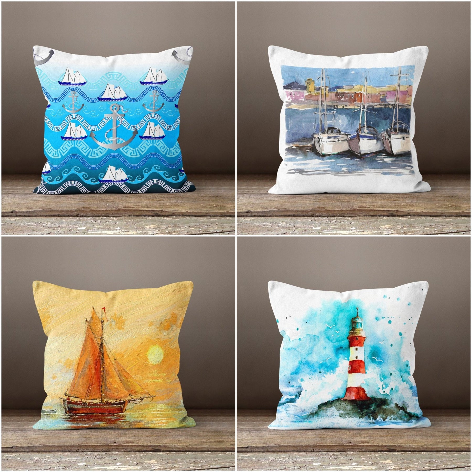 These decorative beach house throw pillow covers with lighthouse, anchor and ship;