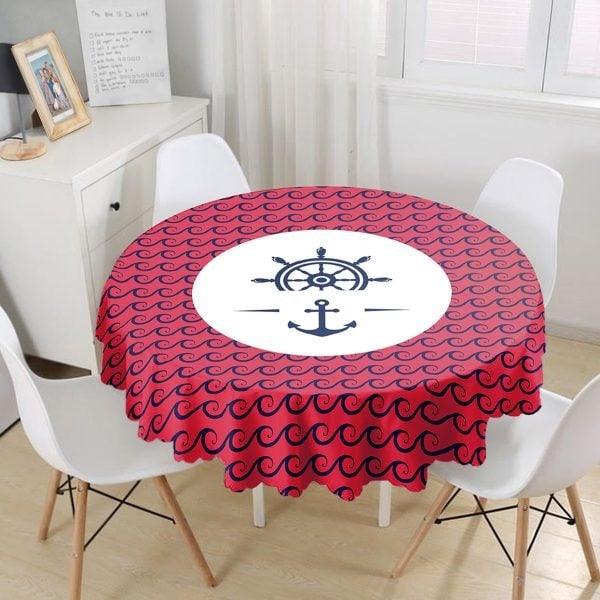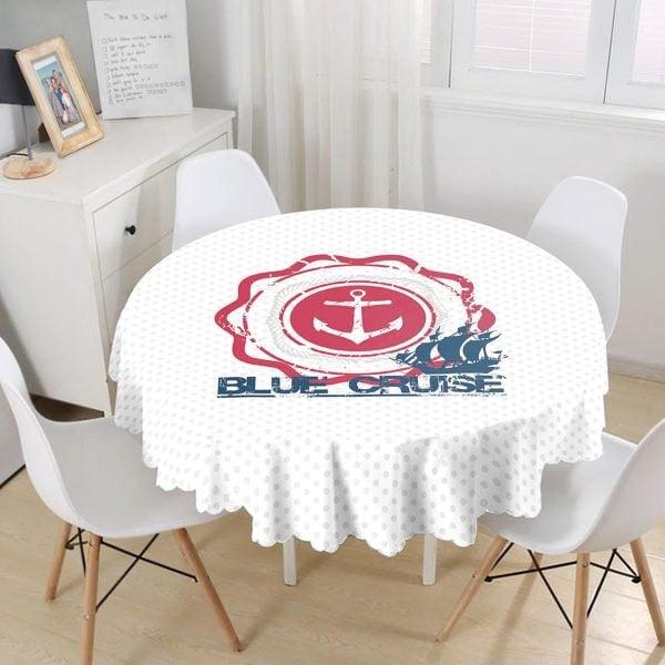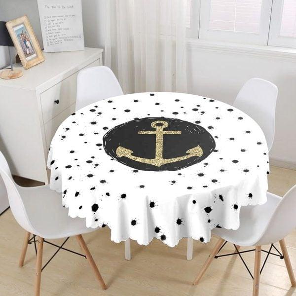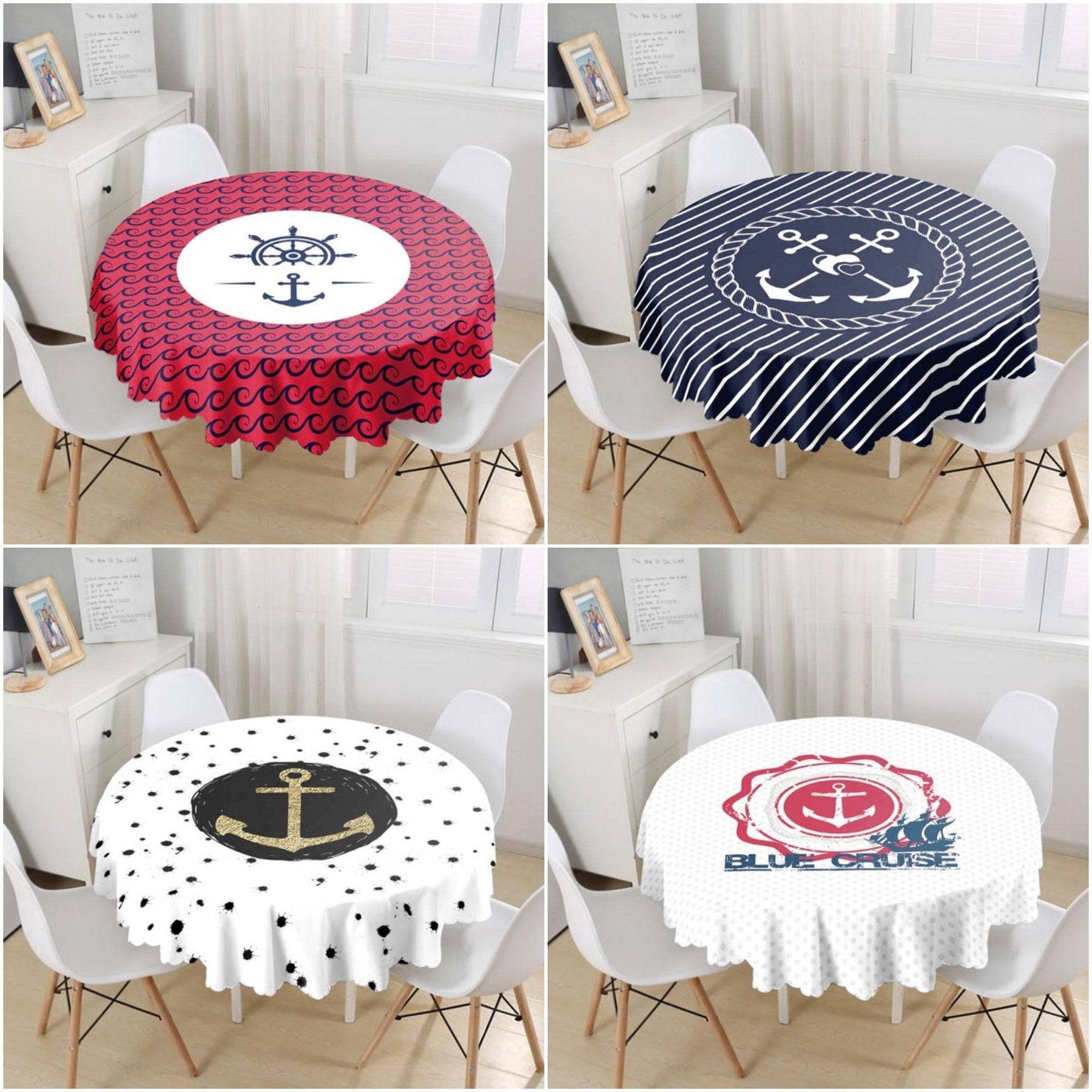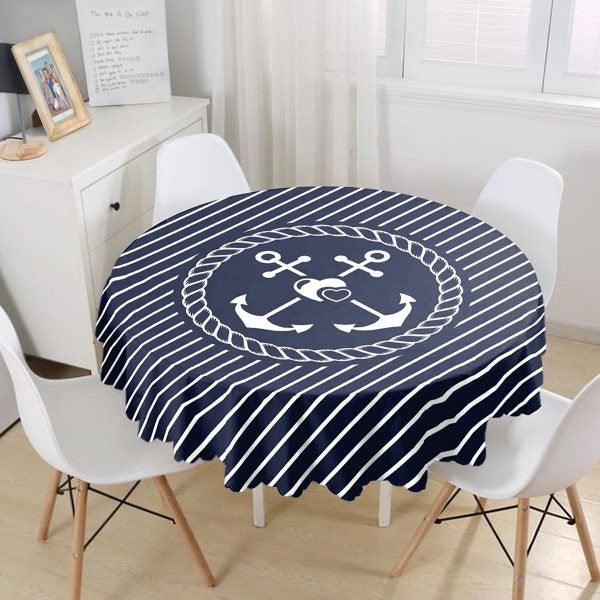 This high quality beach house style round tablecloth with blue navy whee, blue white gold navy anchor with striped/dotted design, blue cruise print;