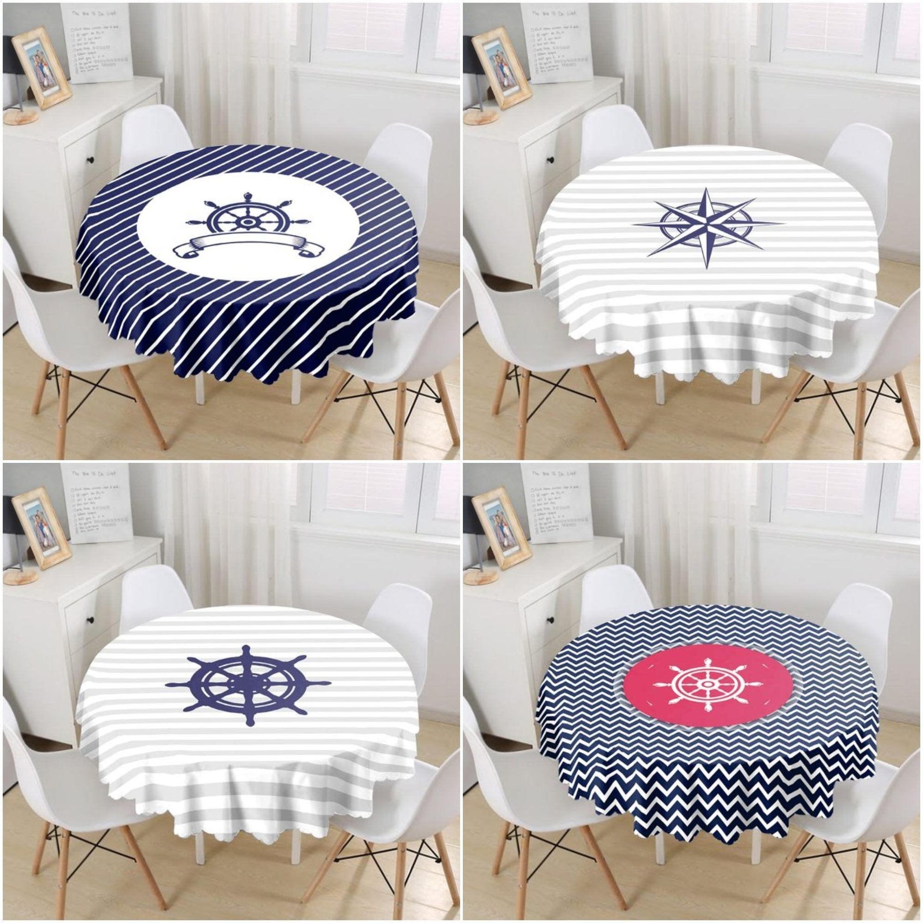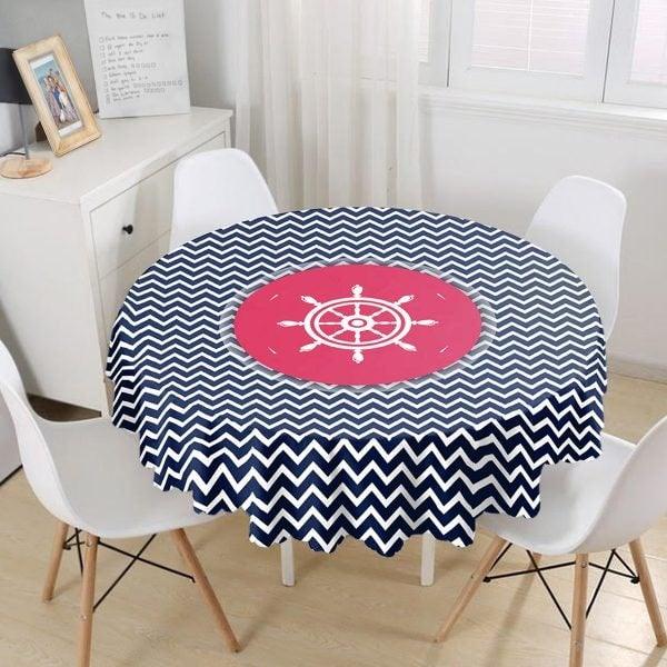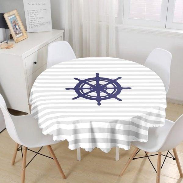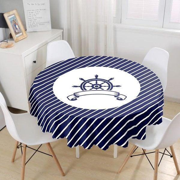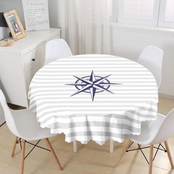 This high quality beach house style round tablecloth with navy wheel and navy compass with zigzag and striped design;