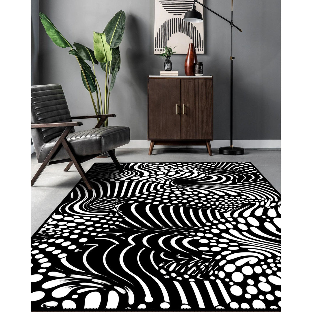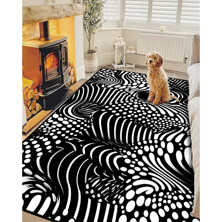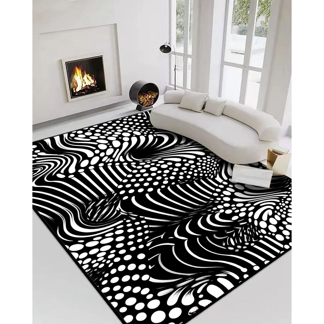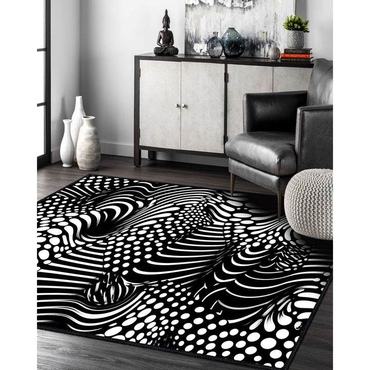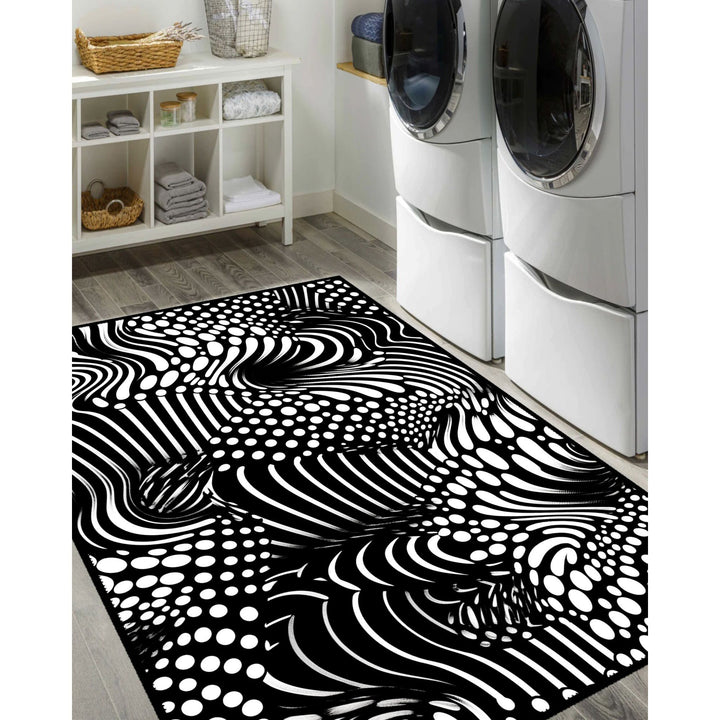 This elegant Machine-Washable floor rug with black white Optic Illusion design;