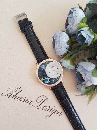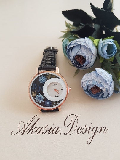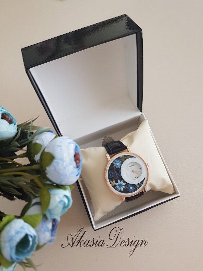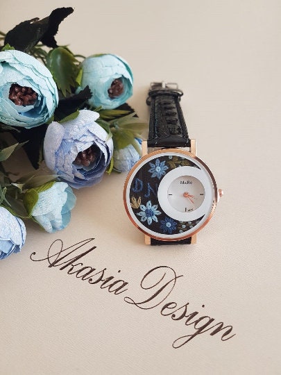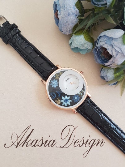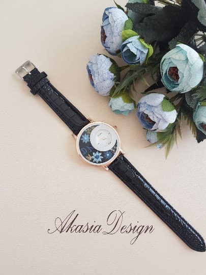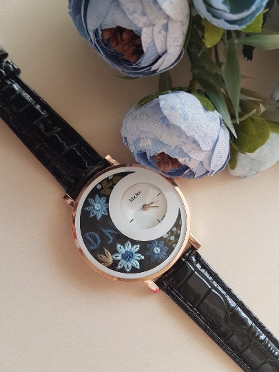 Imagine this pretty "Personalized Blue Daisy Embroidered Black Wrist Watch" on you/lovely friend/mother which is made with love and passion!