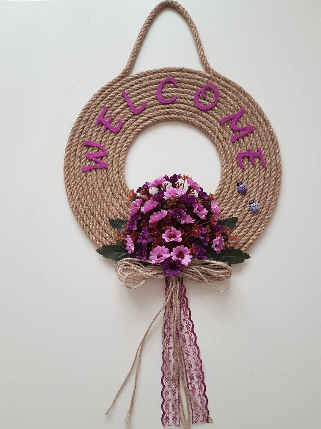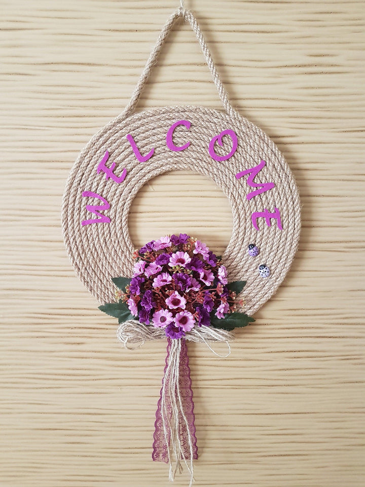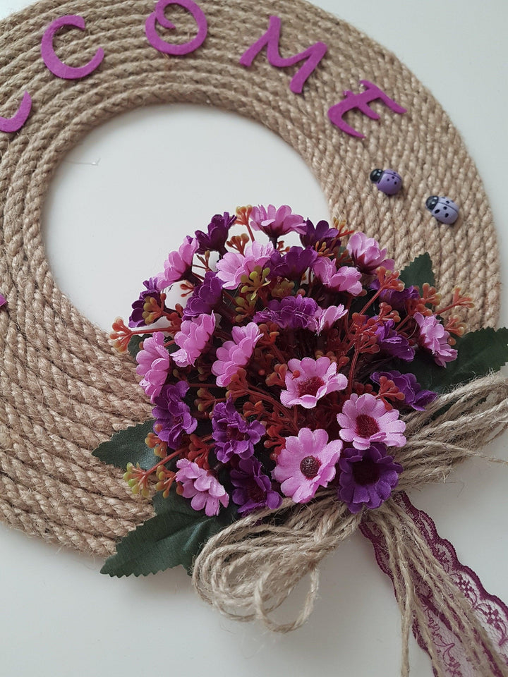 It includes jute rope frame, artificial purple daisy , leafage in tones of green, lace and artificial purple ladybugs as seen in the pictures.