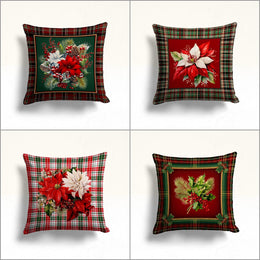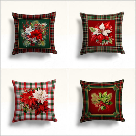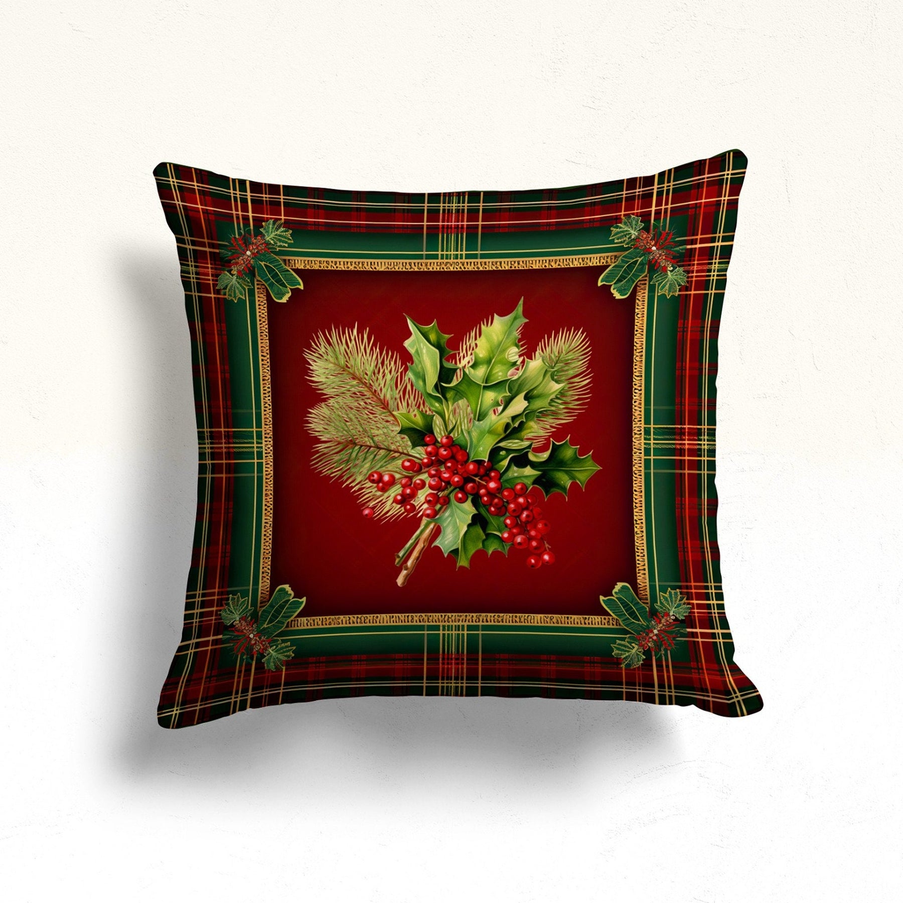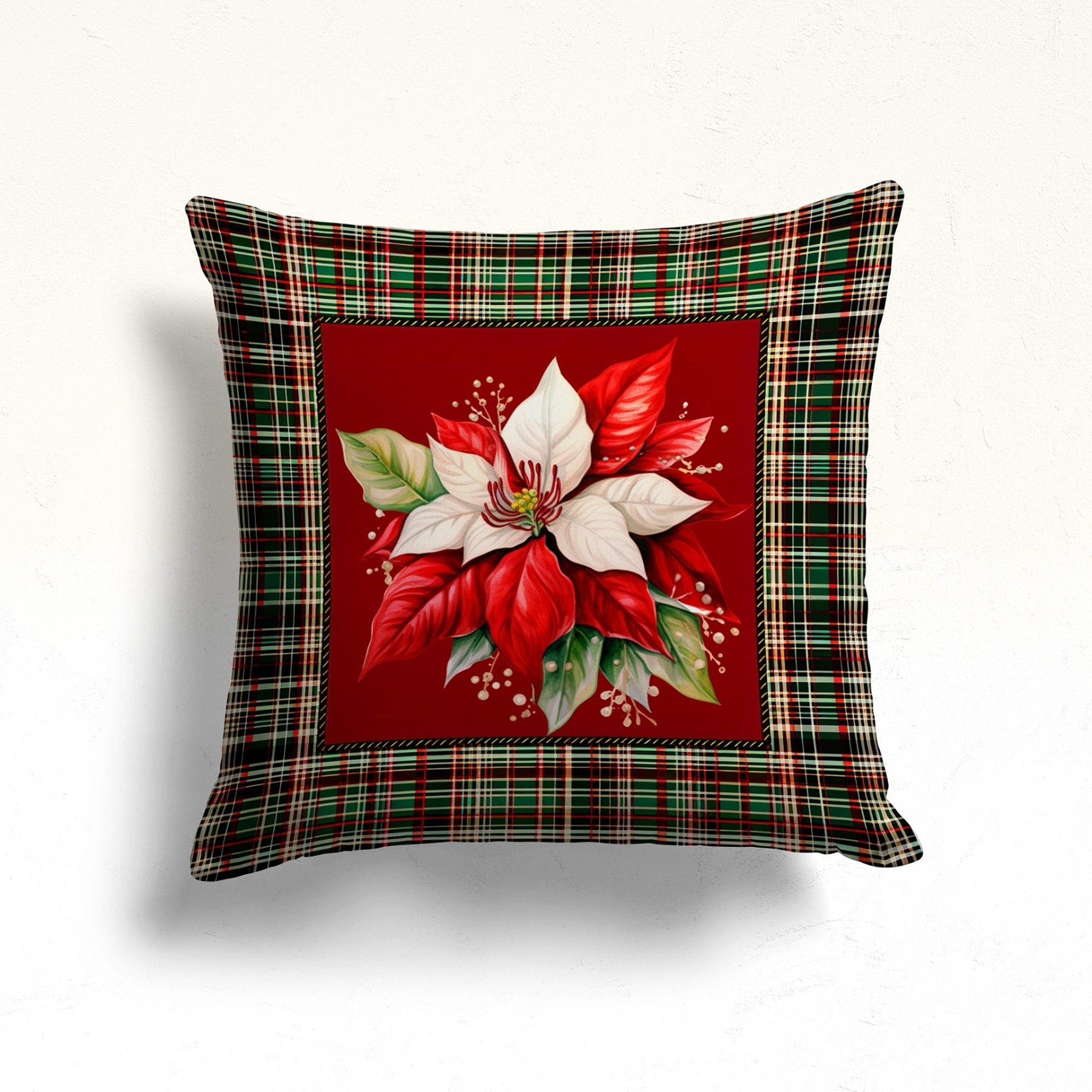 These elegant square decorative throw pillow covers with red berry, plaid, pine cone, red poinsettia, white poinsettia print;