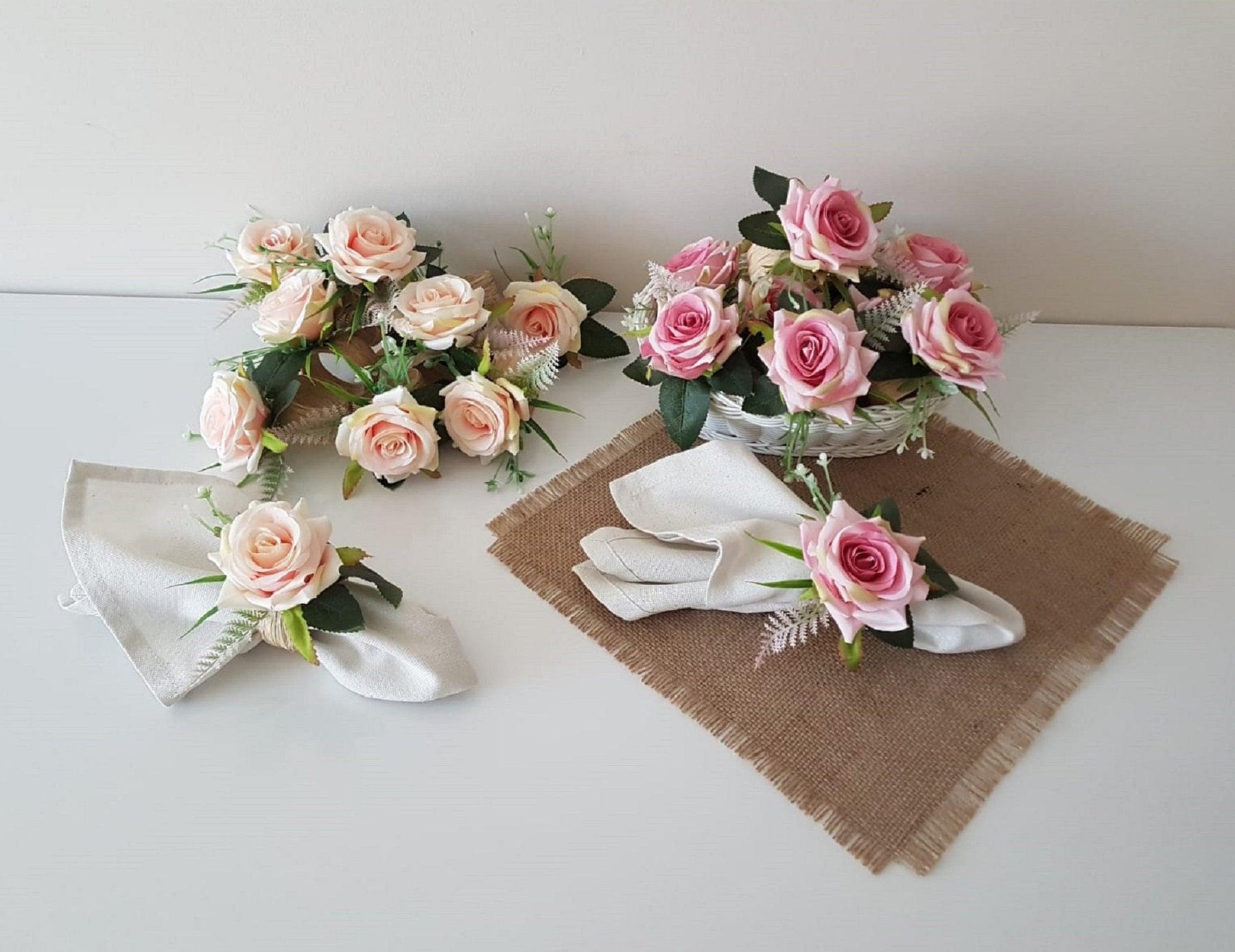 • Made of artificial roses of pink and light pink colored, faux greenery (will be sometimes different from photos) and white/natural jute rope