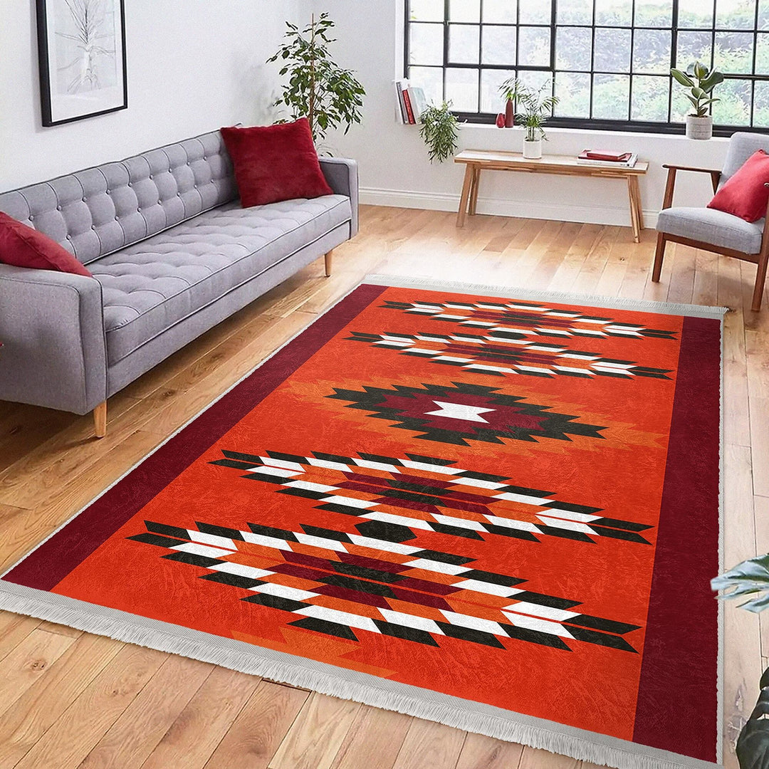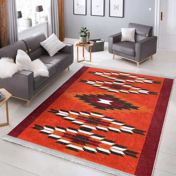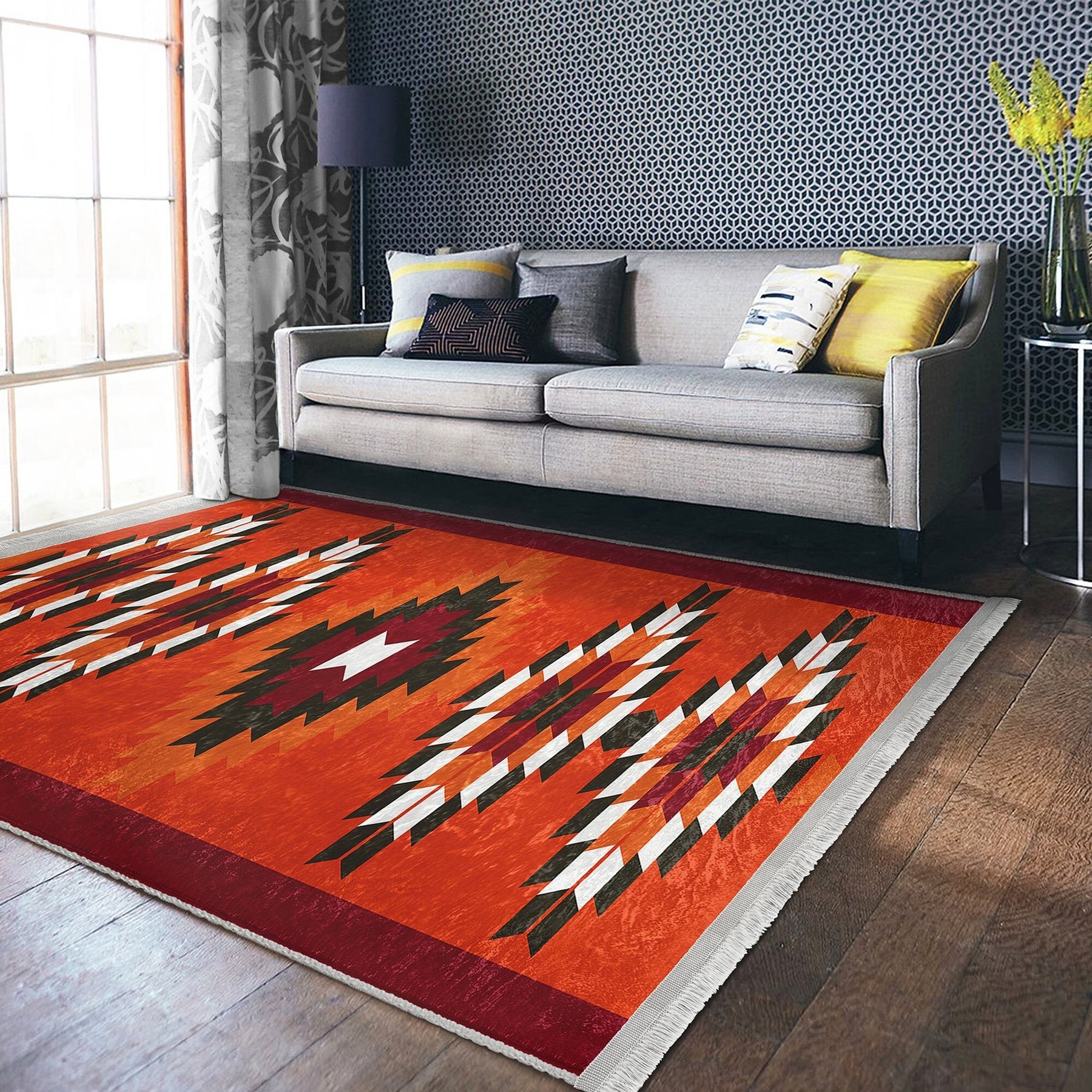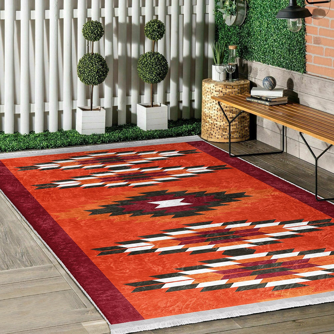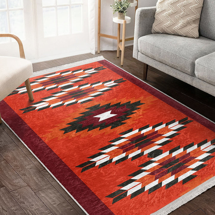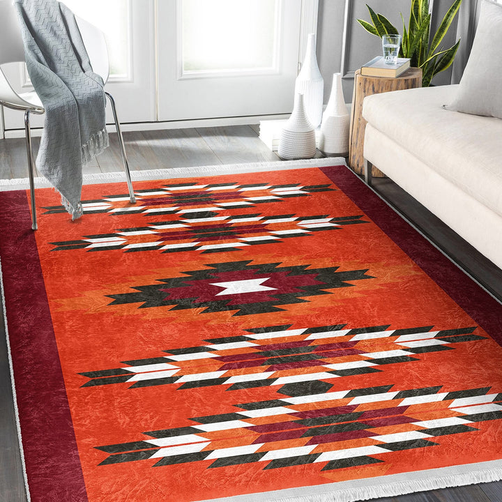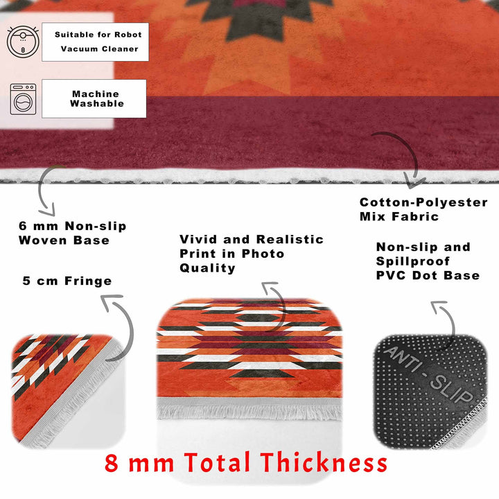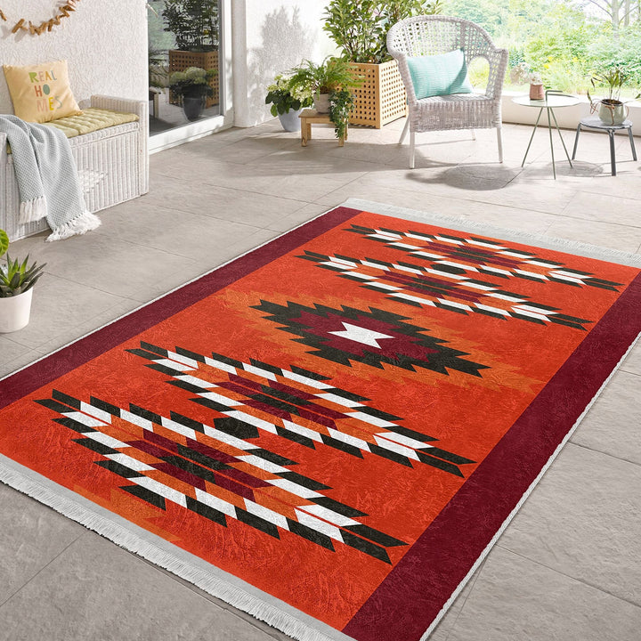 This elegant Machine-Washable floor rug with Terracotta Southwestern Aztec print;