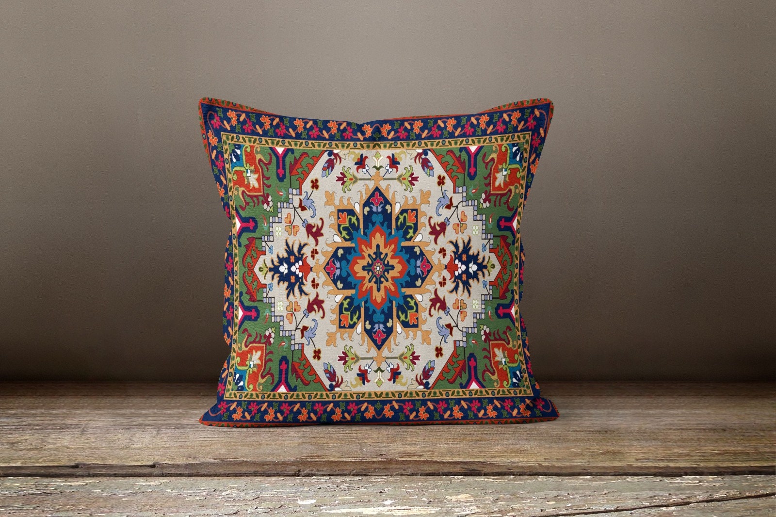 These elegant square decorative farmhouse style ethnic, authentic, worn looking rug throw pillow covers;