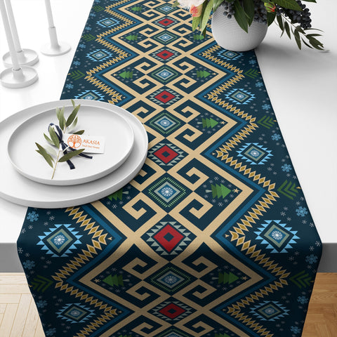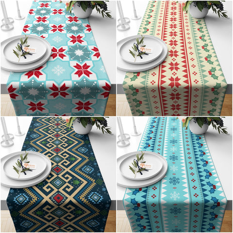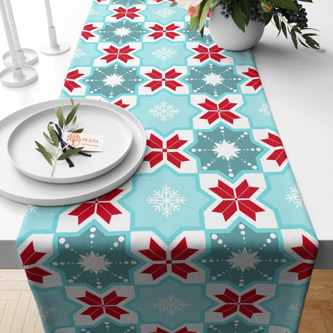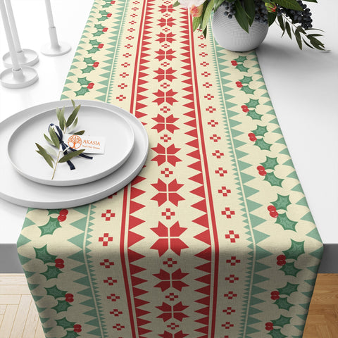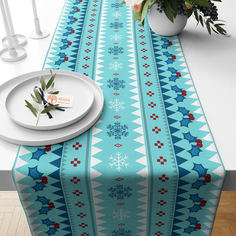 This high quality, farmhouse style table decor with rug design, winter, geometric snowflake and berry print;