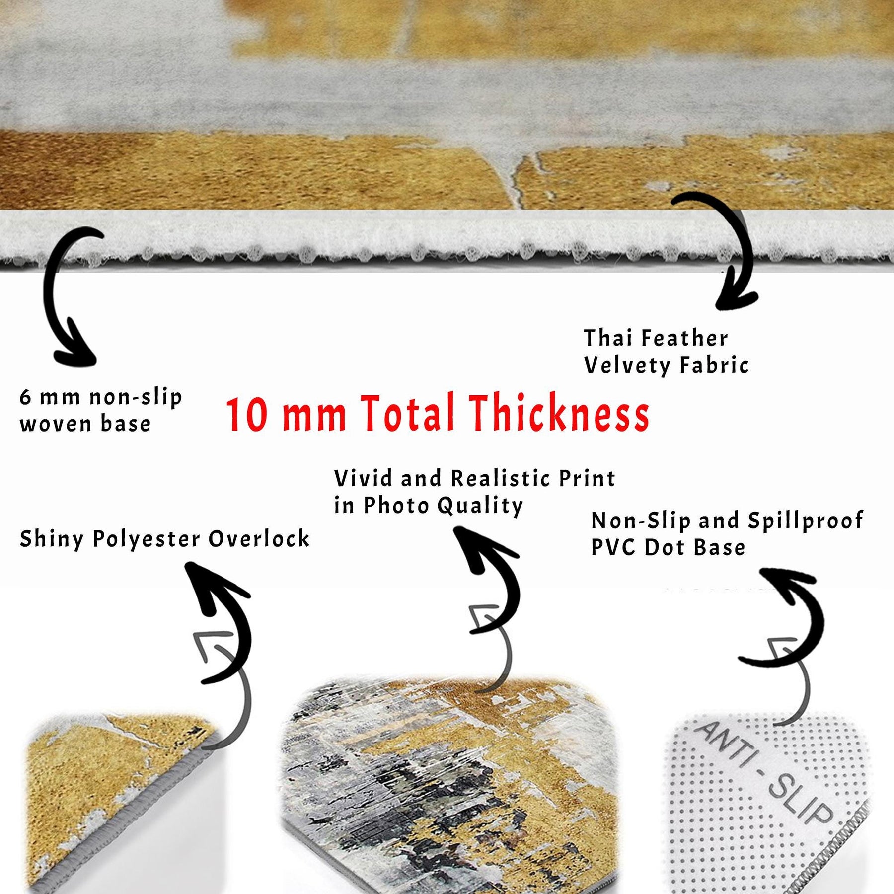 • Have 6 mm non-slip woven base. Total Thickness is 10 mm.