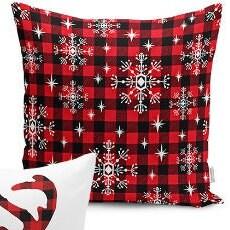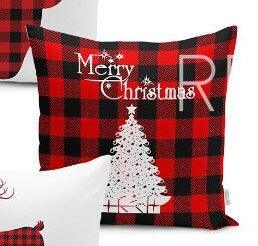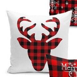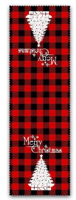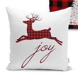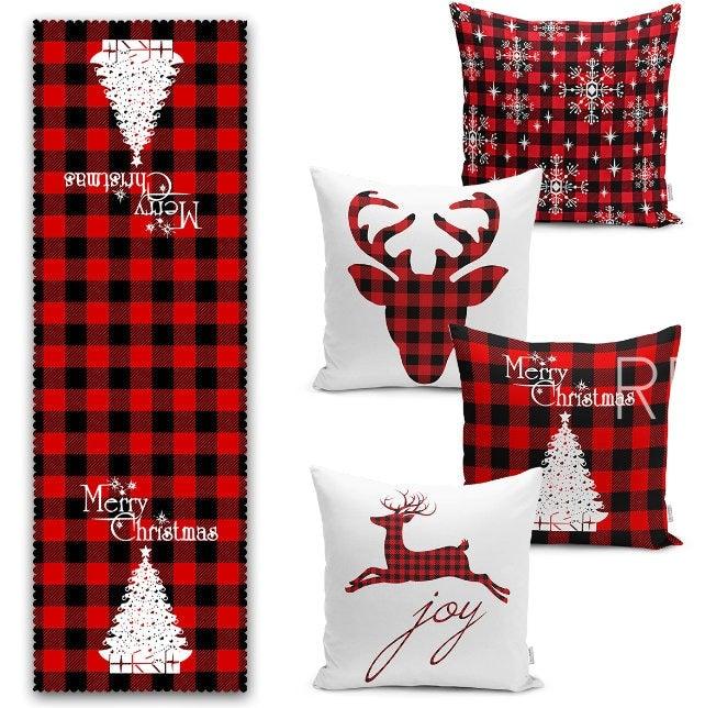 These elegant winter trend pillow covers and table runner set (including 4 pillow covers and 1 runner) with buffalo red black plaid / checkered Xmas deer, Xmas tree, snowflakes, Merry Christmas and Joy print;