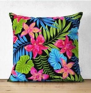 Set of 4 Colorful Floral Pillow Covers|Decorative Pillow Case|Neon Color Leaves and Feathers Pillow|Outdoor Cushion Cover|Throw Pillow Case