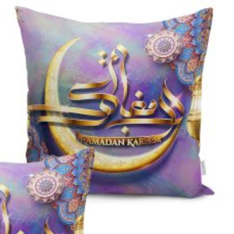 These elegant Ramadan Kareem pillow covers and table runner set (including 4 pillow covers and 1 runner) with Ramadan Kareem print, Crescent and Ramadan Lantern;