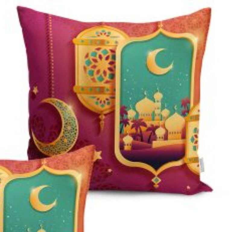 These elegant Islamic pillow covers and table runner set (including 4 pillow covers and 1 runner) with Ramadan Lantern and Crescent;